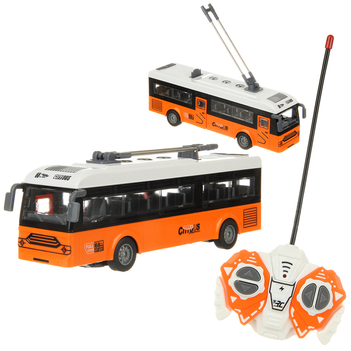 Радиоуправляемая игрушка катается во все стороны, имеет открывающиеся дверки, прорезиненные колеса и поднимающиеся рога.