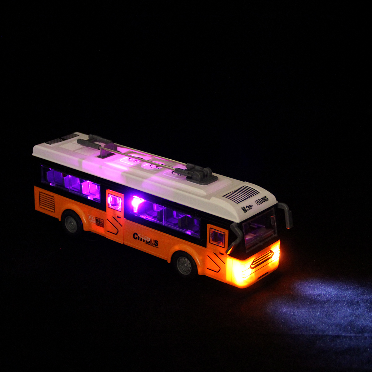 Игрушка троллейбус в красивой расцветке с эффектной подсветкой салона и фар.