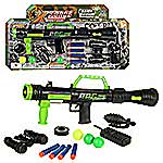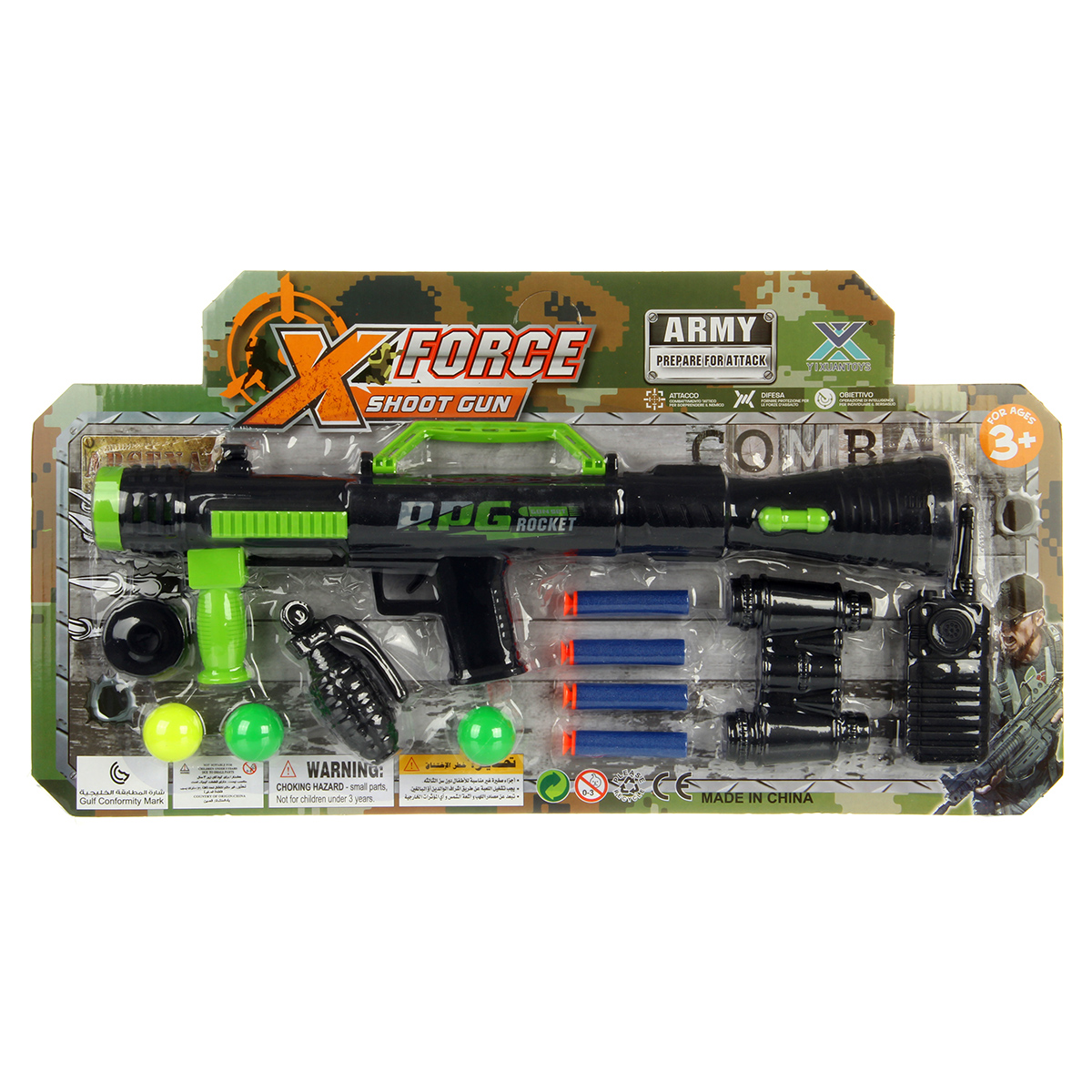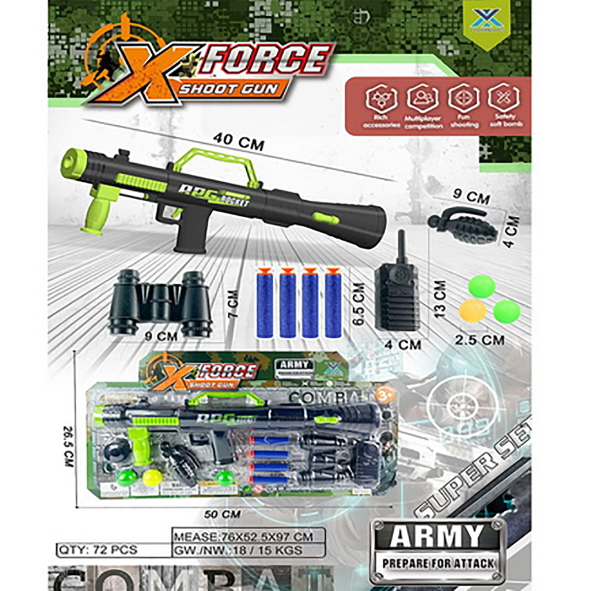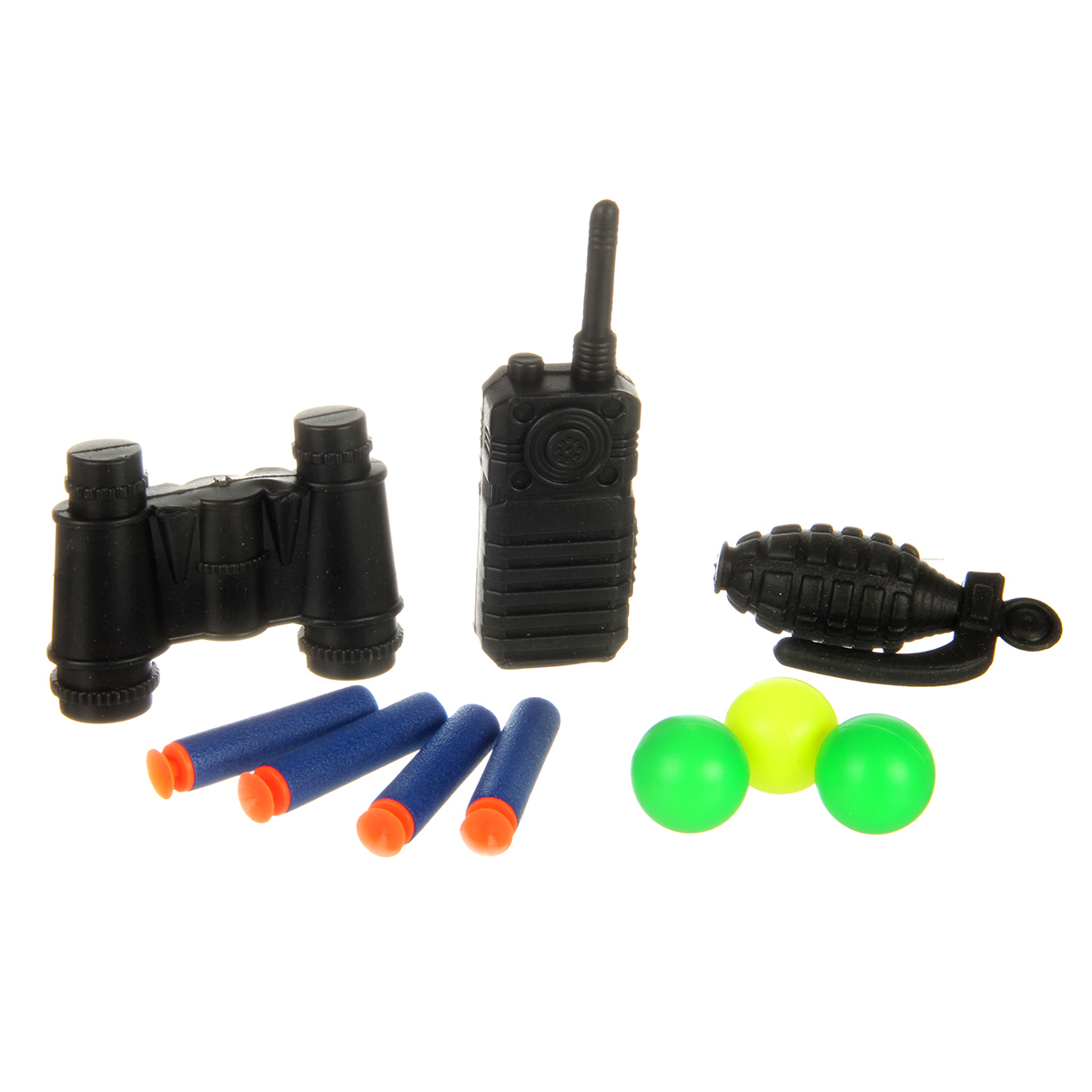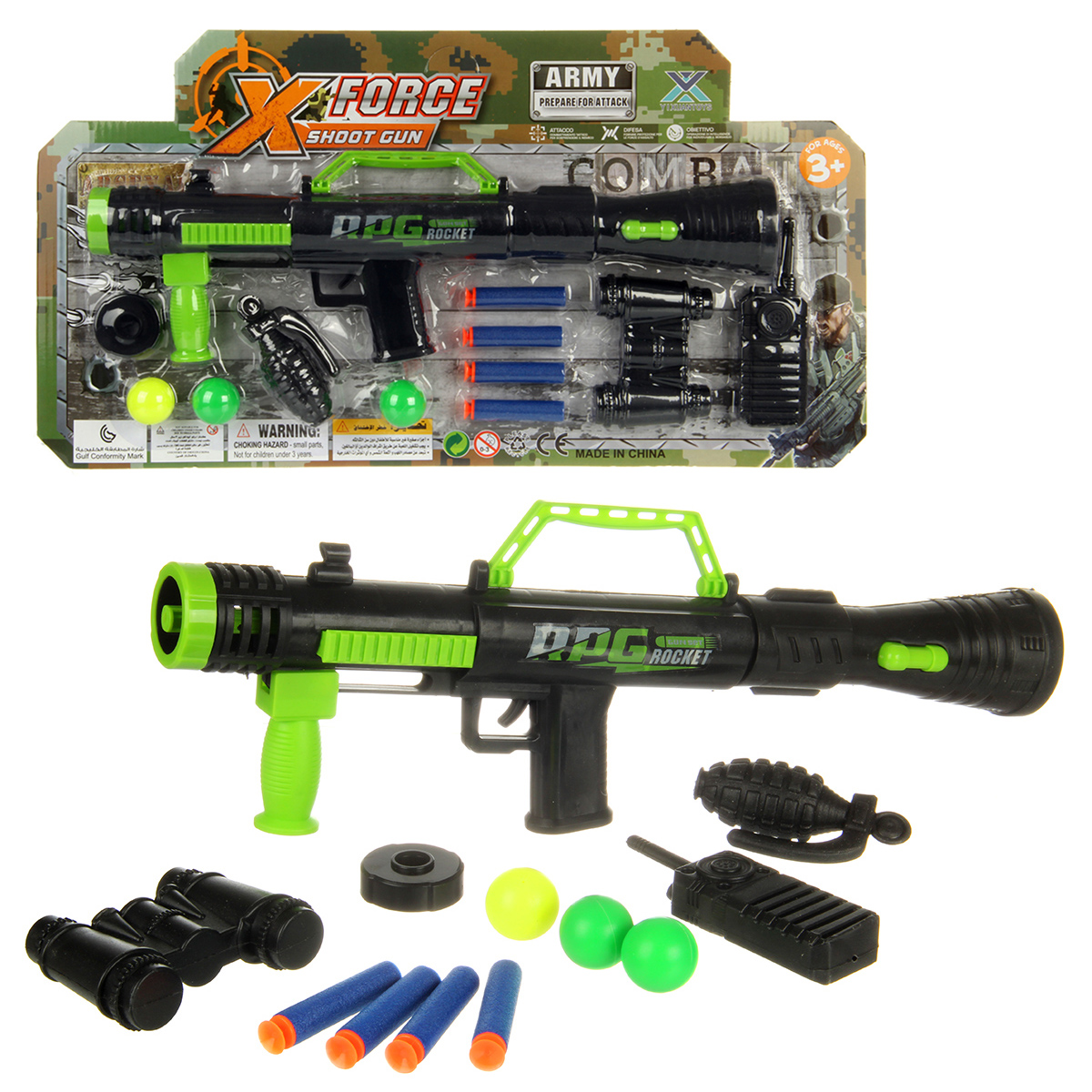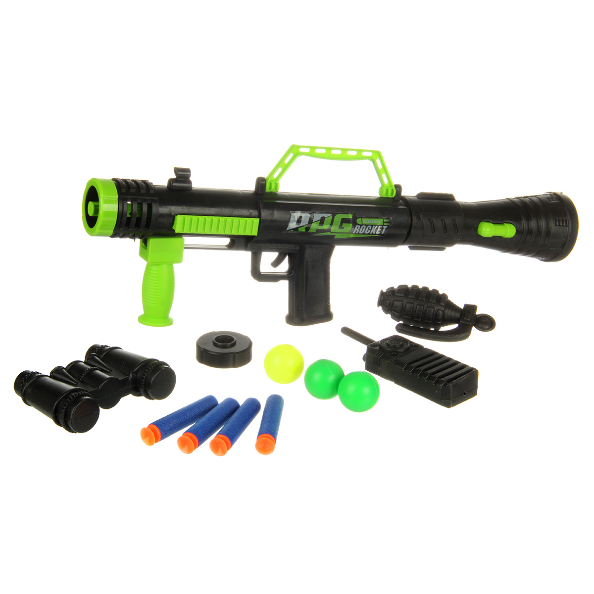 В комплекте игрушечный гранатомет, насадка на дуло, 4 мягких патрона, 3 шарика, граната, бинокль, рация.