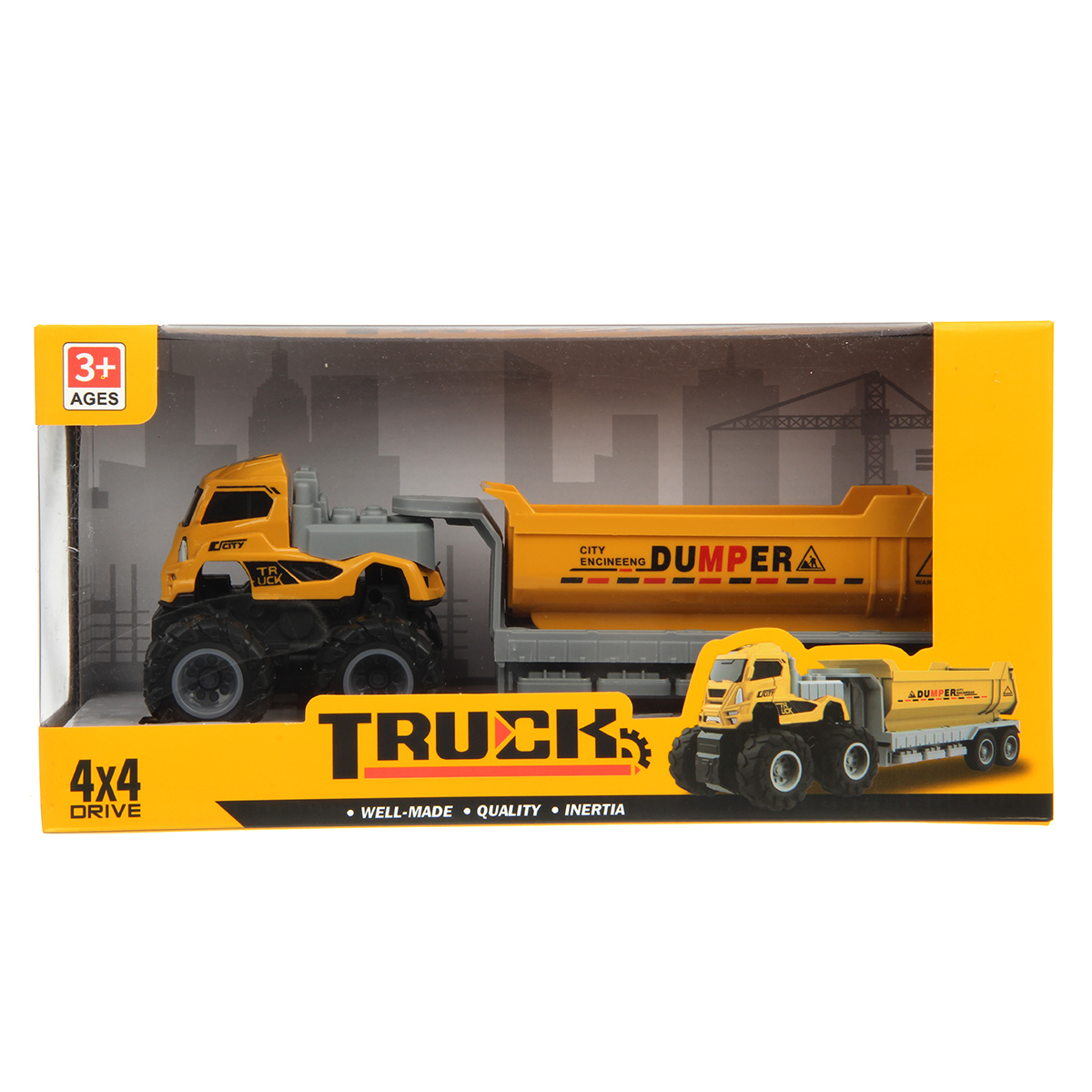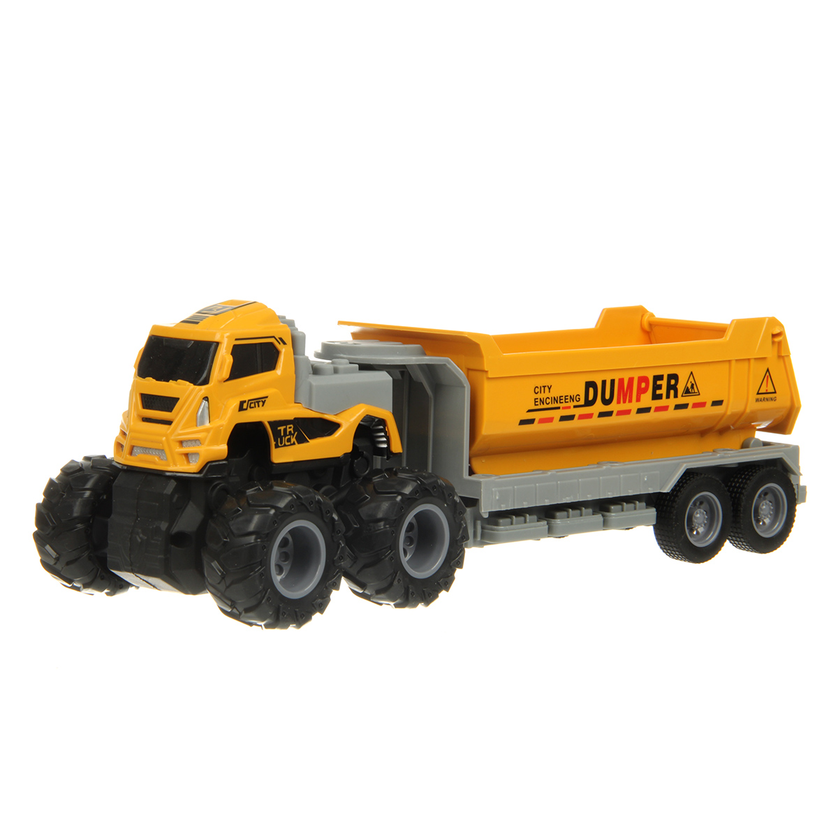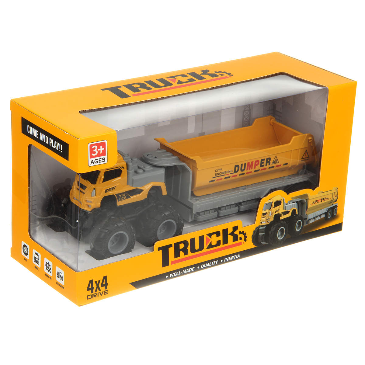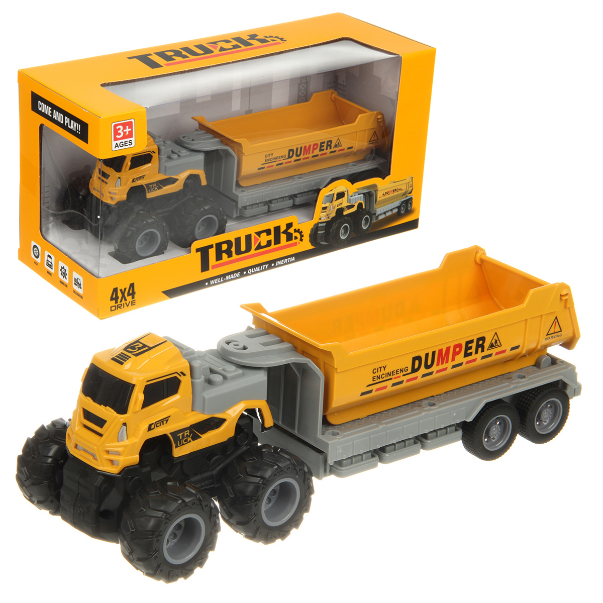 Игрушечный самосвал с прорезиненными колесами изготовлен из прочных и долговечных материалов.