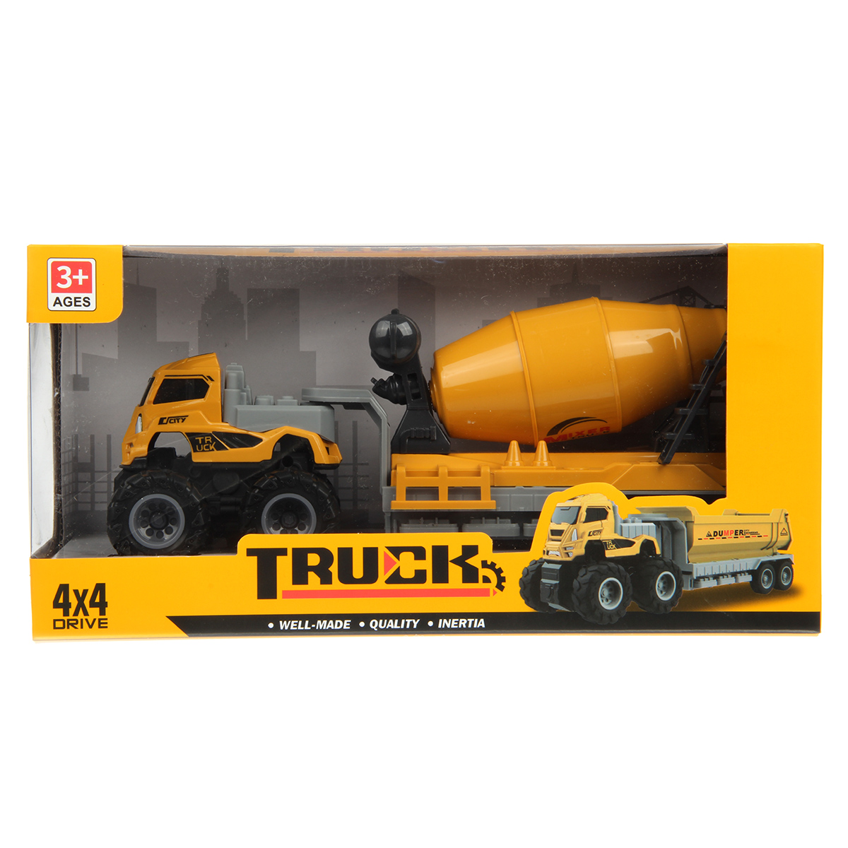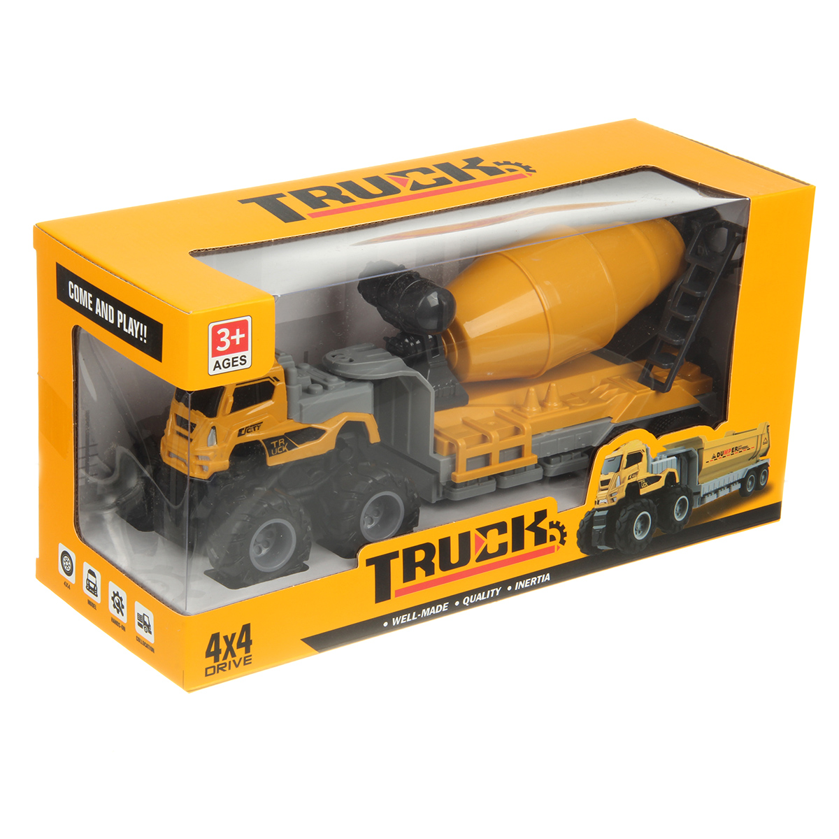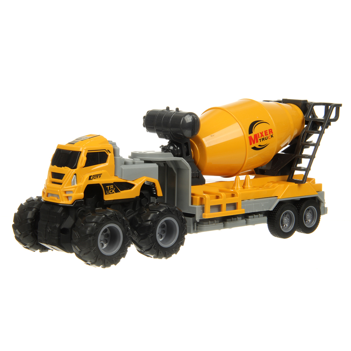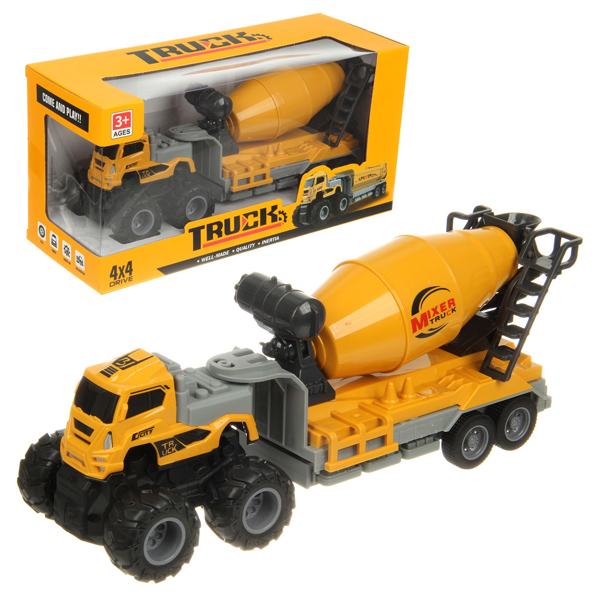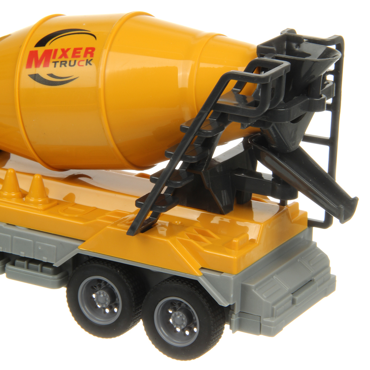 Игрушечная бетономешалка с прорезиненными колесами изготовлена из прочных и долговечных материалов.