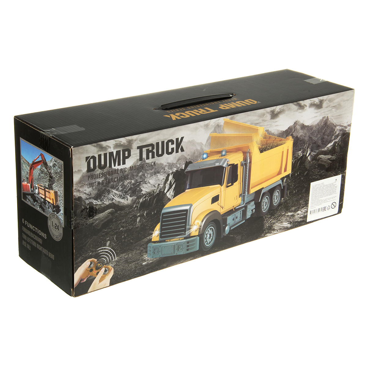 Самосвал на батарейках в подарочной упаковке, пульт управления удобно ложится в руки.