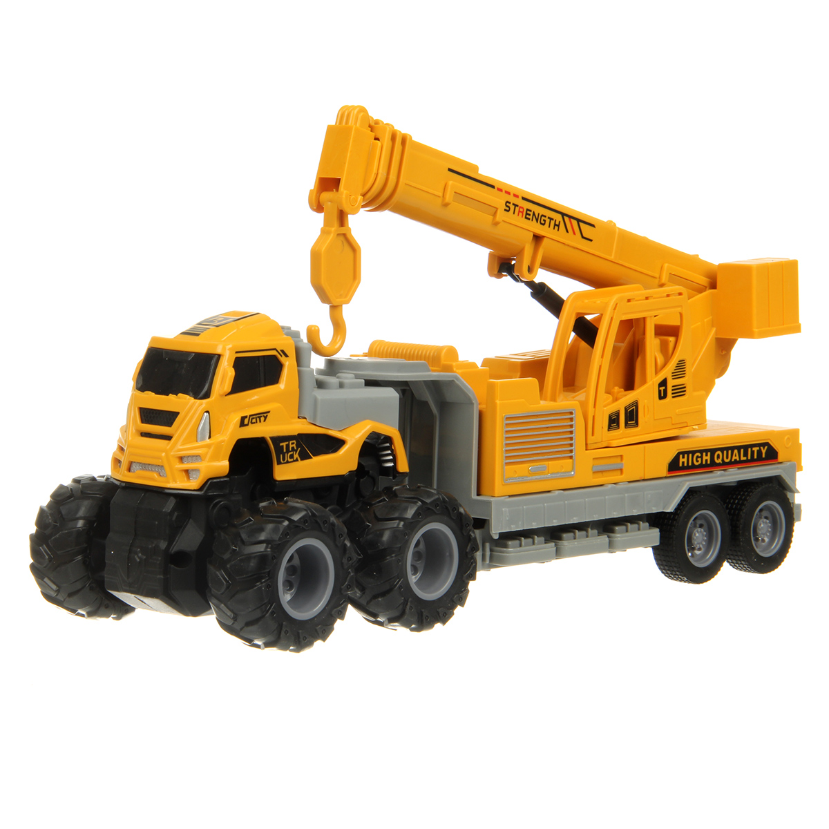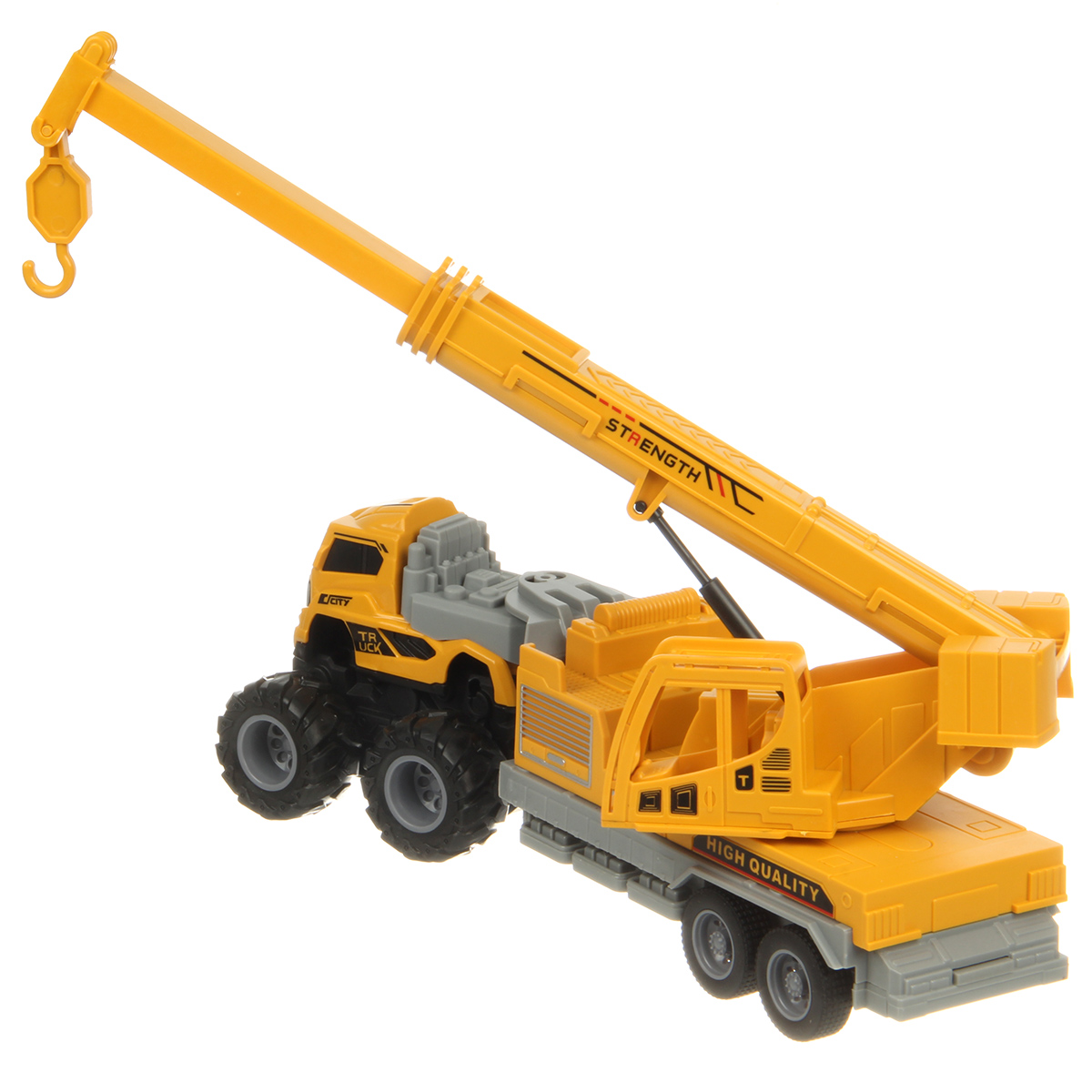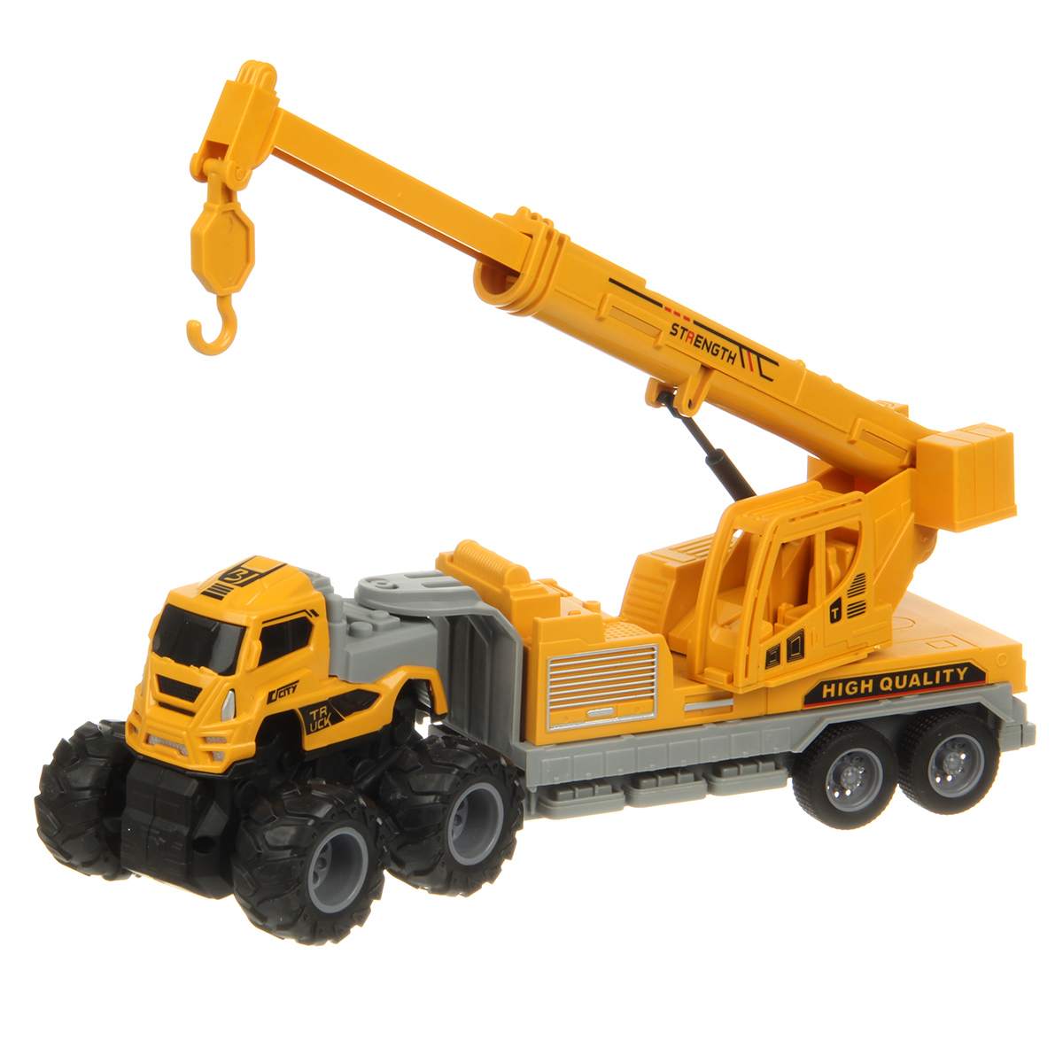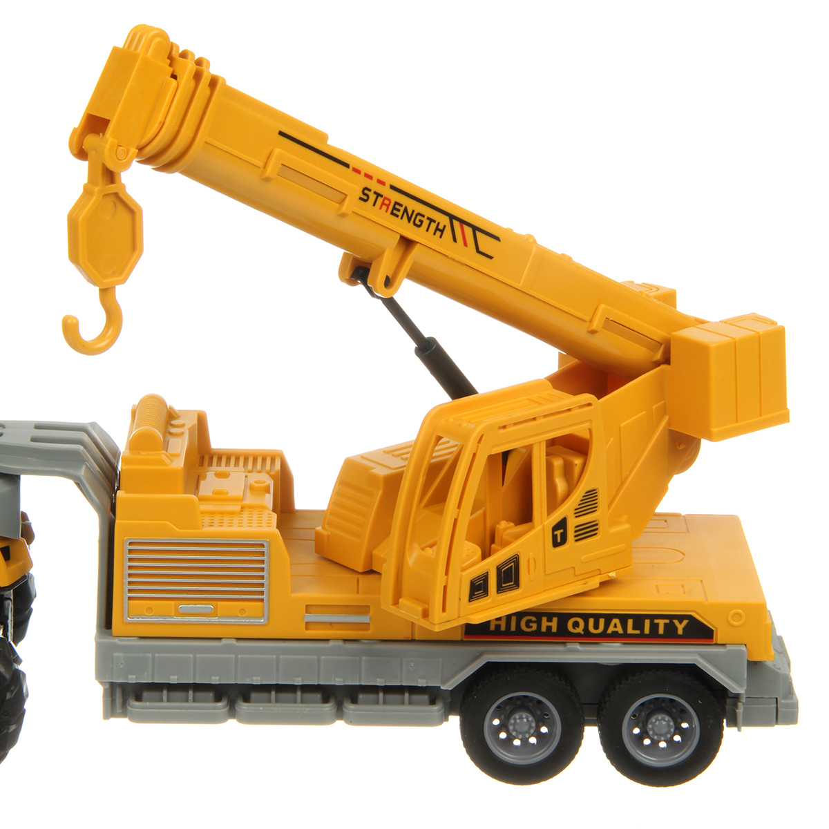 Игрушечный автокран с прорезиненными колесами изготовлен из прочных и долговечных материалов.