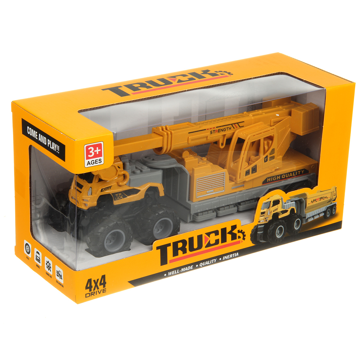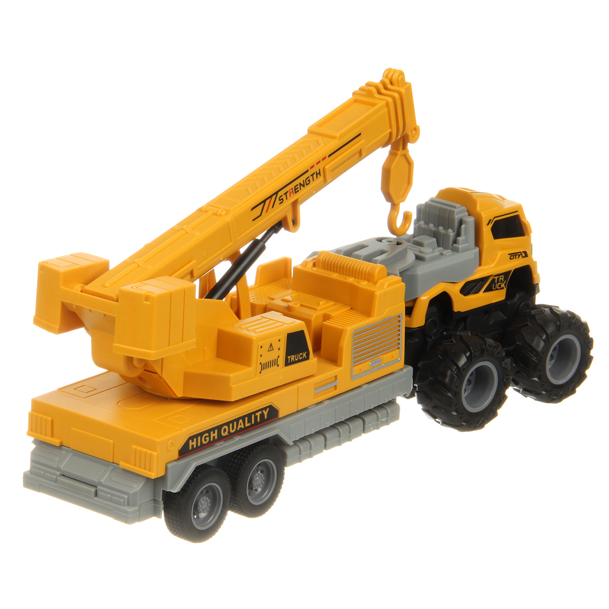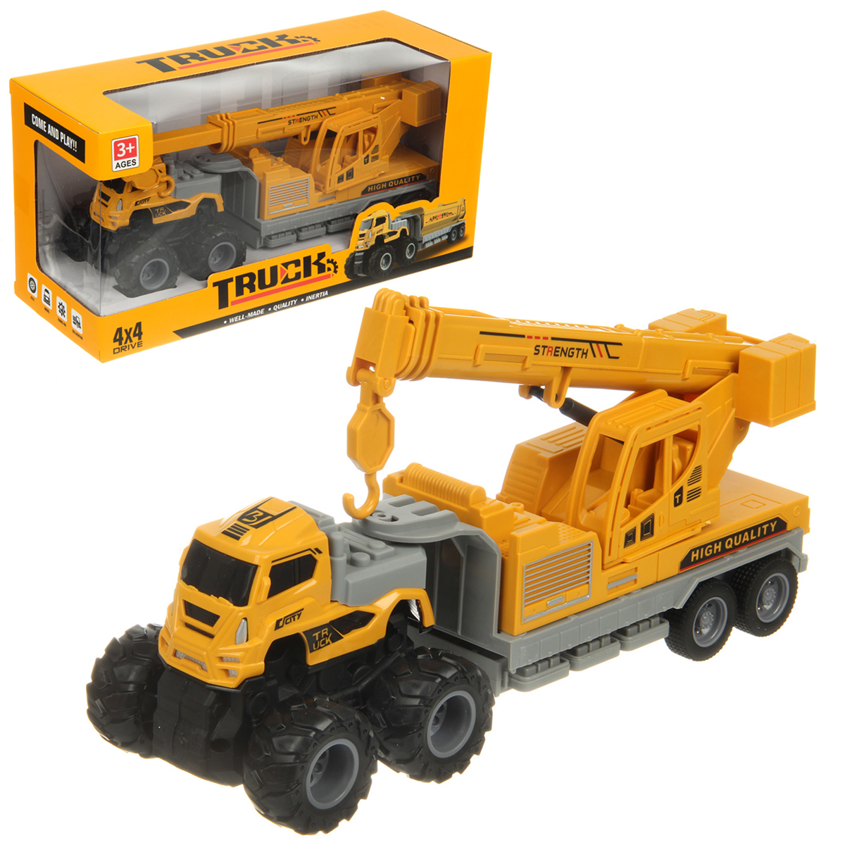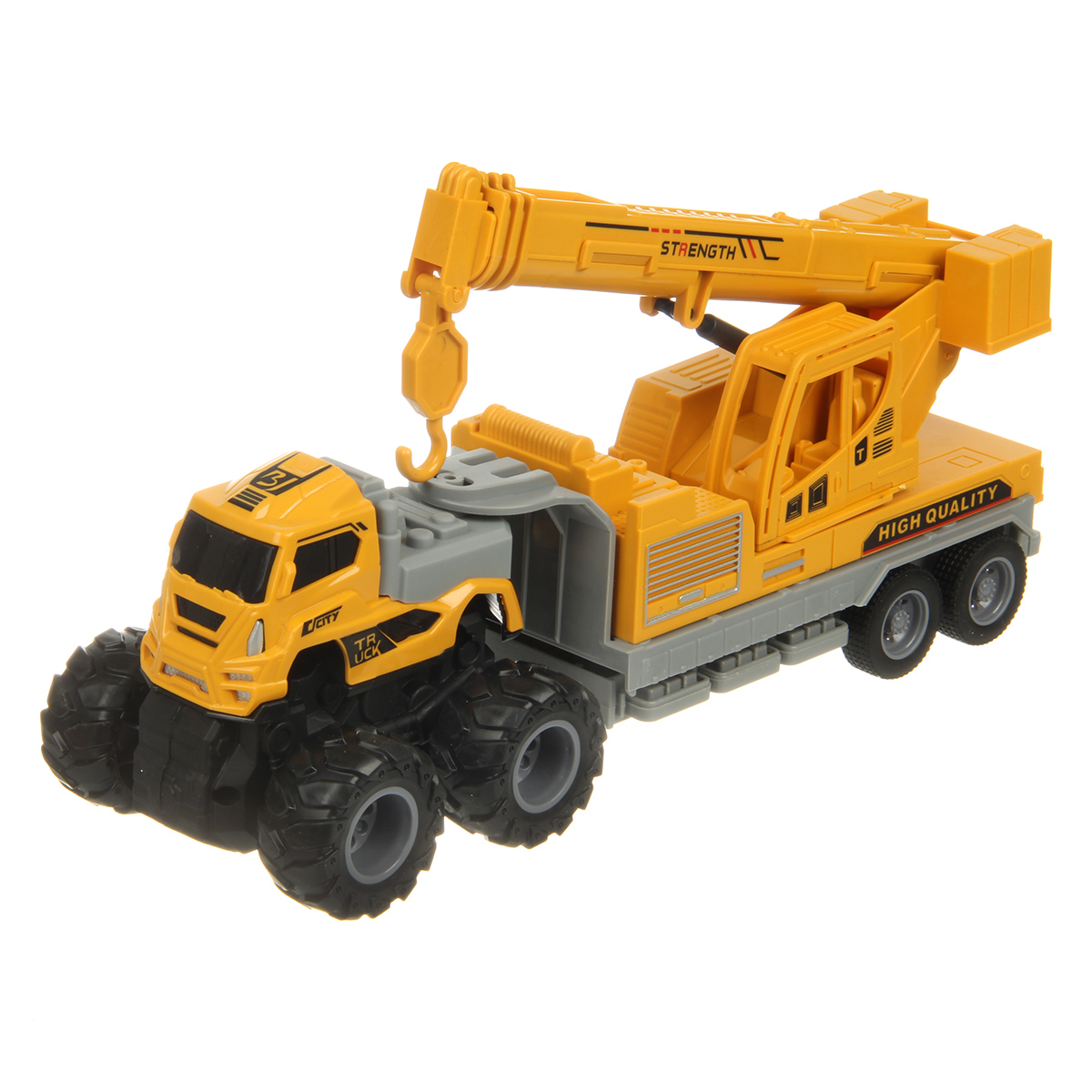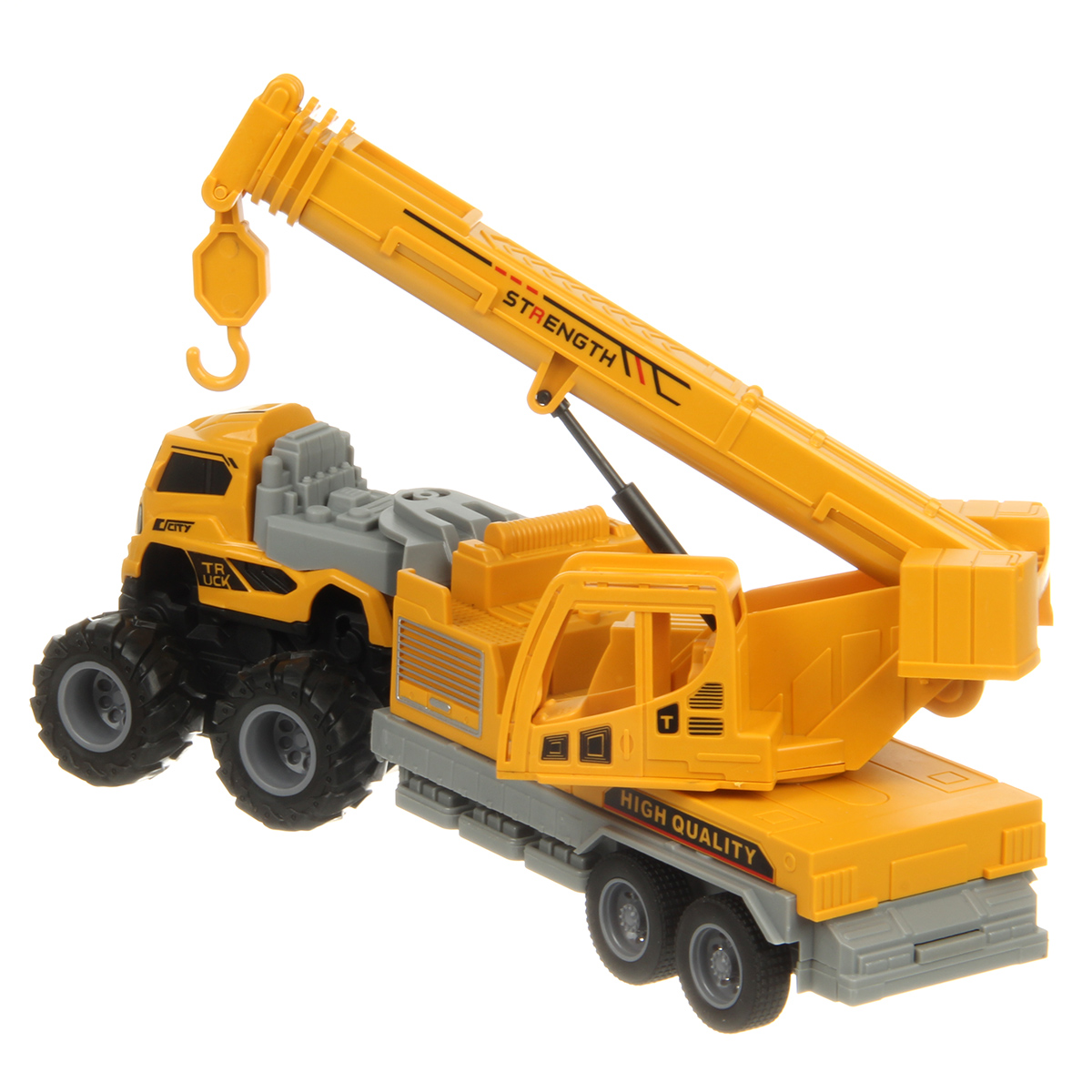 Игрушечный автокран с прорезиненными колесами изготовлен из прочных и долговечных материалов.