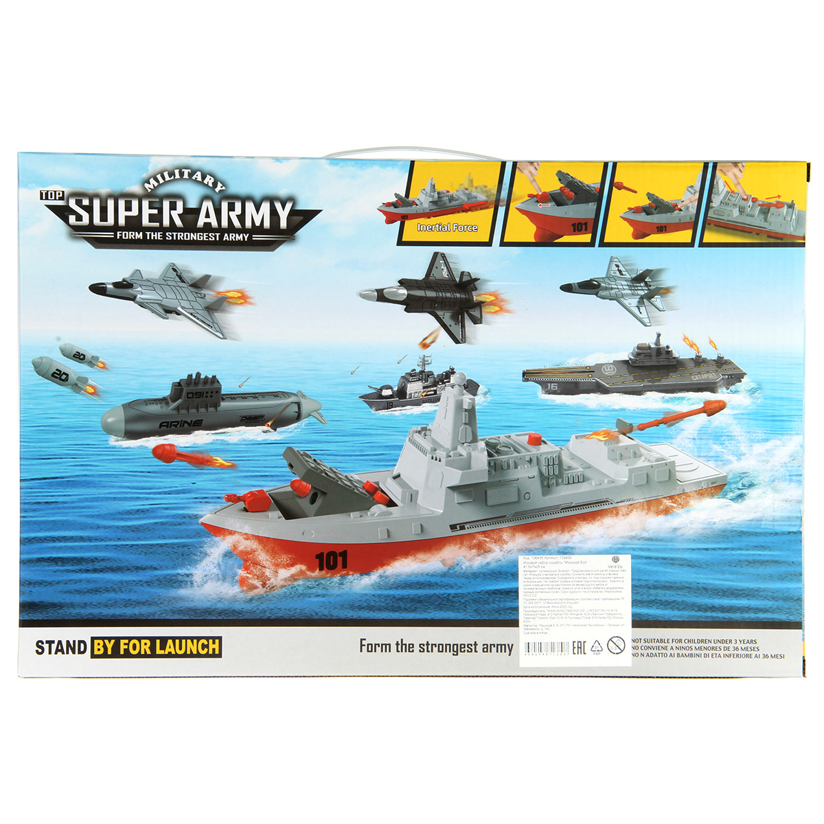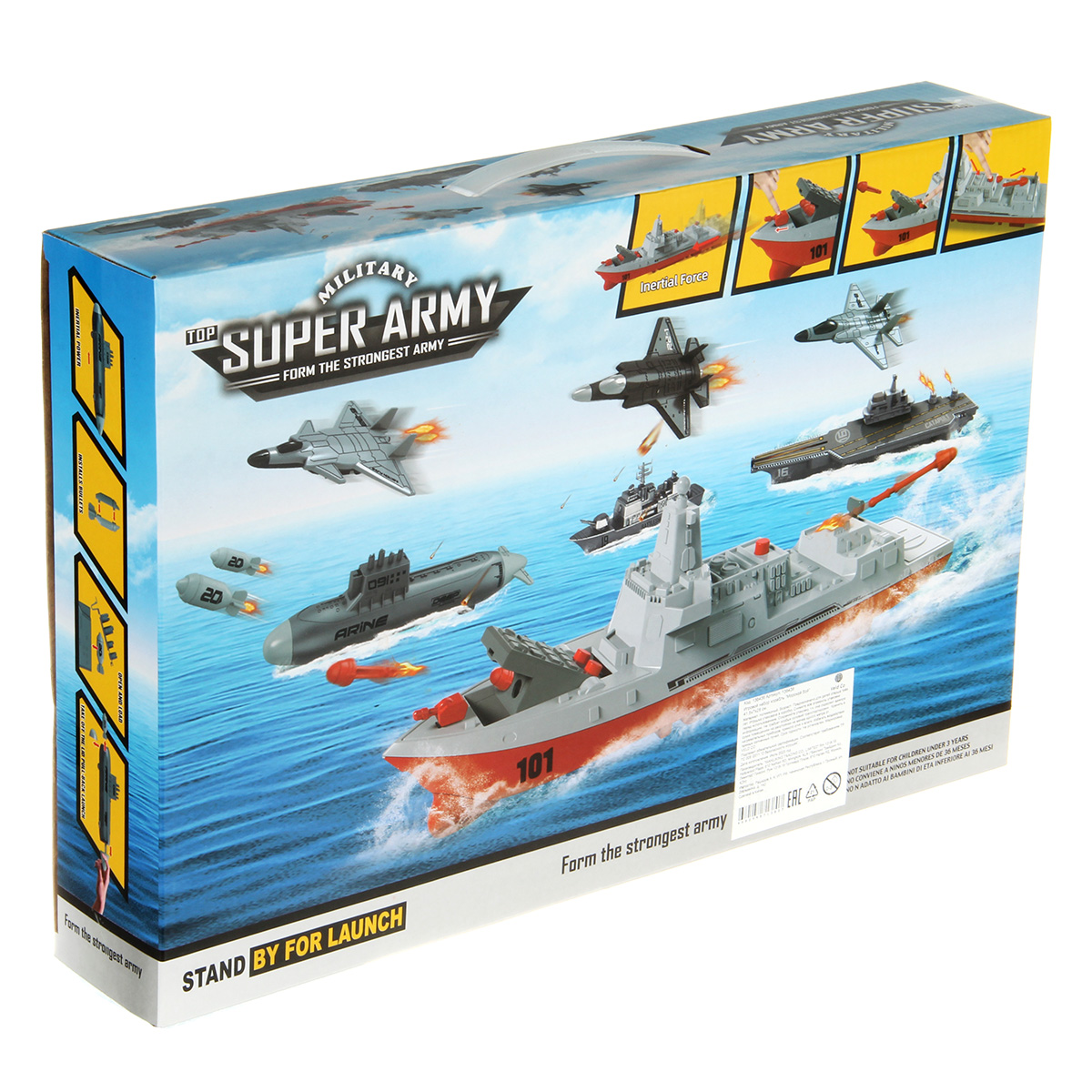 Игровой набор Морской бой. Эсминец с двумя пусковыми установками, фрикционным механизмом и движением вперед и назад. Авианосец, можно запускать с палубы истребители, авианосец с фрикционным механизмом, движением вперед и назад. Истребители с инерцией, катаются вперед и назад. Интересная задумка, качественное исполнение, прочные и долговечные материалы.