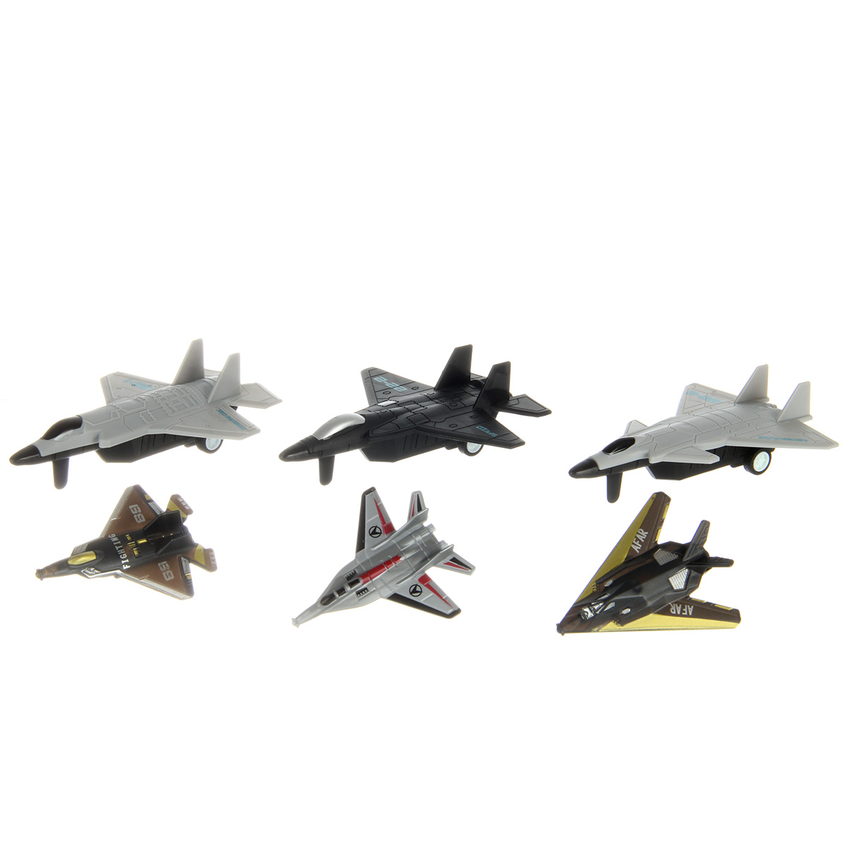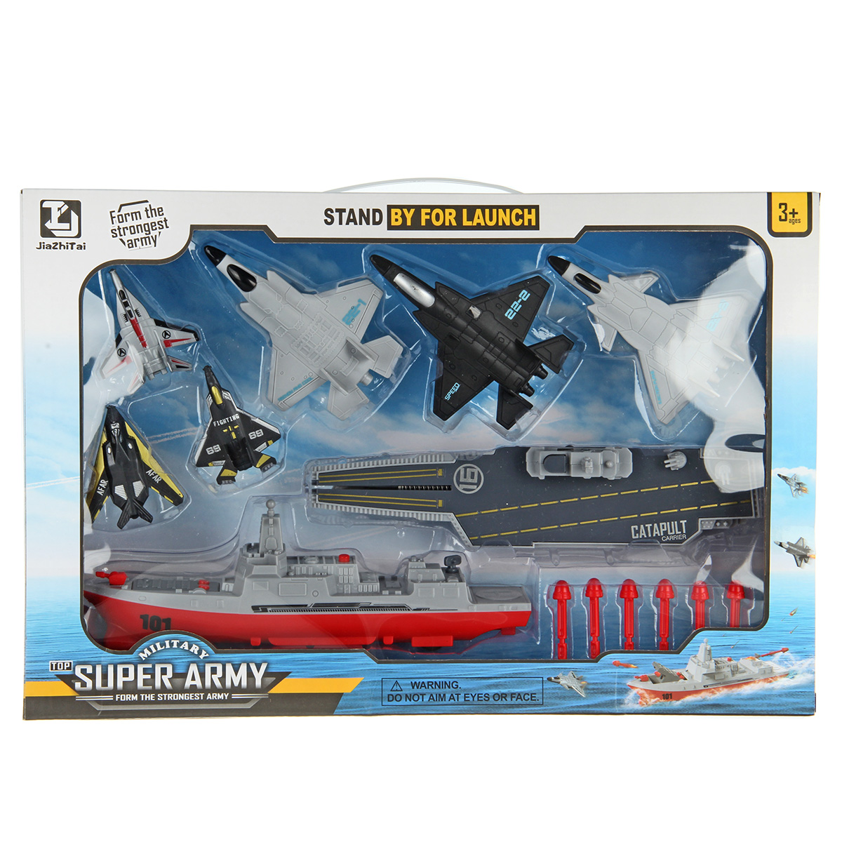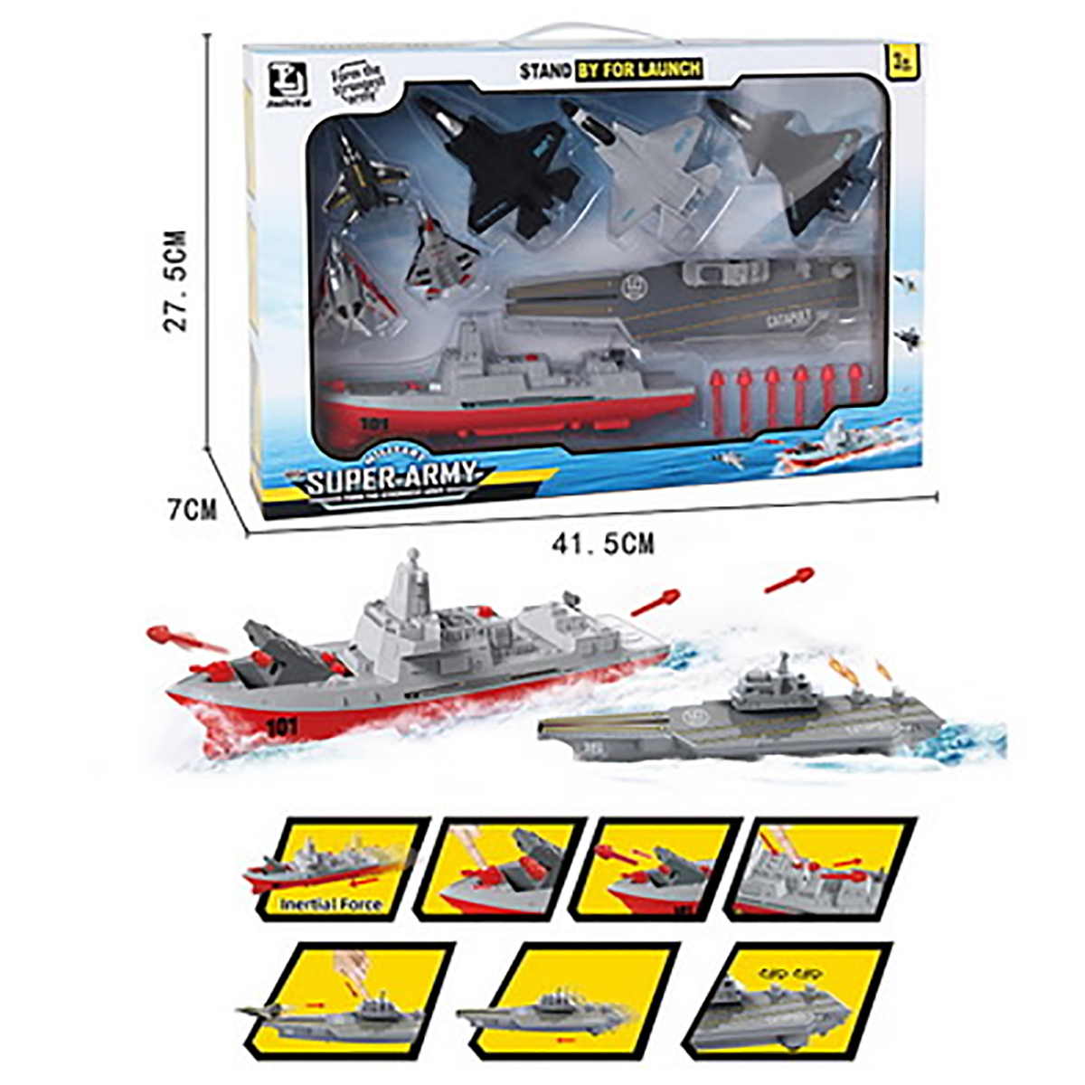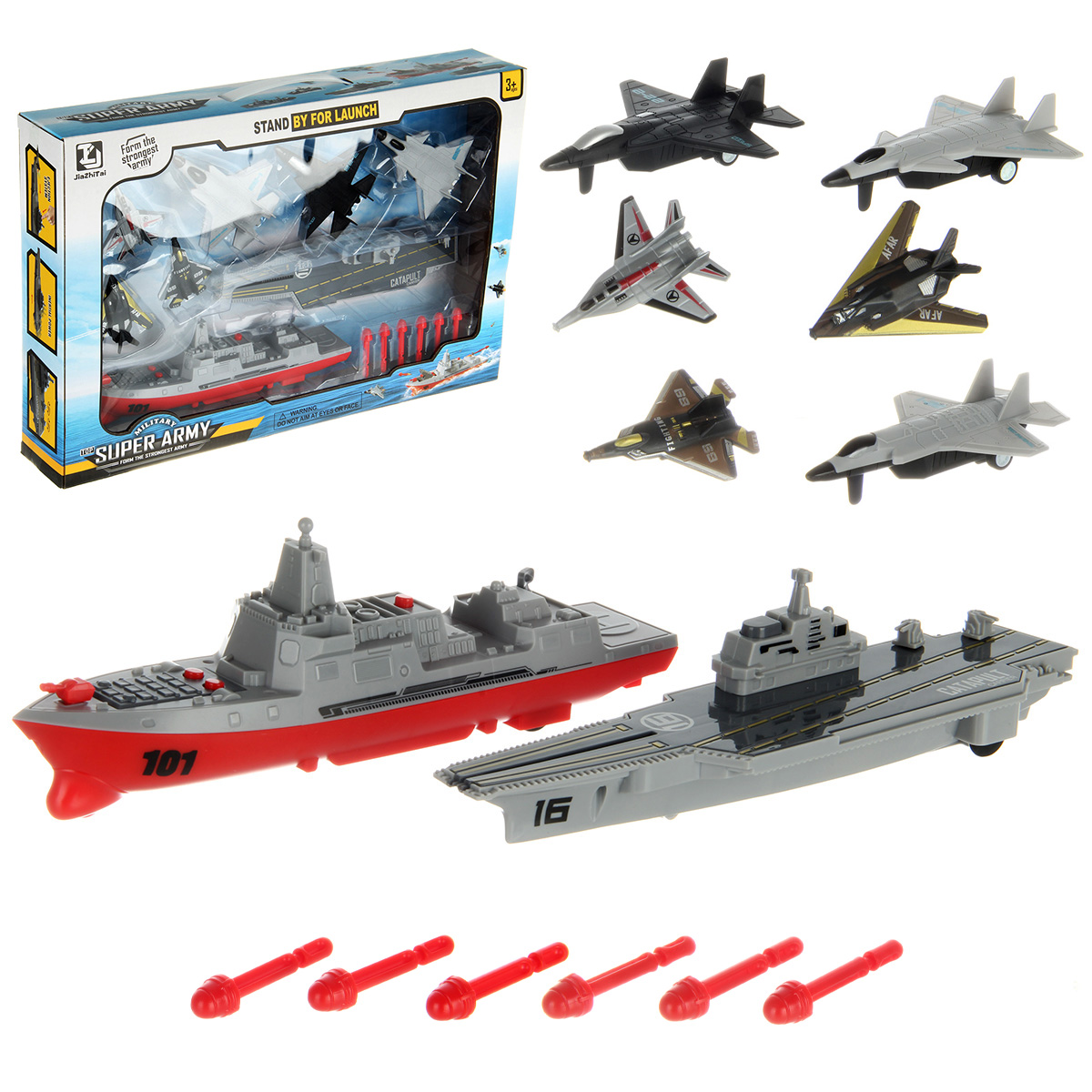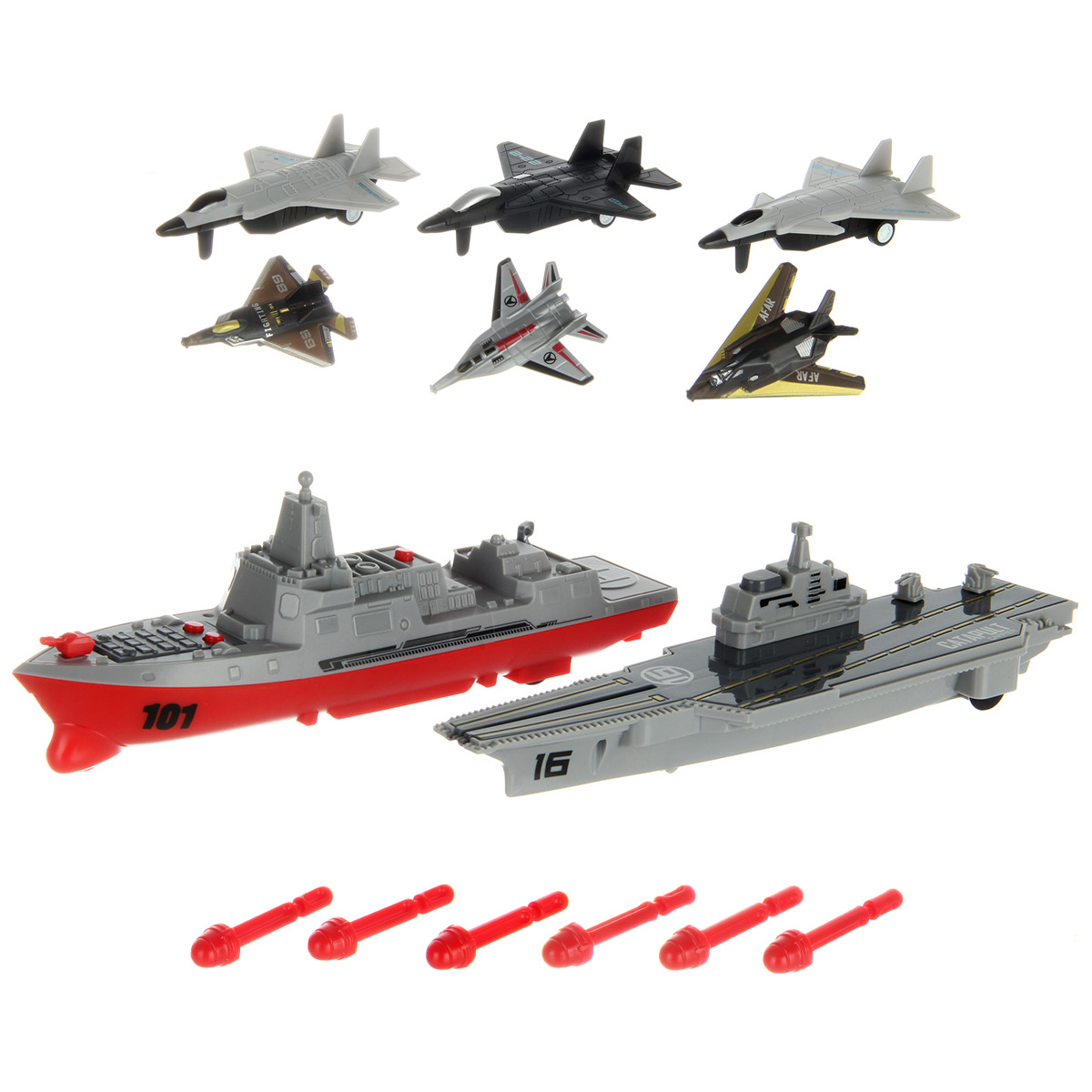 В наборе эсминец, авианосец, 3 больших истребителя, 3 маленьких истребителя, 6 снарядов.