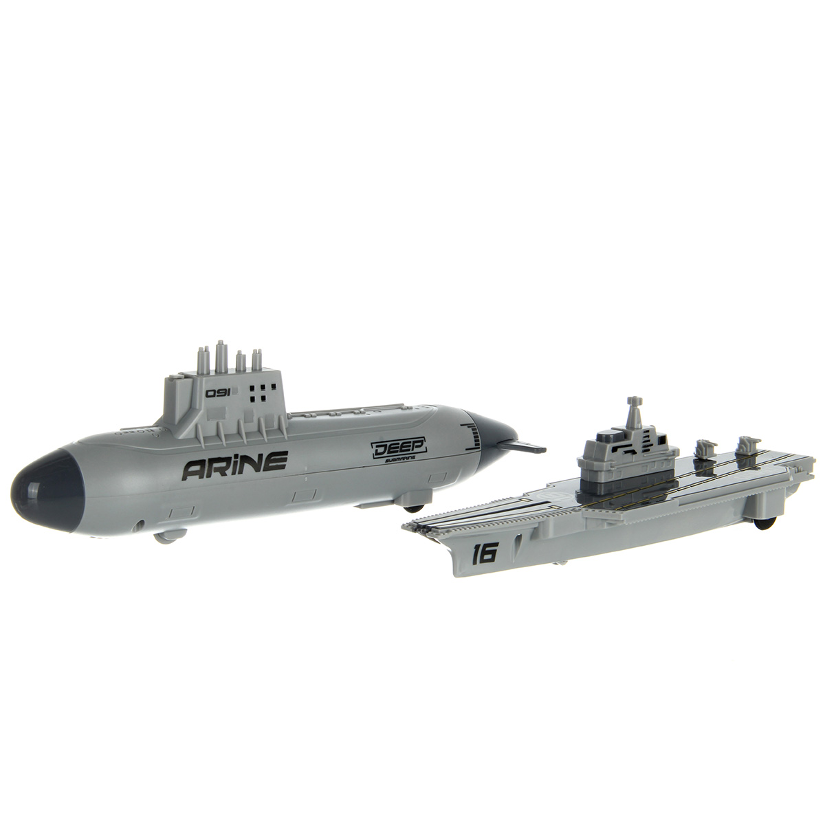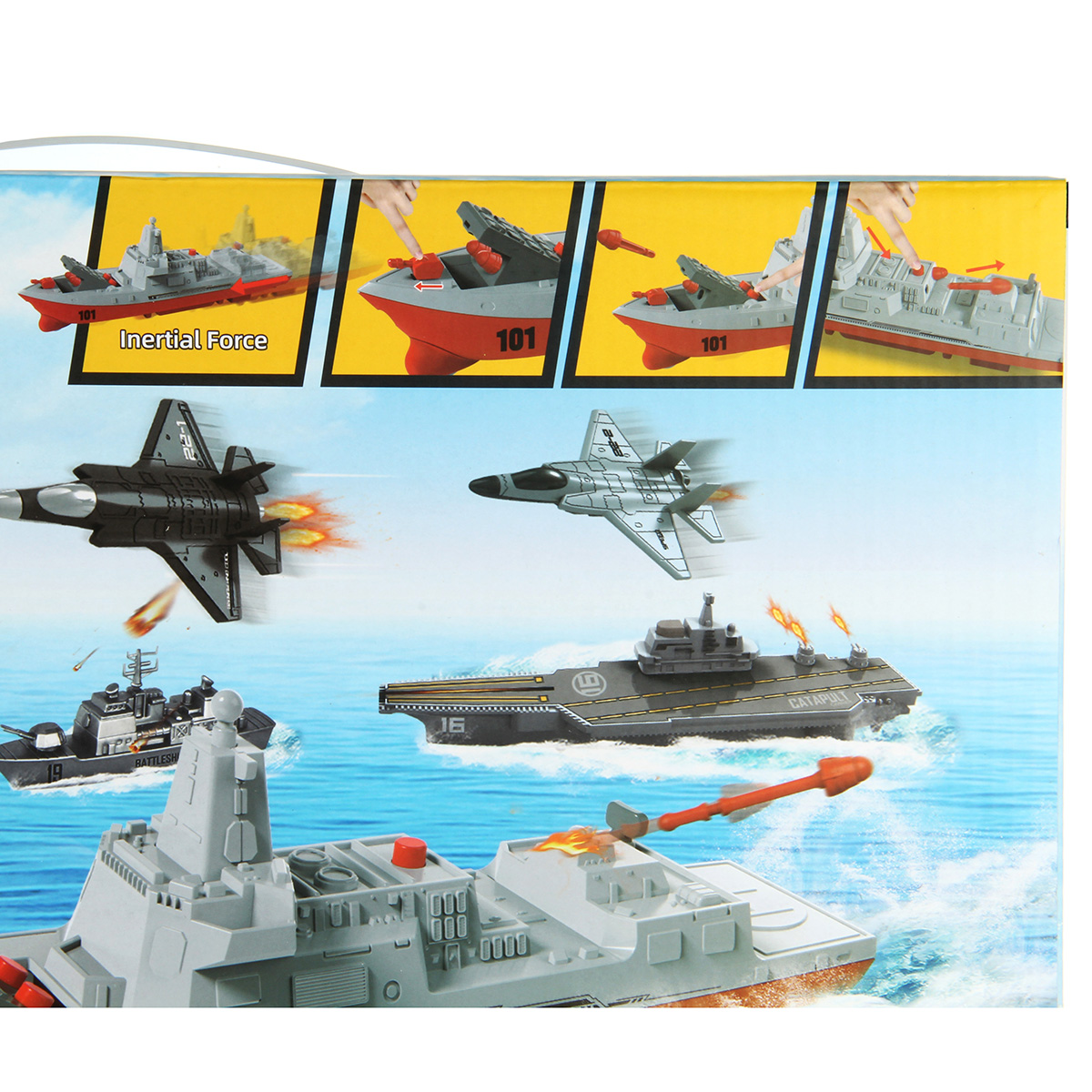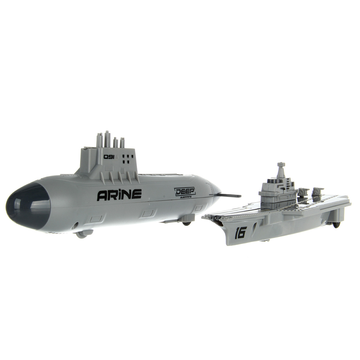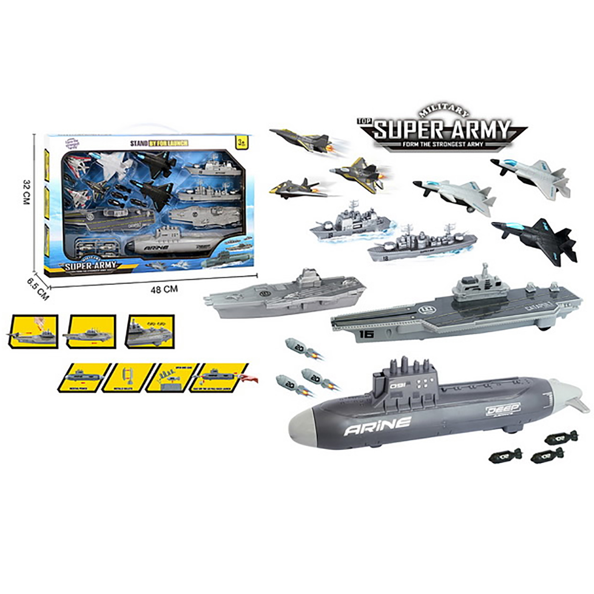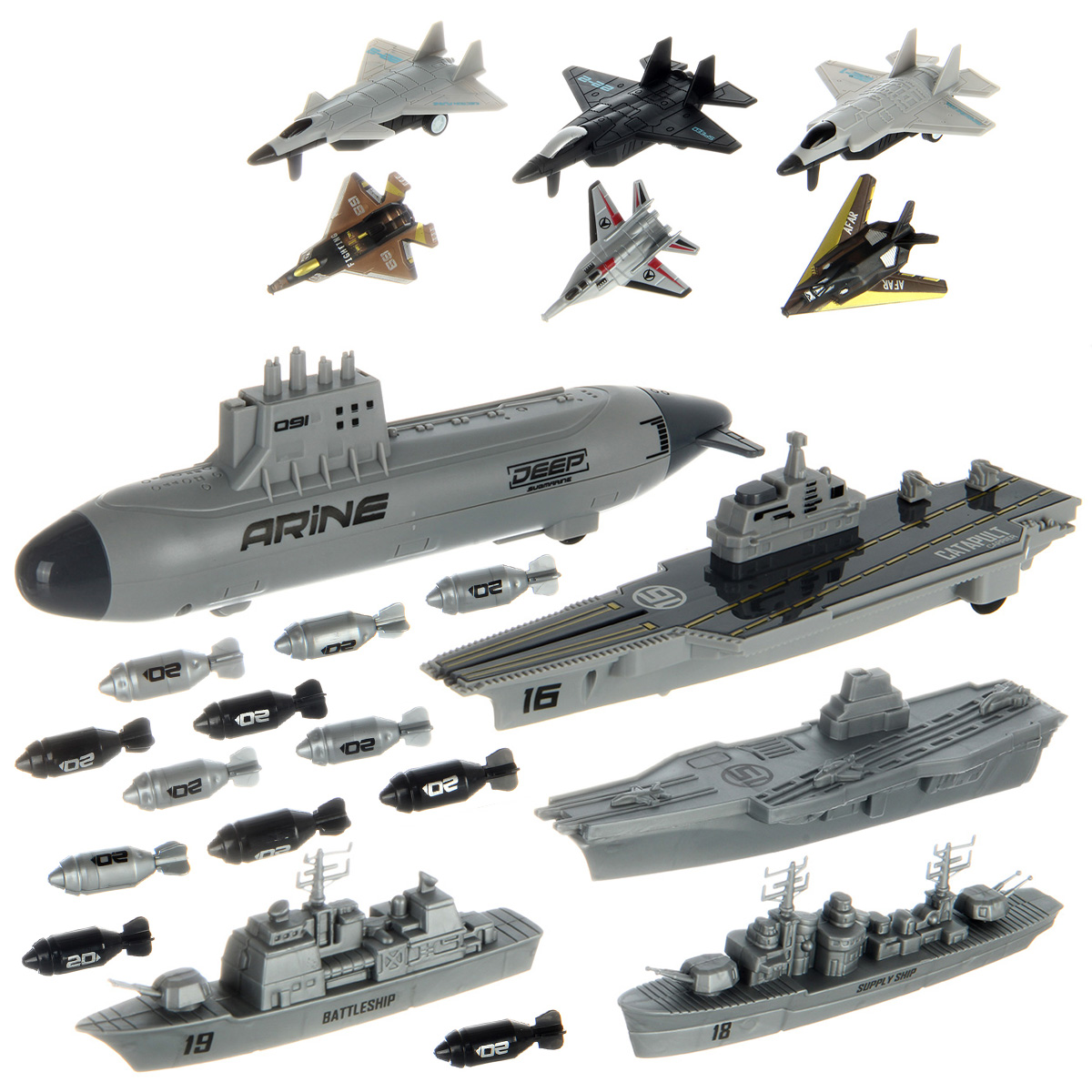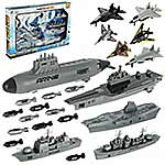 В наборе 2 авианосца, подводная лодка, военный корабль, грузовой корабль, 6 истребителей, 12 снарядов для подводной лодки