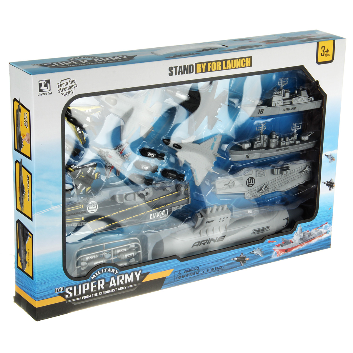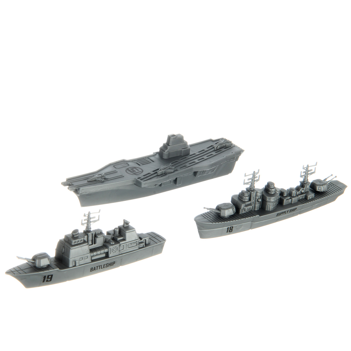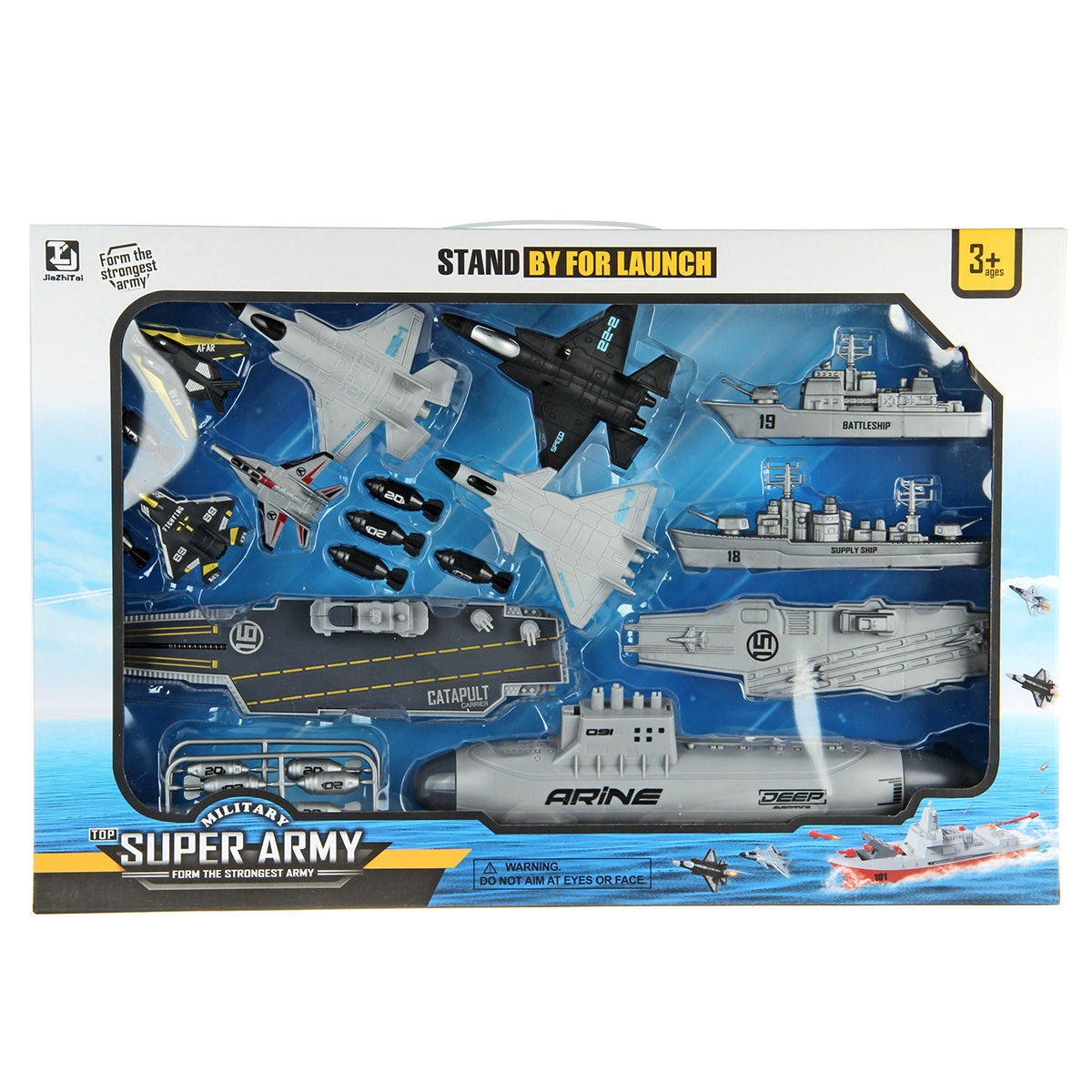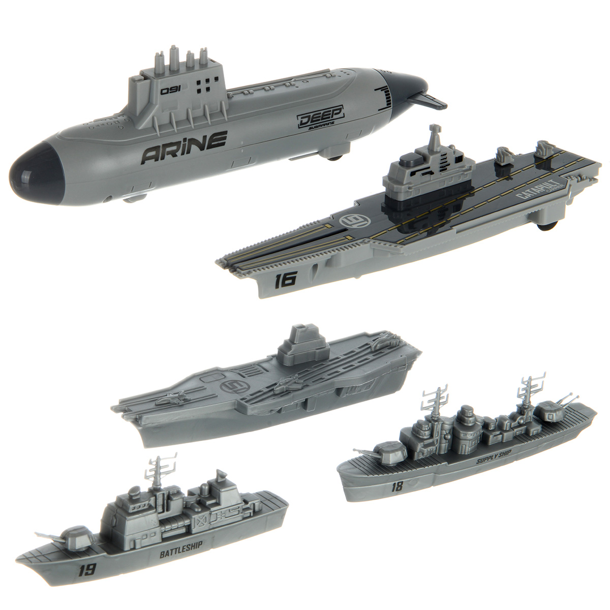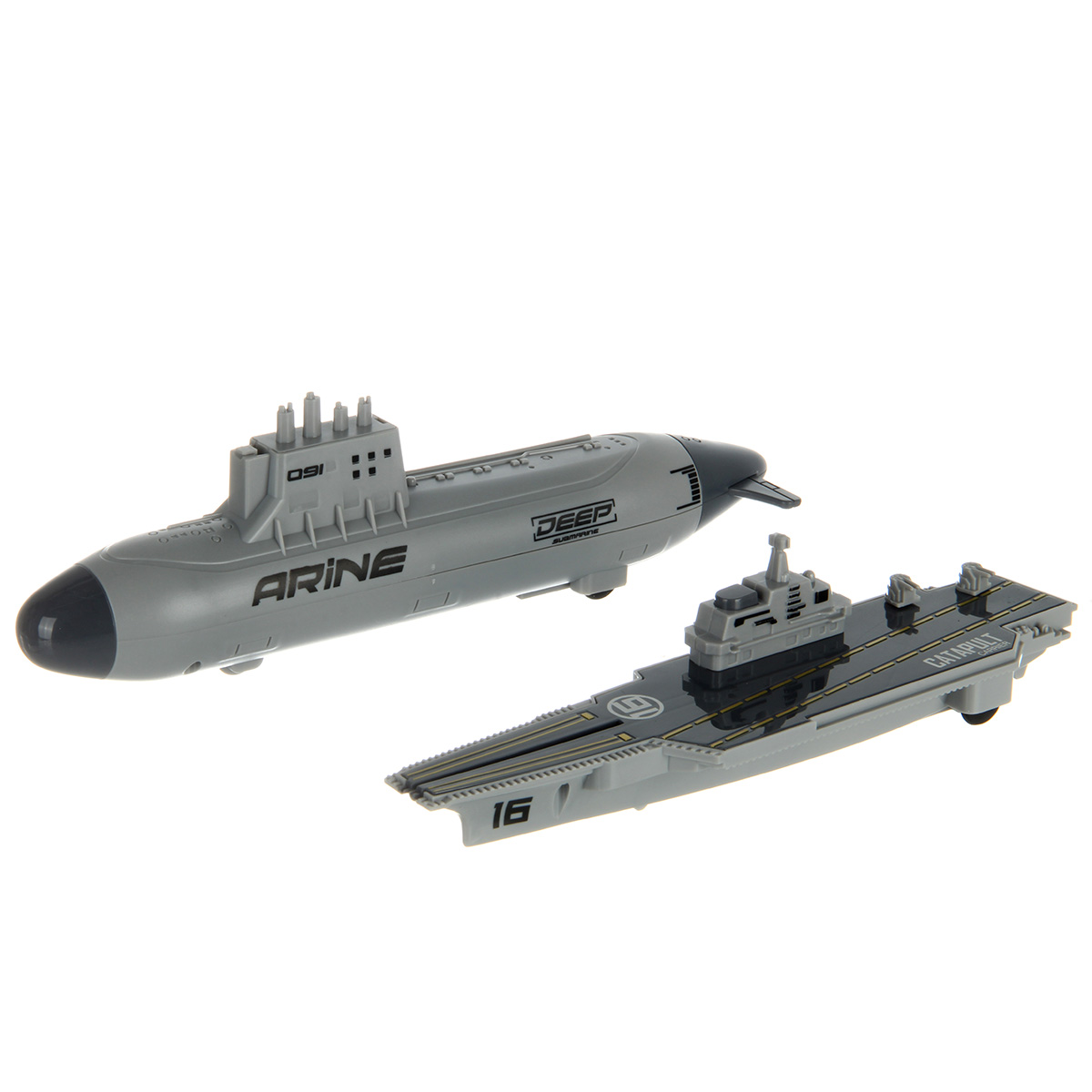 В наборе 2 авианосца, подводная лодка, военный корабль, грузовой корабль, 6 истребителей, 12 снарядов для подводной лодки