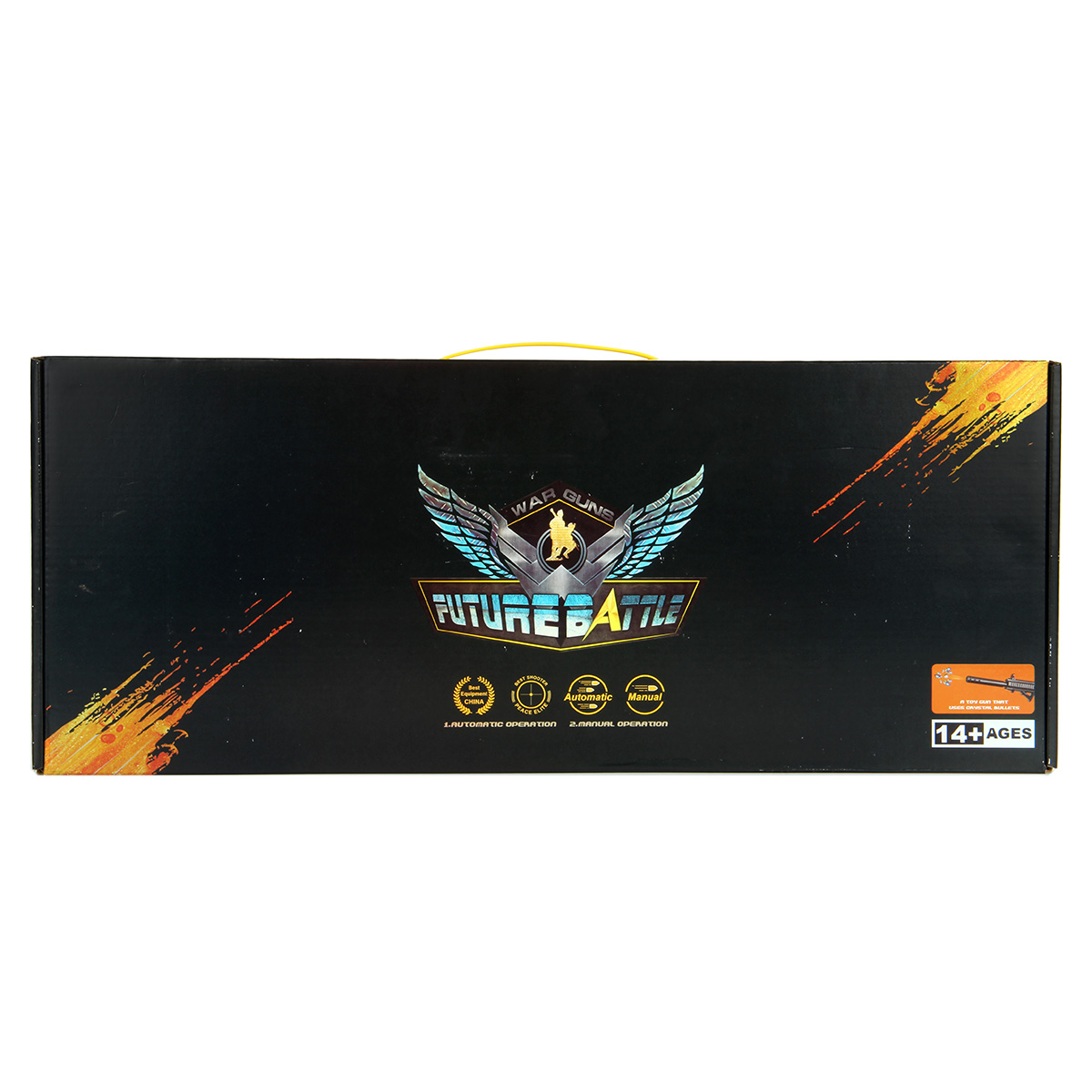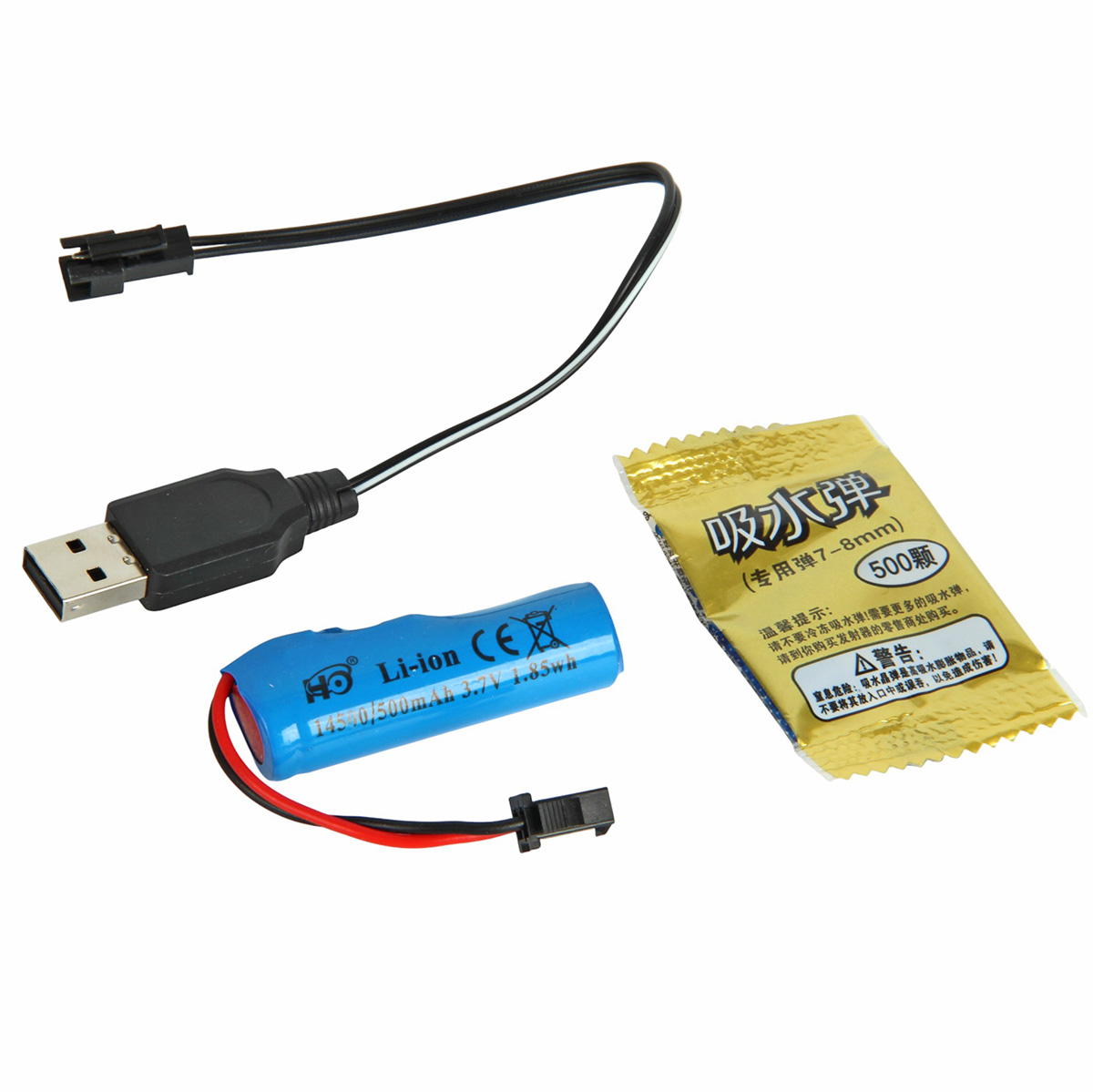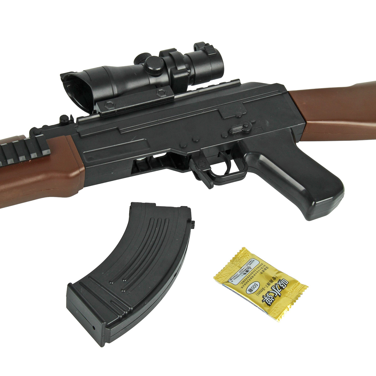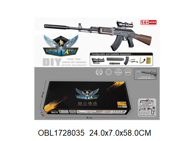 Автомат, магазин, оптический прицел, глушитель, приклад, пакет с 500 орбизами, аккумулятор 3.7 V, USB кабель.
