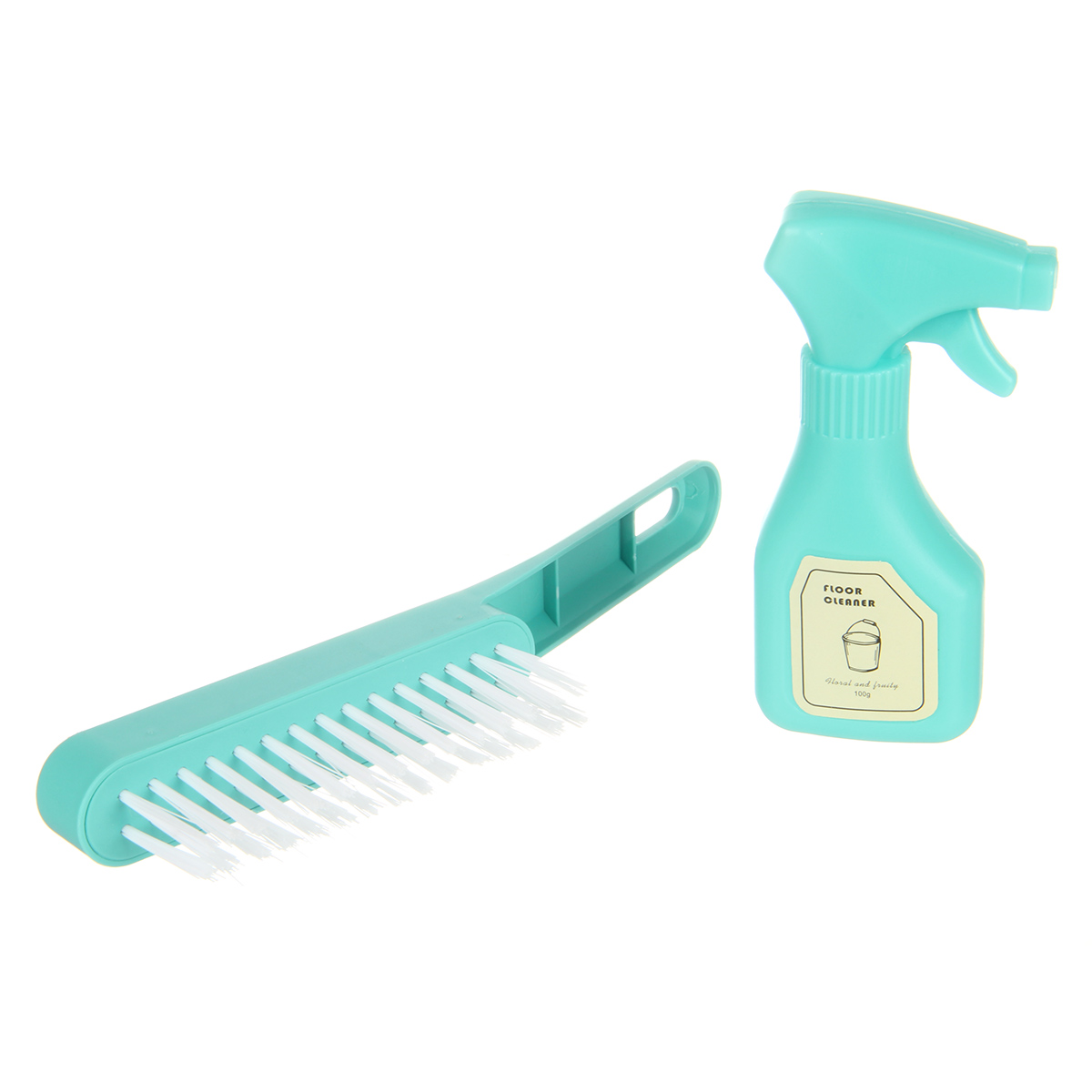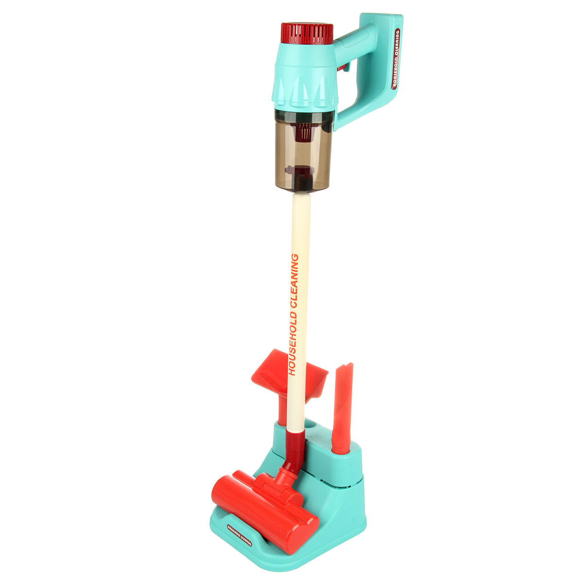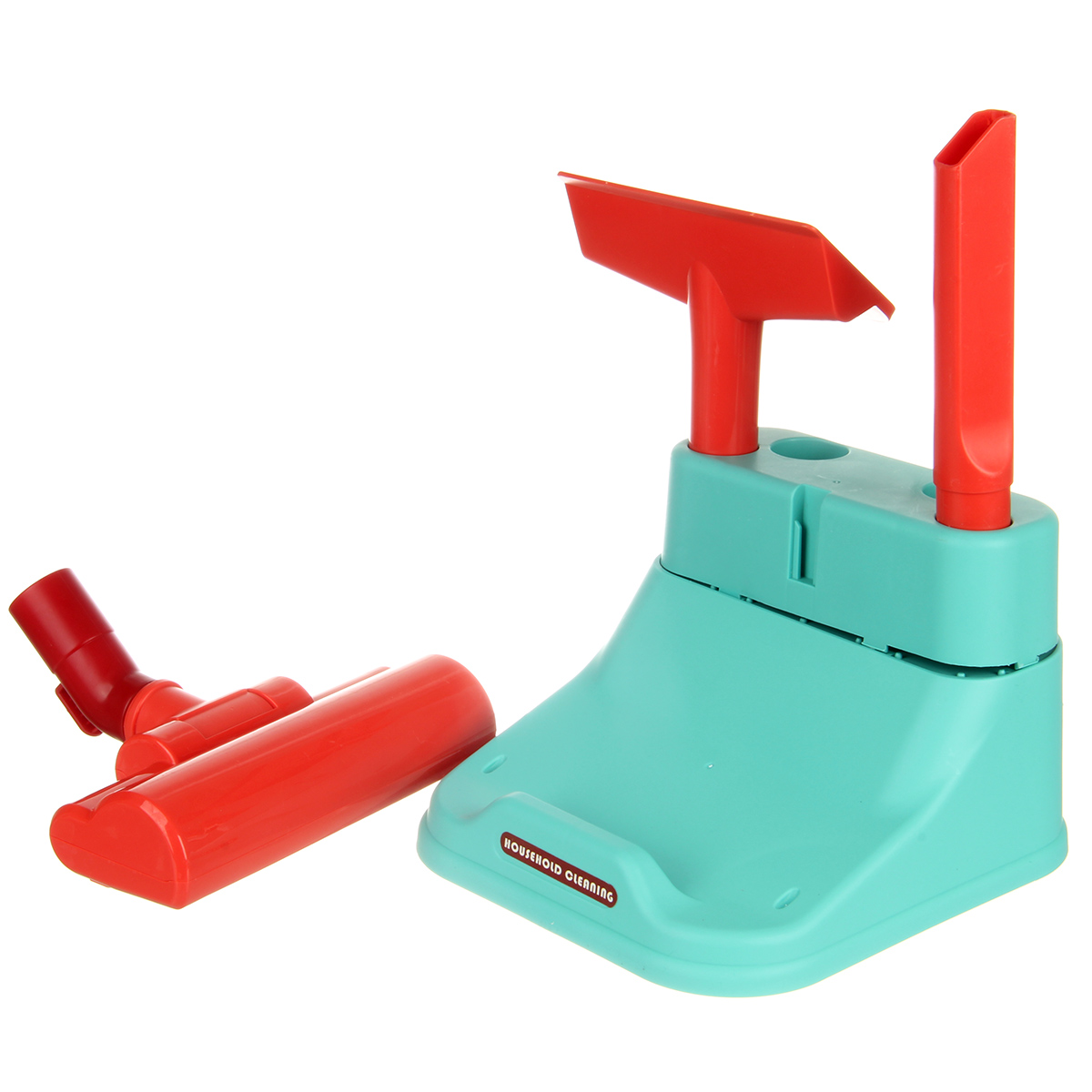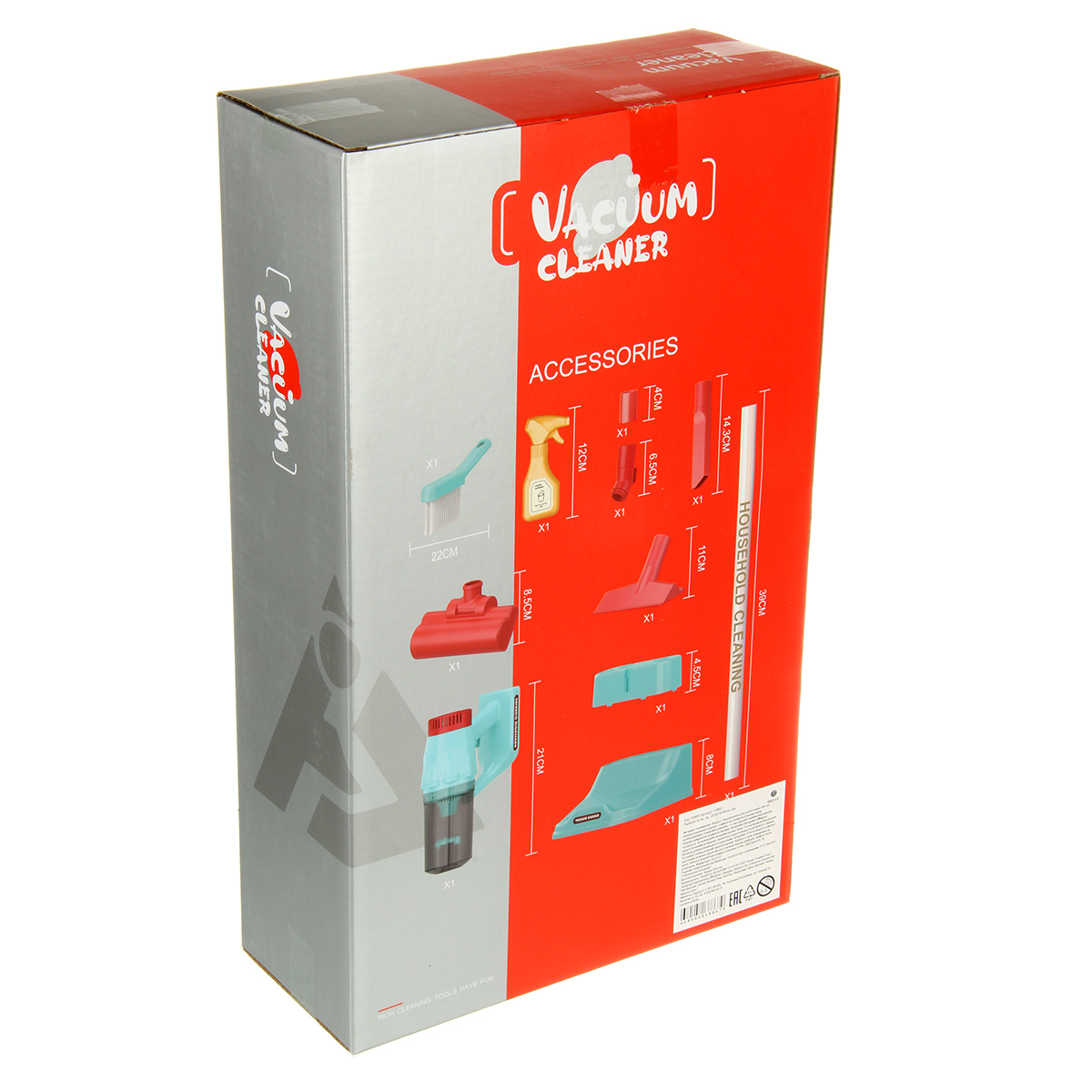 В наборе пылесос, подставка из 2 частей, трубка, 3 насадки, щетка, бутылочка имитация моющего средства, элемент сборки.