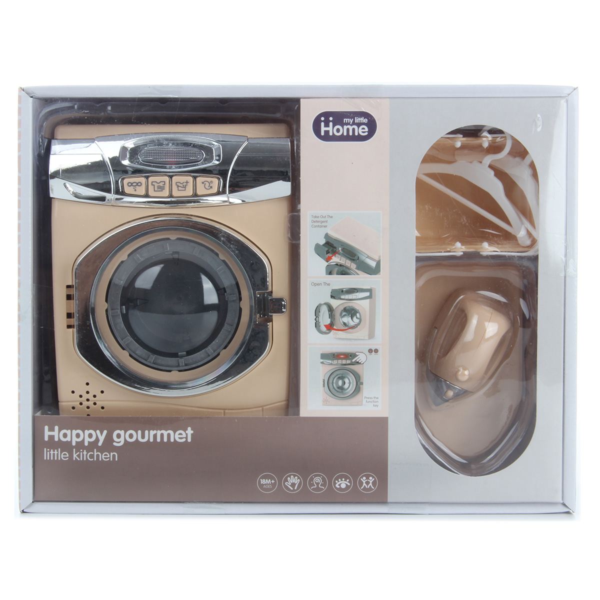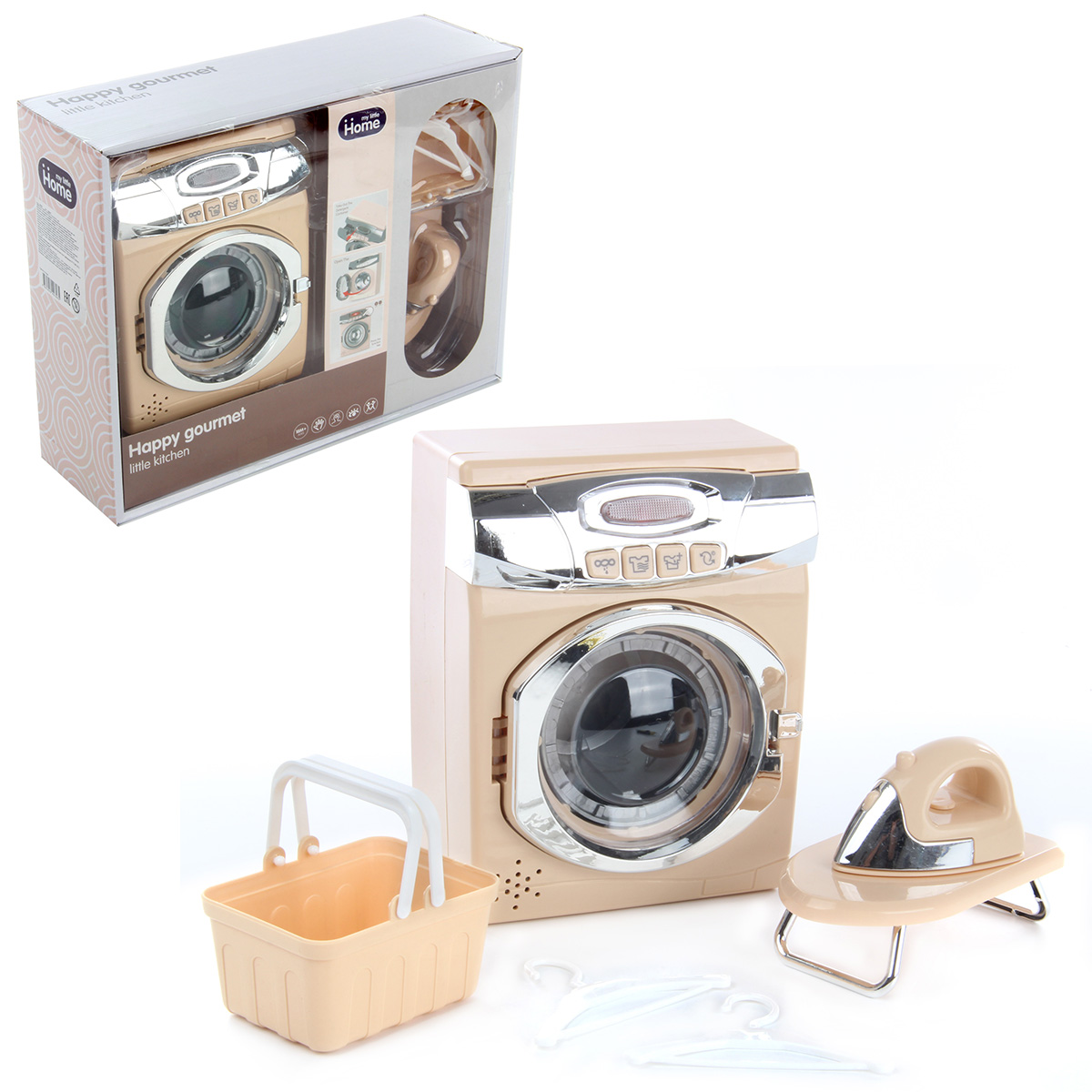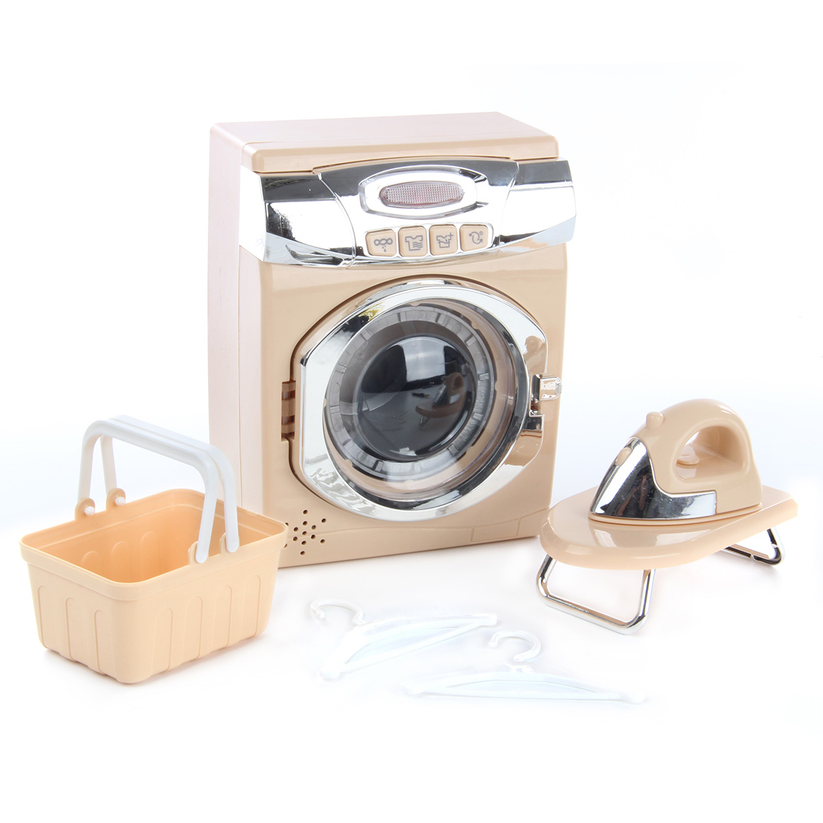 Замечательный набор для увлекательных сюжетно-ролевых игр. Оформлен в приятной расцветке, реалистичном дизайне, понравится каждому ребенку. В комплект входят стиральная машинка, корзинка для белья, гладильная доска, 2 вешалки и утюжок. Ножки гладильной доски выдвигаются. Функционал стиральной машинки: - при нажатии на кнопки, находящиеся на лицевой панели машинки, имитирует разные режимы стирки, издавая соответствующие звуки, барабан крутится; - прозрачная кнопка подсвечивается; - дверца барабана открывается вручную. Благодаря такой игрушке ребенок будет с удовольствием развивать мелкую моторику рук, координацию движений, воображение, слуховое и зрительное восприятие. Машинка работает от 3 батареек АА, не входят в комплект. Игрушка изготовлена из высококачественного и безопасного полимерного материала. Размеры машинки: 14*9*17 см. Размеры утюга: 8*5*5 см. Размеры доски в разложенном виде: 12*7*4 см. Размеры корзинки: 9*7*5 см. Размеры вешалки: 9*6 см. Размеры коробки: 31*10*24 см.