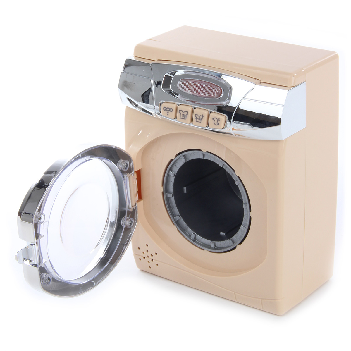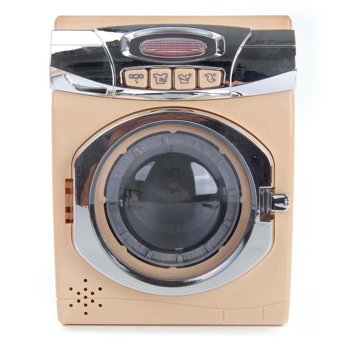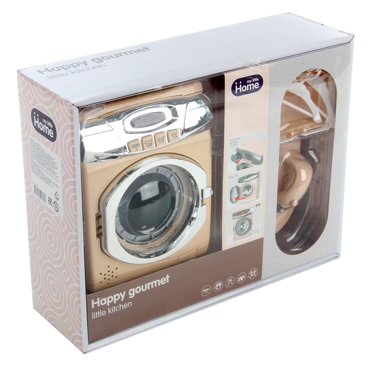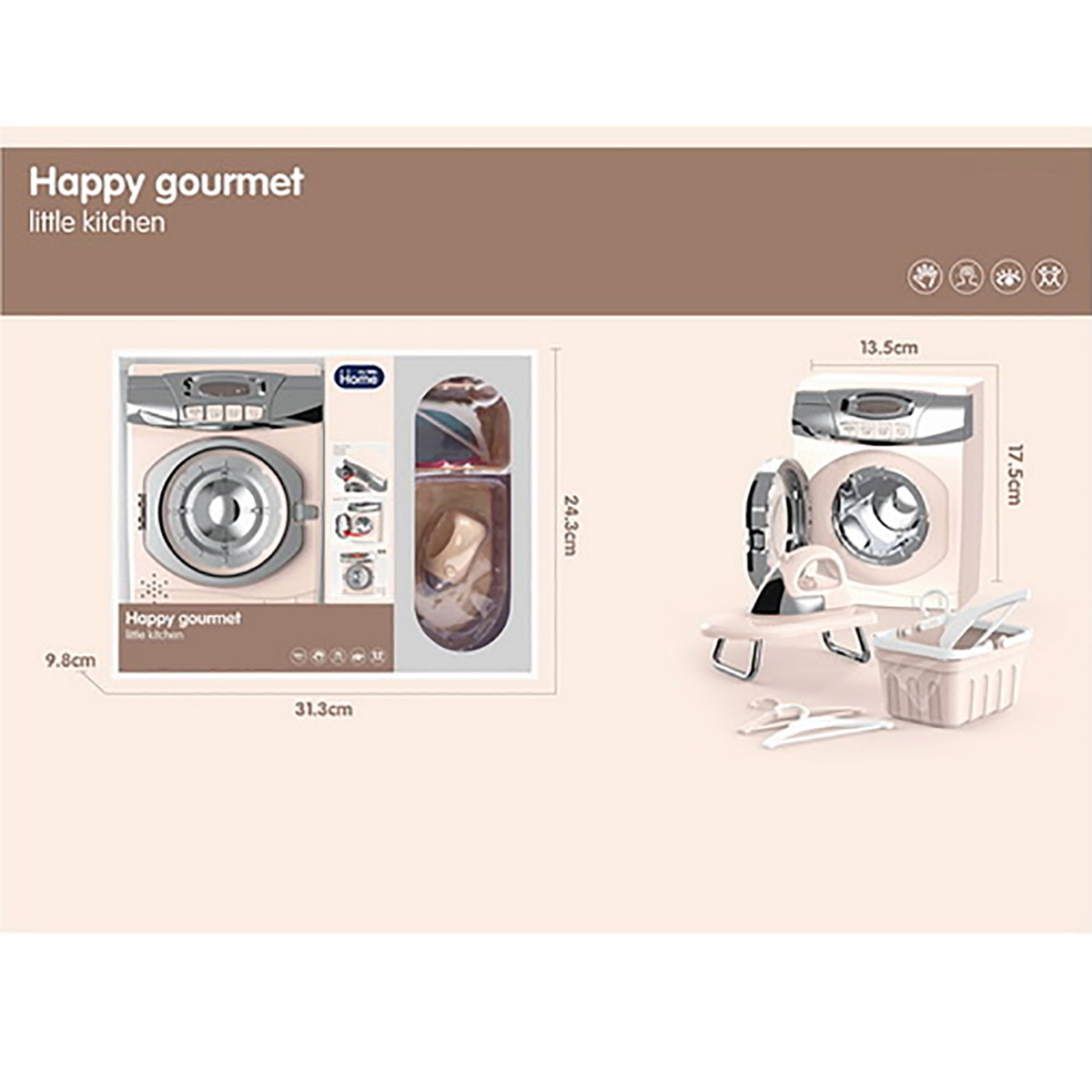 Замечательный набор для увлекательных сюжетно-ролевых игр. Оформлен в приятной расцветке, реалистичном дизайне, понравится каждому ребенку. В комплект входят стиральная машинка, корзинка для белья, гладильная доска, 2 вешалки и утюжок. Ножки гладильной доски выдвигаются. Функционал стиральной машинки: - при нажатии на кнопки, находящиеся на лицевой панели машинки, имитирует разные режимы стирки, издавая соответствующие звуки, барабан крутится; - прозрачная кнопка подсвечивается; - дверца барабана открывается вручную. Благодаря такой игрушке ребенок будет с удовольствием развивать мелкую моторику рук, координацию движений, воображение, слуховое и зрительное восприятие. Машинка работает от 3 батареек АА, не входят в комплект. Игрушка изготовлена из высококачественного и безопасного полимерного материала. Размеры машинки: 14*9*17 см. Размеры утюга: 8*5*5 см. Размеры доски в разложенном виде: 12*7*4 см. Размеры корзинки: 9*7*5 см. Размеры вешалки: 9*6 см. Размеры коробки: 31*10*24 см.