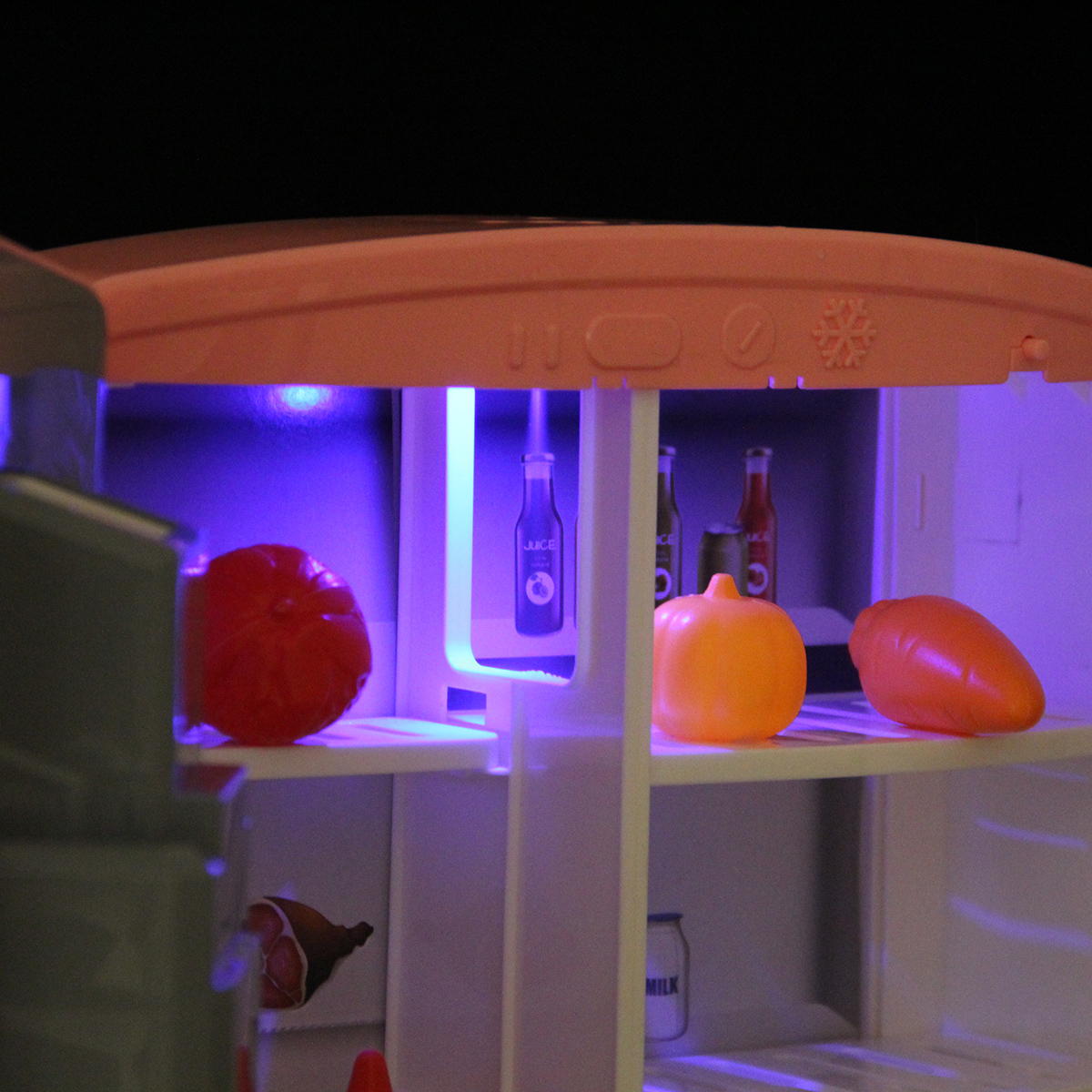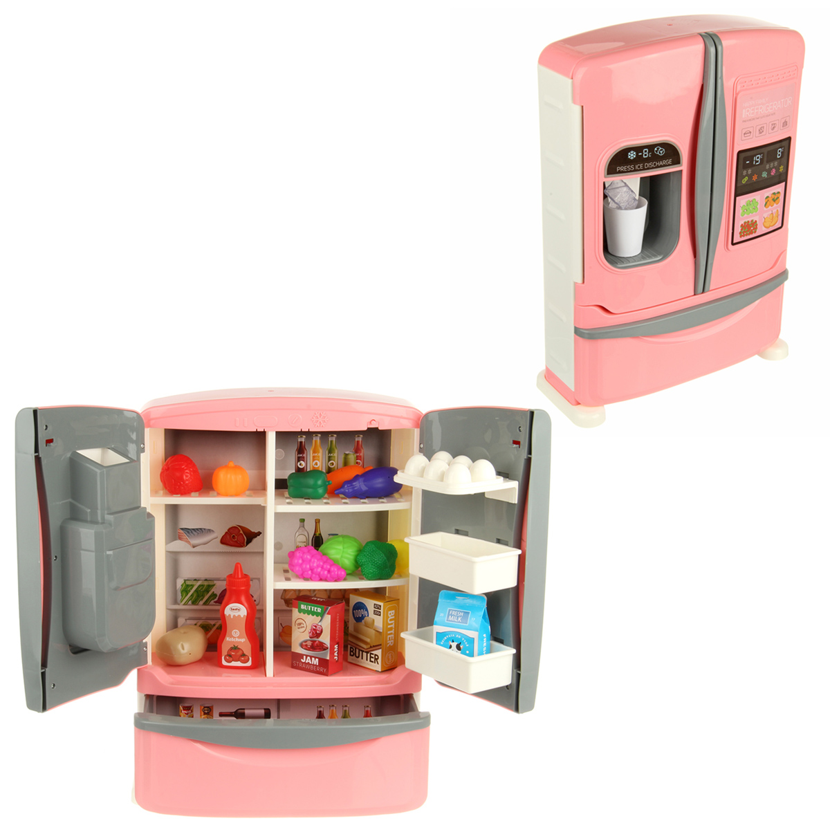 Детская игрушка холодильник на батарейках с большим количеством предметов, набором продуктов и имитацией льда.