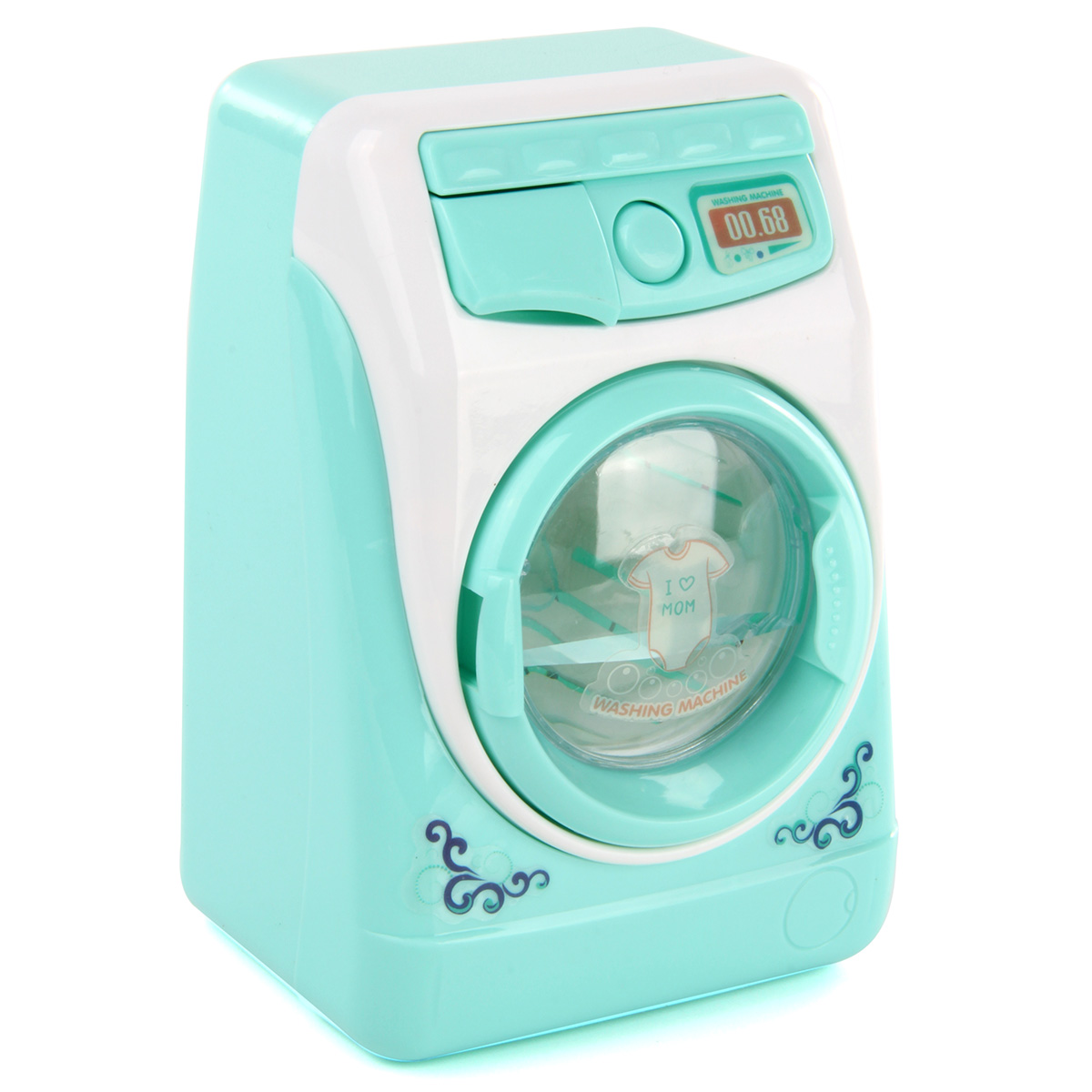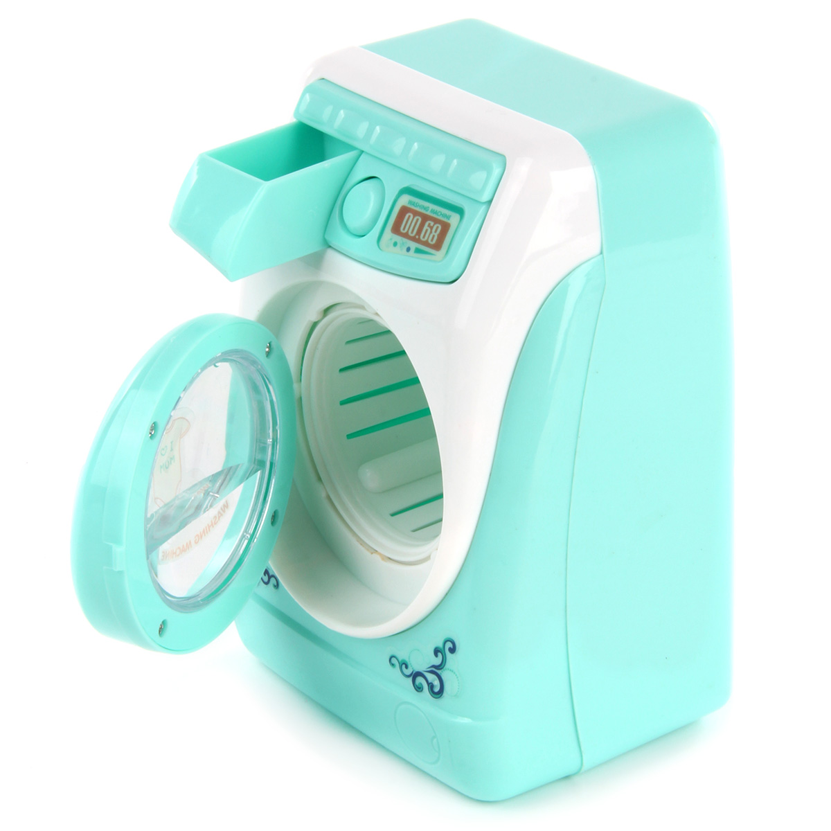 У стиральной машинки открываются отсек для порошка и дверца отсека с барабаном. Если машинку включить, нажав на кнопку на лицевой панели, барабан будет подсвечиваться и крутиться, машинка будет издавать звук работы настоящей техники. В прозрачном отсеке дверцы машинки есть жидкость, перемещается при наклоне стиральной машинки, имитируя процесс настоящей стирки.