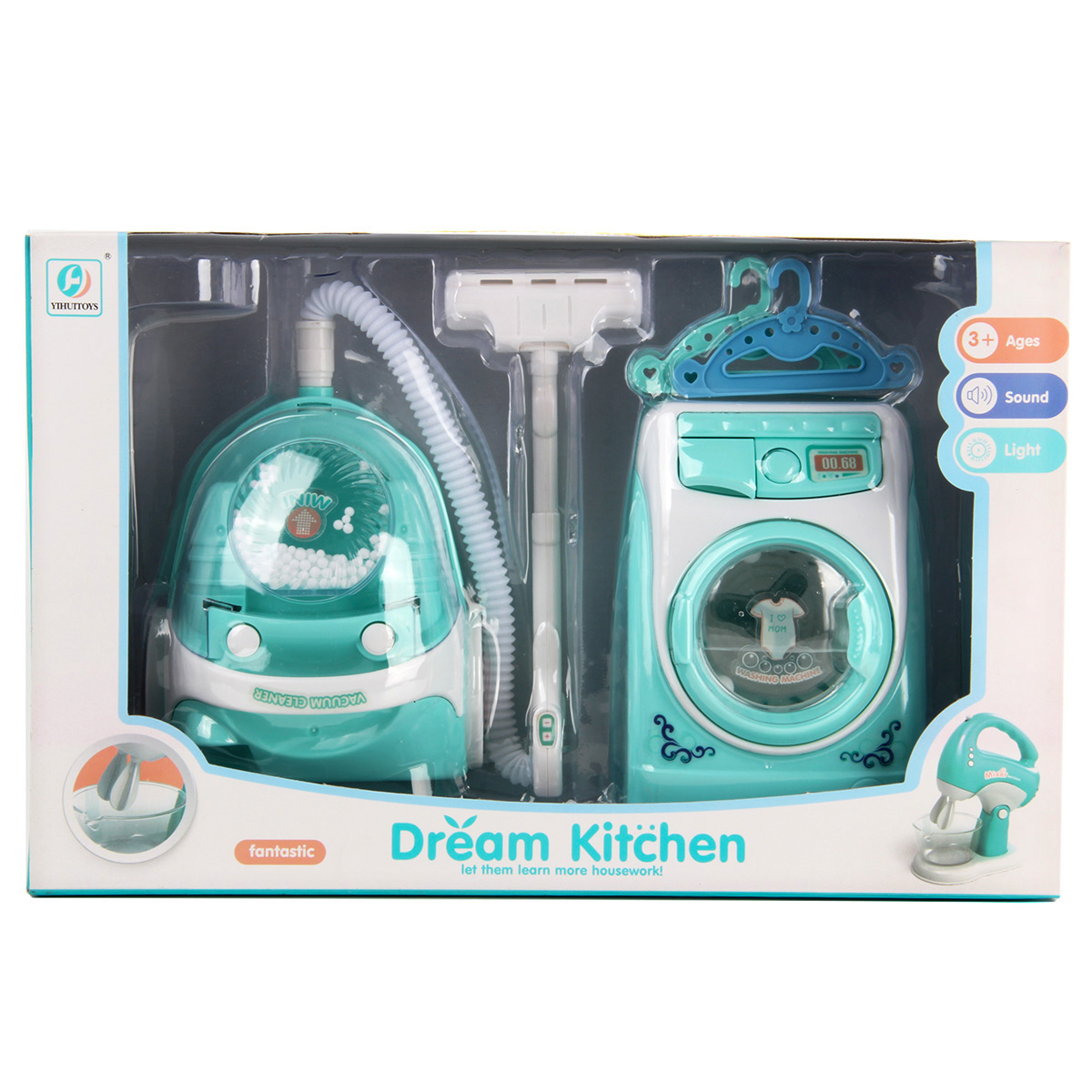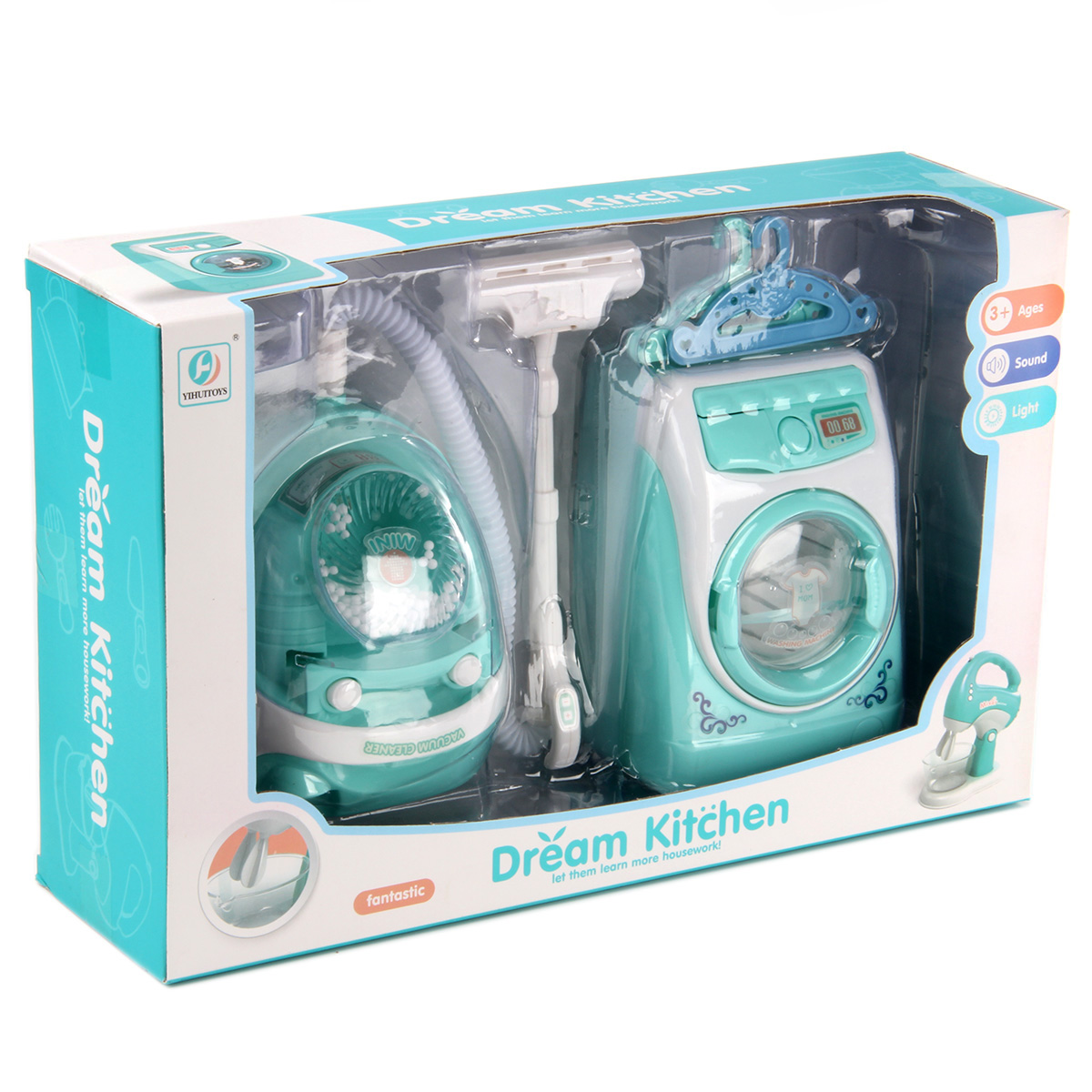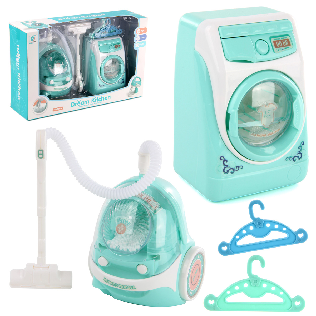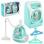 В комплект входят стиральная машинка, пылесос и 2 вешалки.