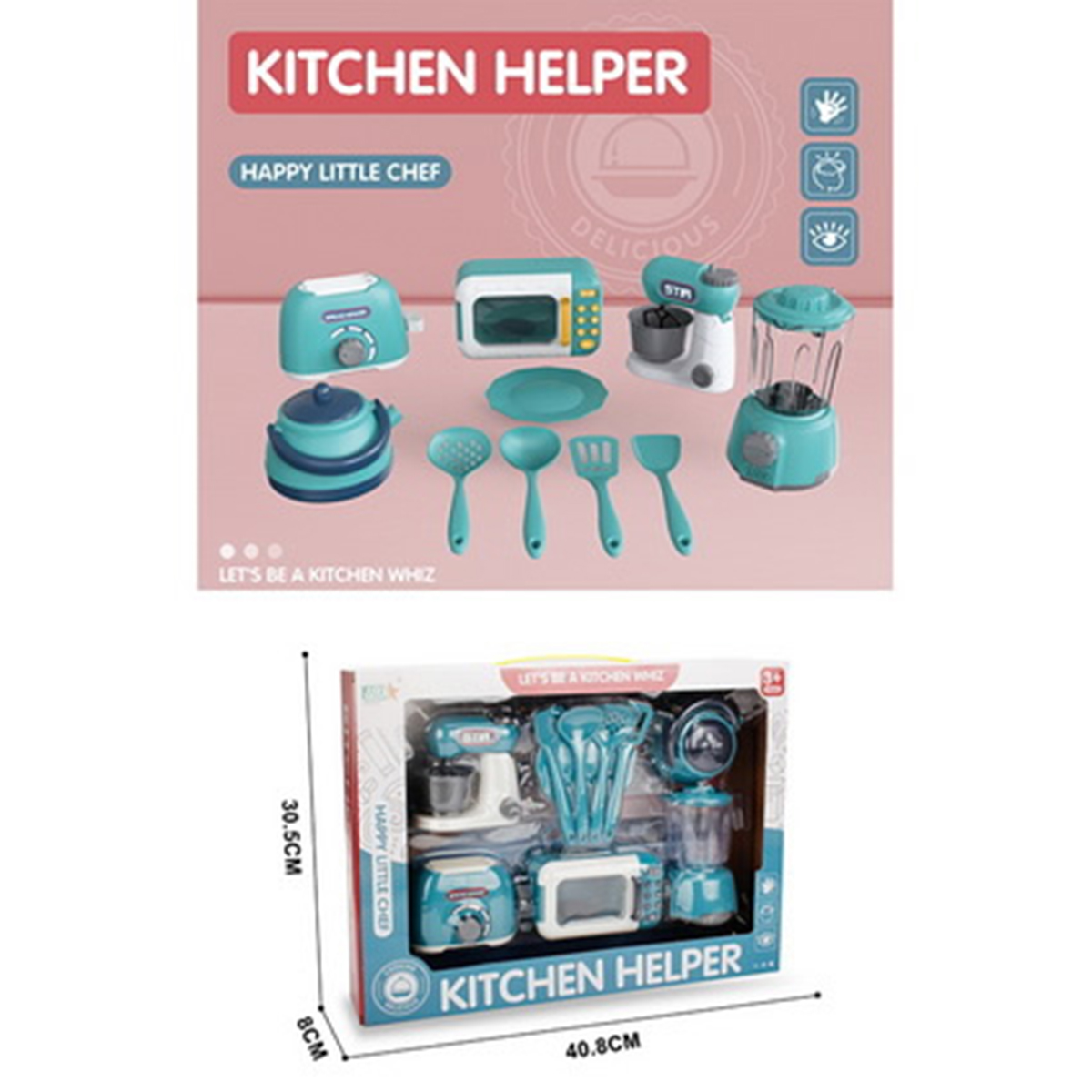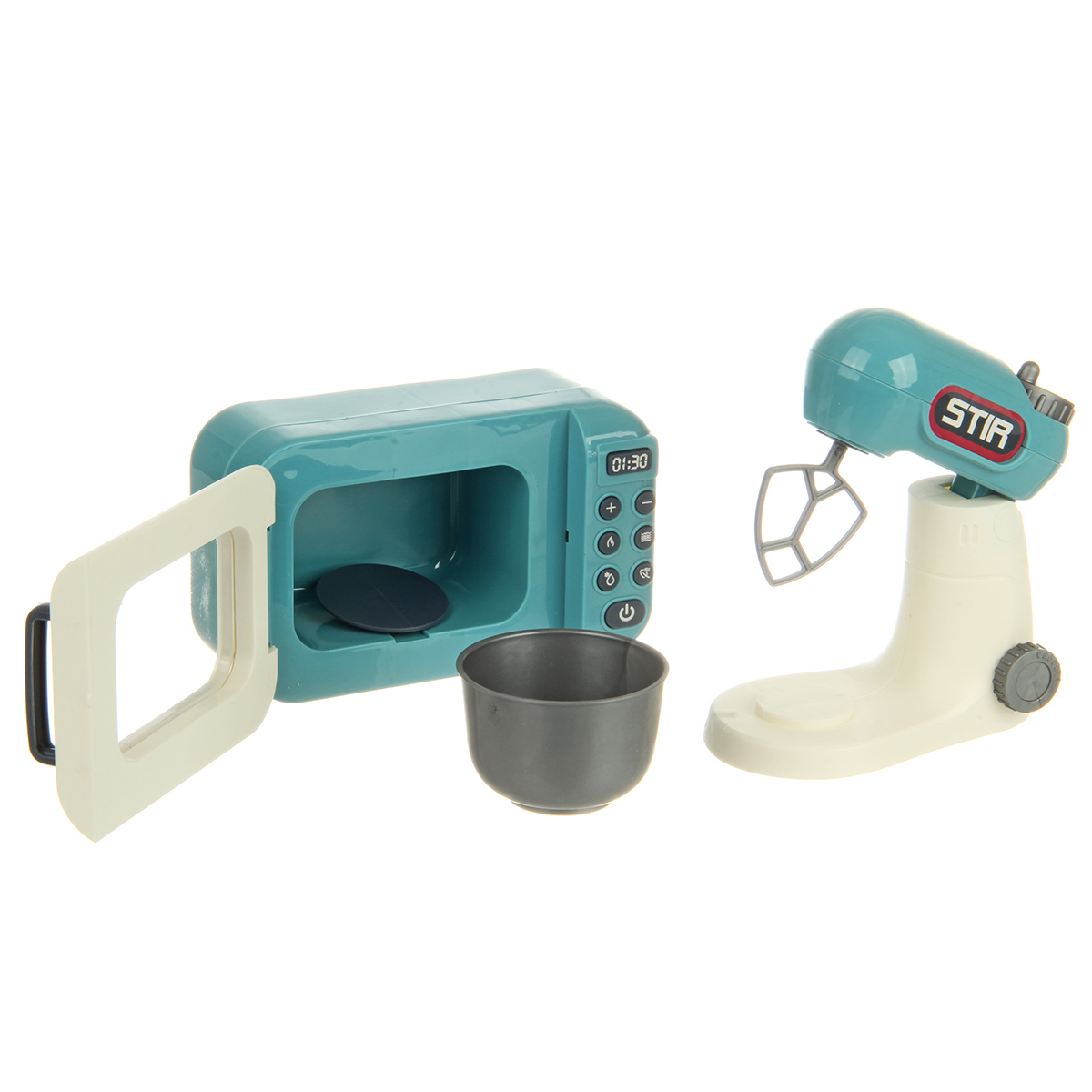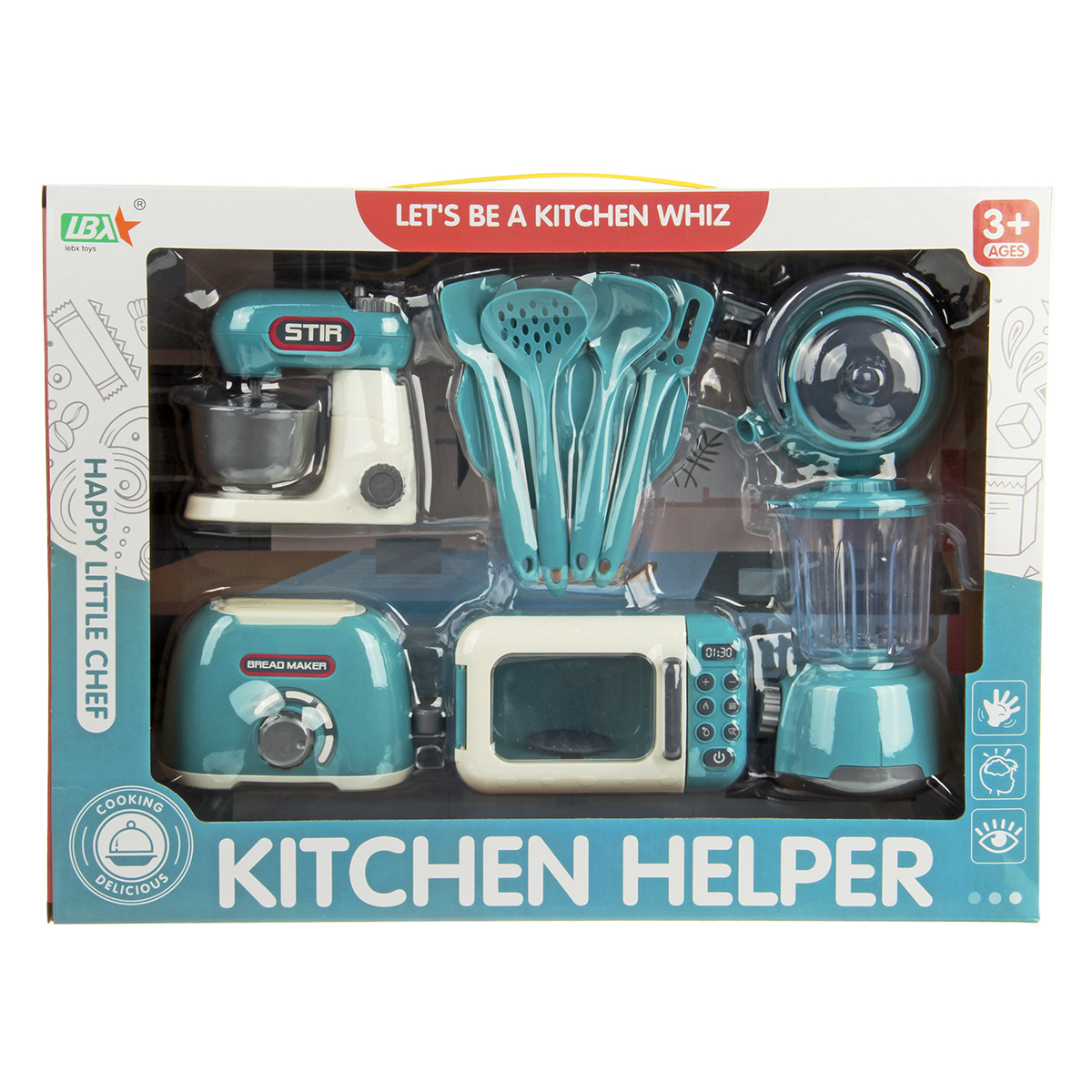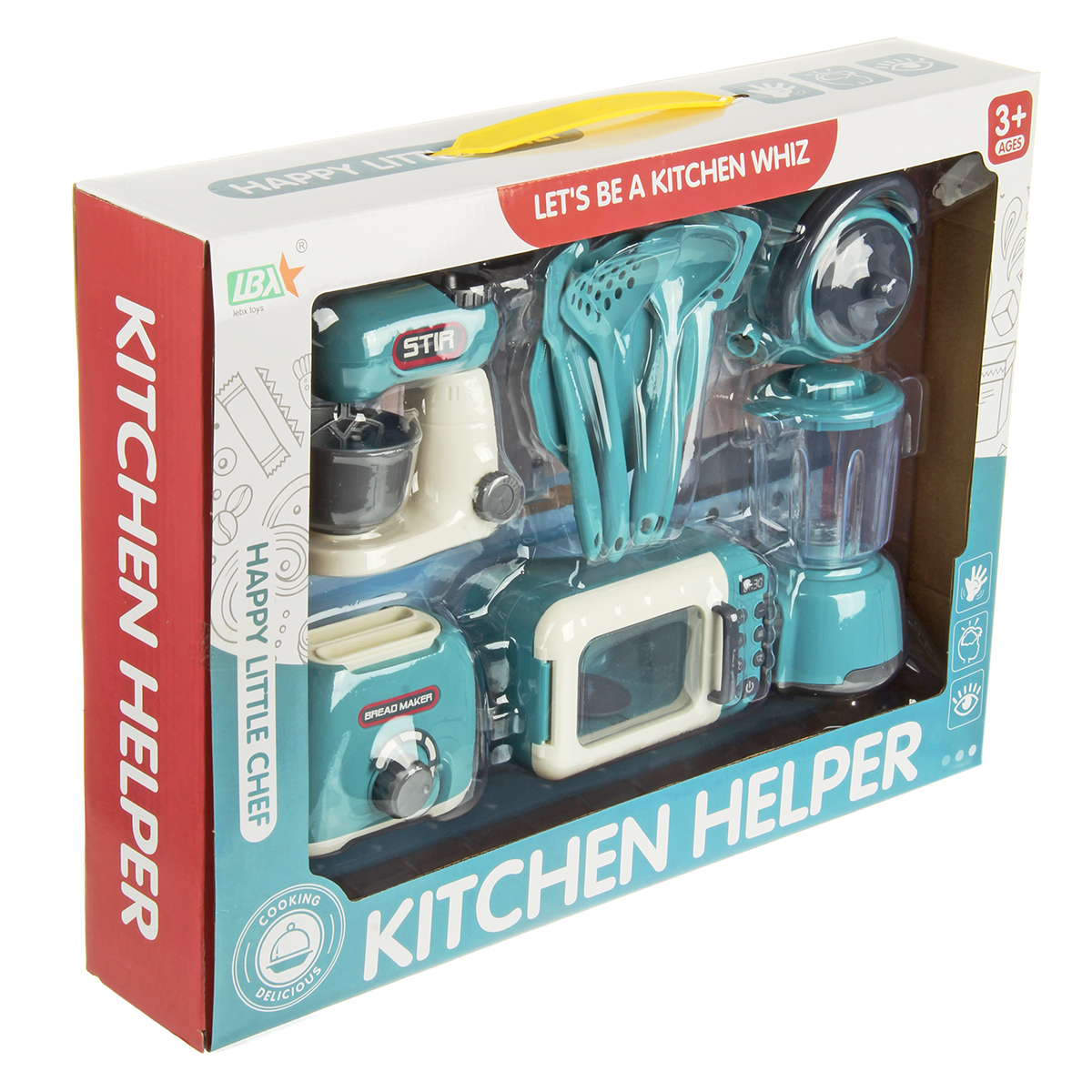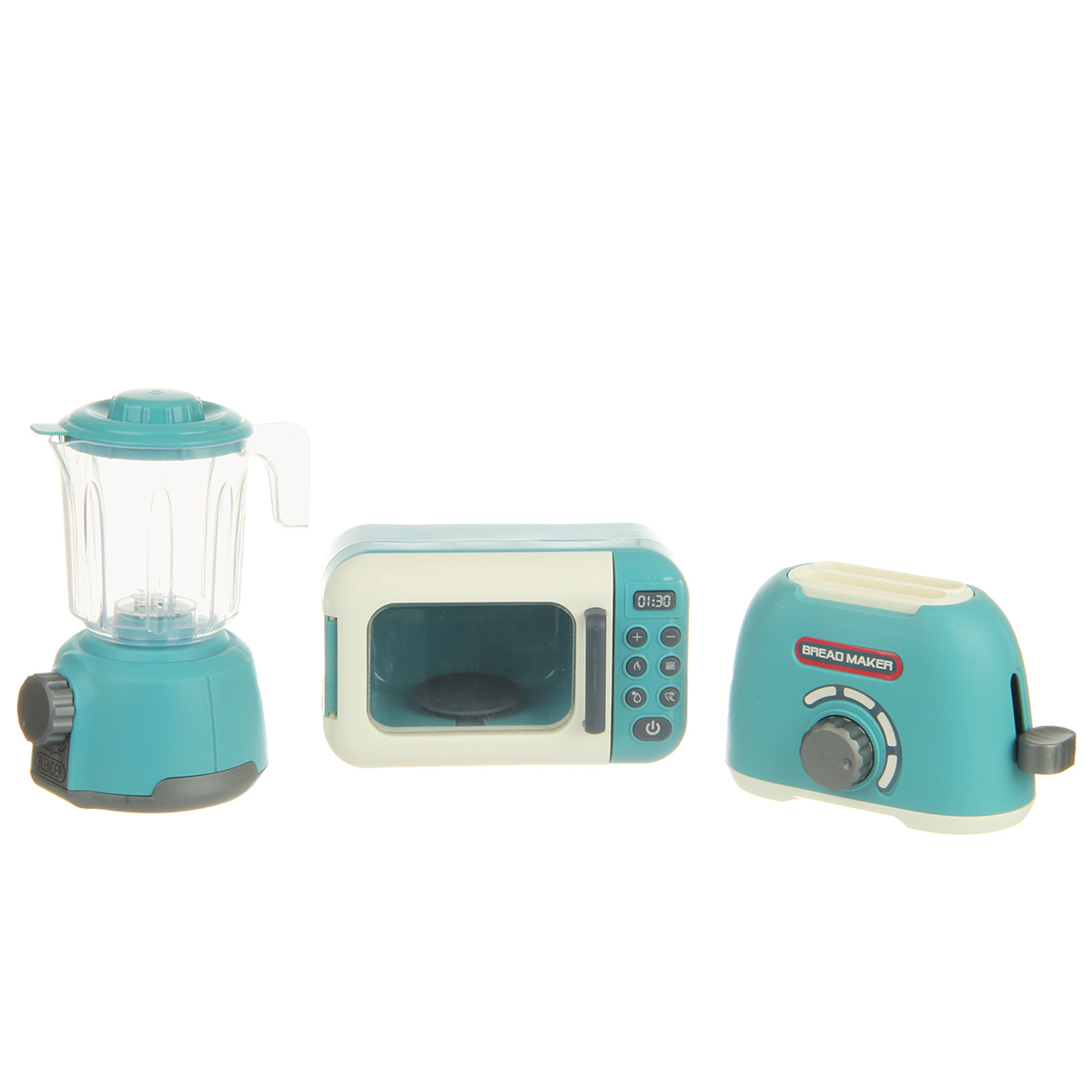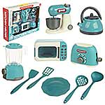 Набор бытовой техники в реалистичном дизайне. Микроволновая печь с открывающейся дверкой и крутящейся подставкой, миксер с поднимающейся моторной головкой, тостер с кухонными приборами в комплекте. Большое количество предметов, подвижные детали, качественное исполнение. Игрушечная бытовая техника изготовлена из прочных и безопасных материалов. Набор кухонный детский станет замечательным подарком для детей на Новый год и День рождения, поставляется в красивой упаковке.
