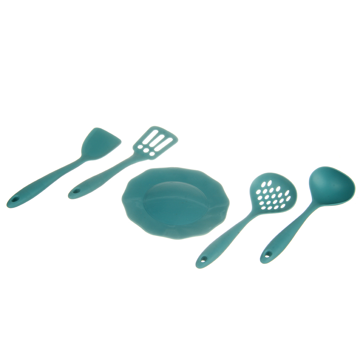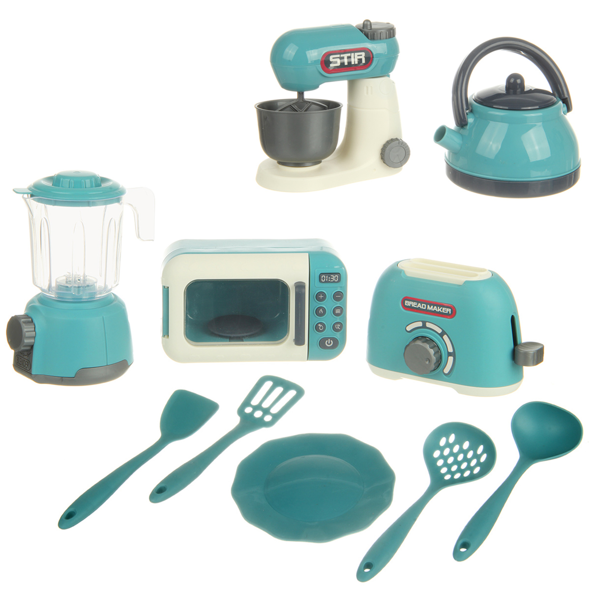 В наборе тостер, миксер с чашей, блендер, микроволновка, чайник, 4 кухонных прибора, тарелка.