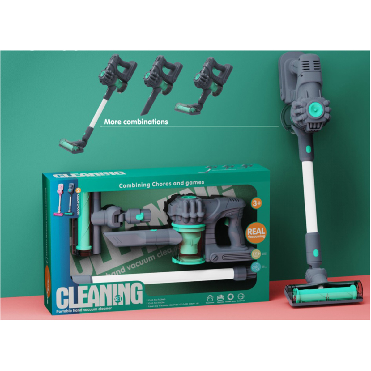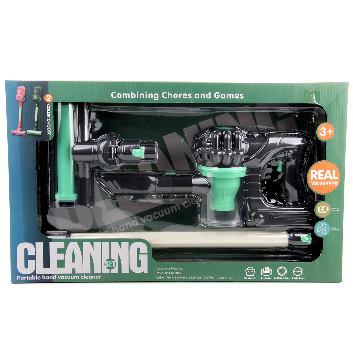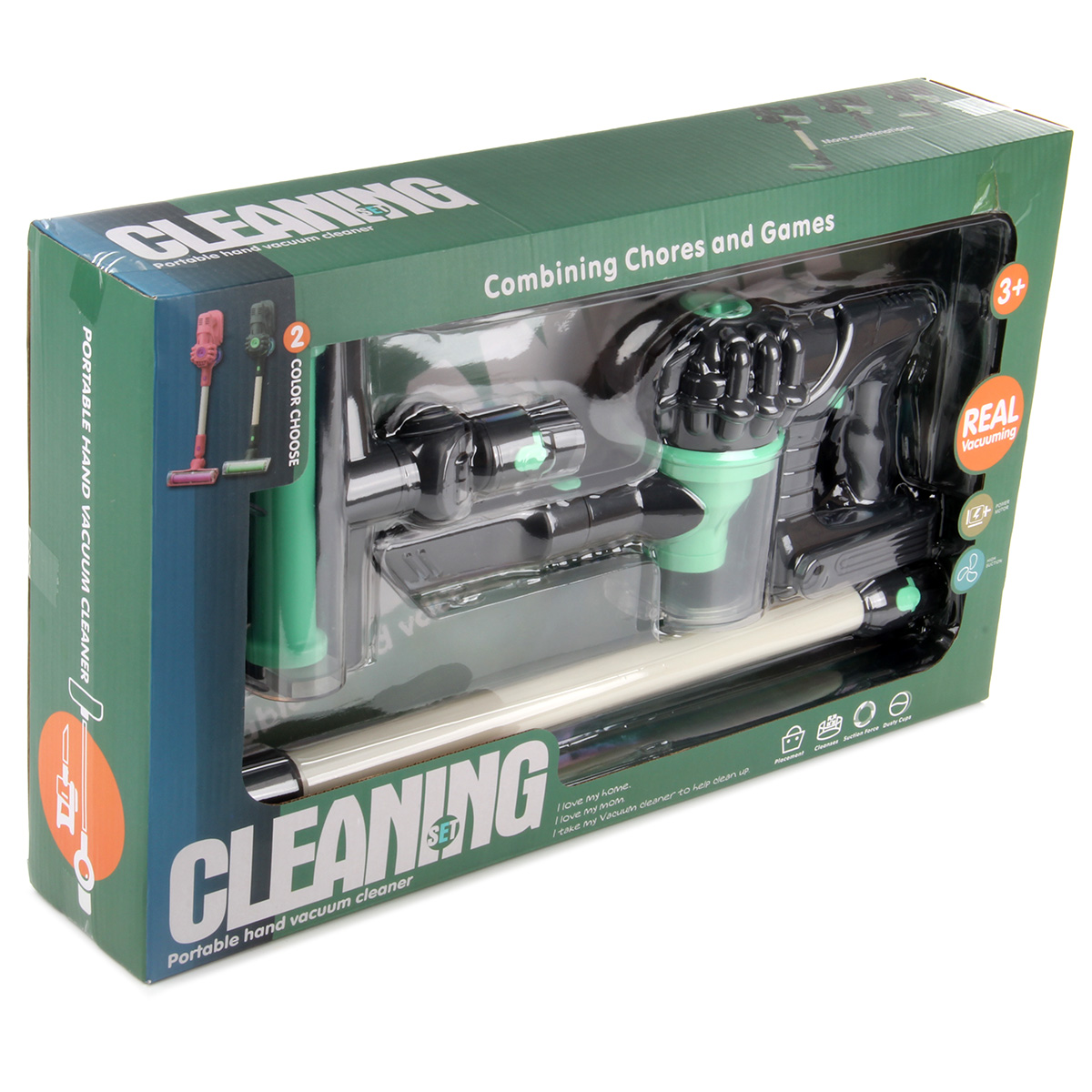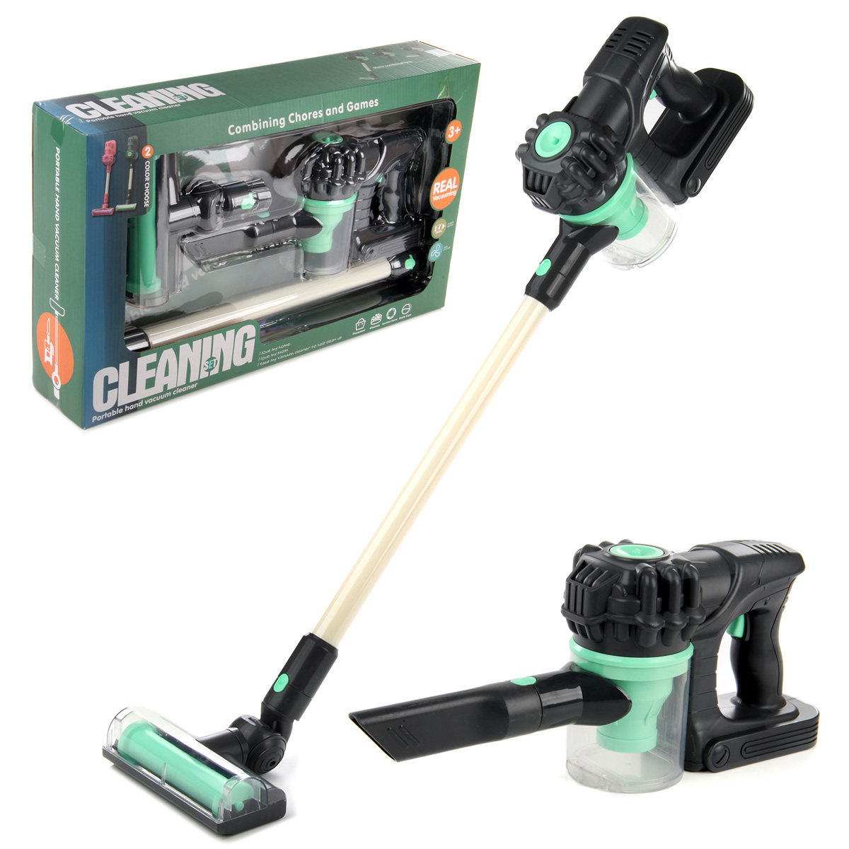 Этот игрушечный пылесос придется по душе каждой маленькой хозяюшке. Игрушка выполнена в реалистичном дизайне. В комплект входит пылесос, 2 насадки, штанга. Пылесос работает от батареек АА 5 шт., не входят в комплект. Функционал пылесоса: -при включении начинает всасывать воздух; -отсек для пыли подсвечивается; -насадки легко меняются; -щётка поднимается и опускается; -щётка оснащена колёсиками, двигается вперёд назад; -насадки надеваются на штангу; -отсек для пыли открывается и закрывается. Размеры упаковки: 51*11*31 см. Размеры пылесоса без насадок: 24*10*15 см. Размеры штанги: 44*4*4 см. Размеры щётки: 17*17*5 см. Изготовлено из пластика.