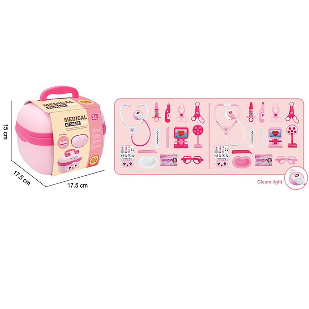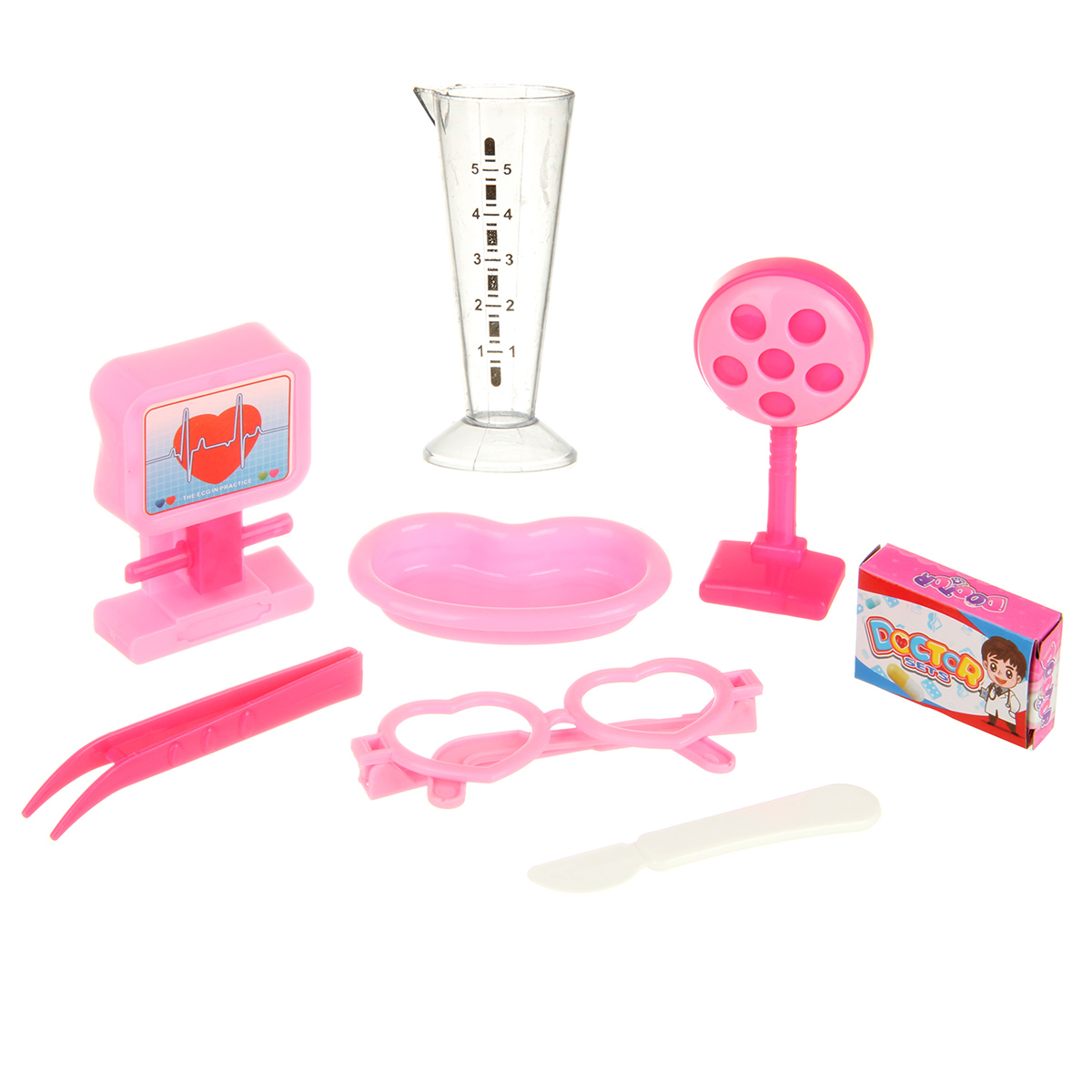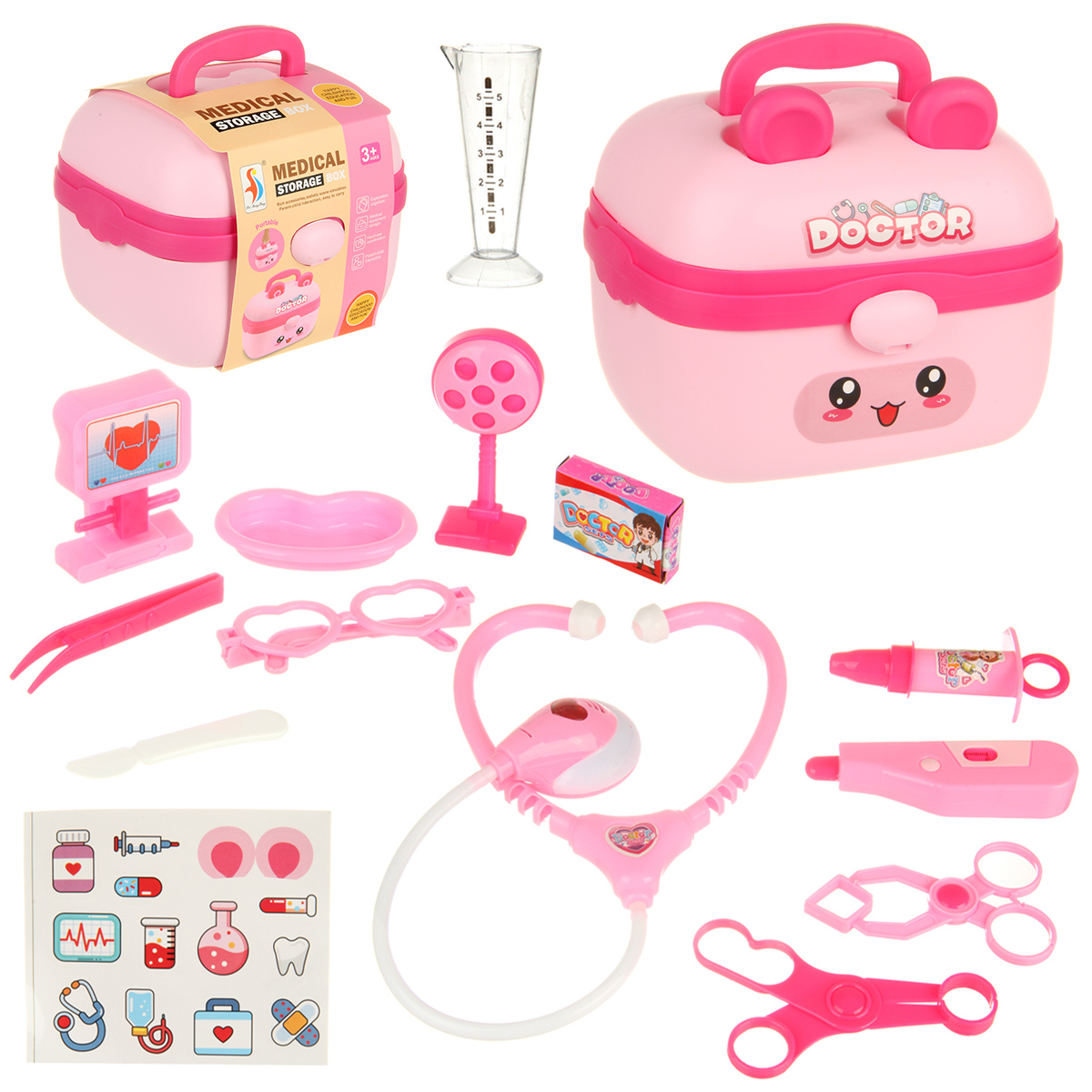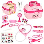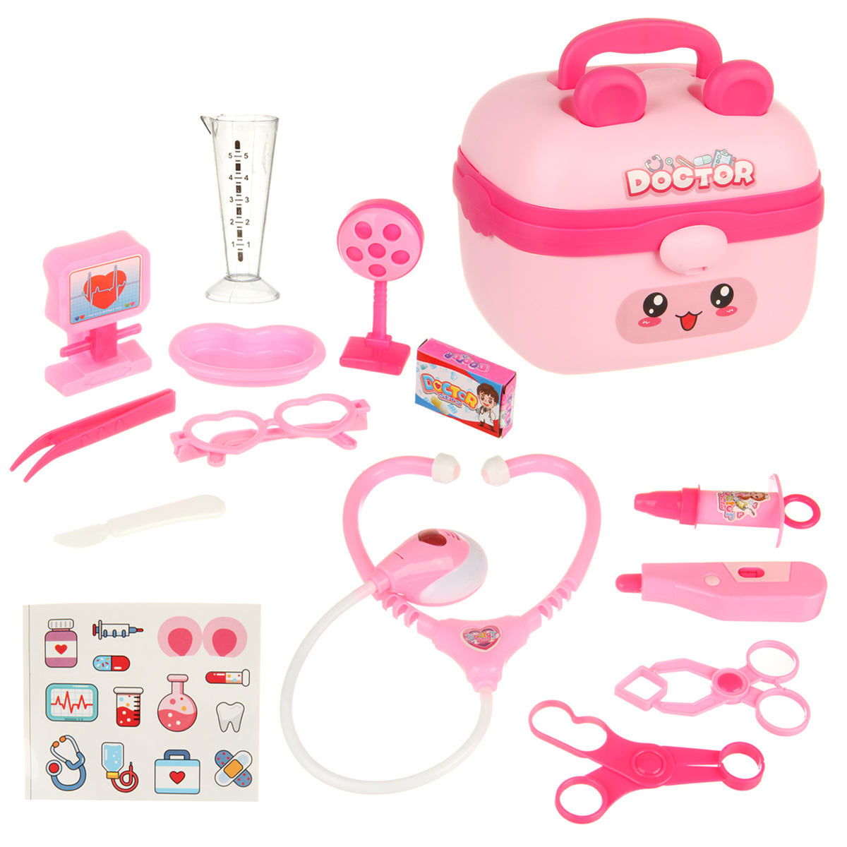В наборе стетоскоп, лоток, градусник, шприц, зажим, пинцет, 2 врачебных инструмента, очки, монитор, мензурка, скальпель, пустая коробочка имитация лекарств, чемоданчик упаковка, набор наклеек.