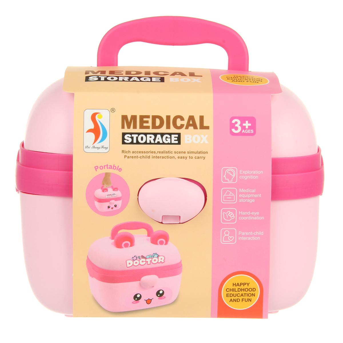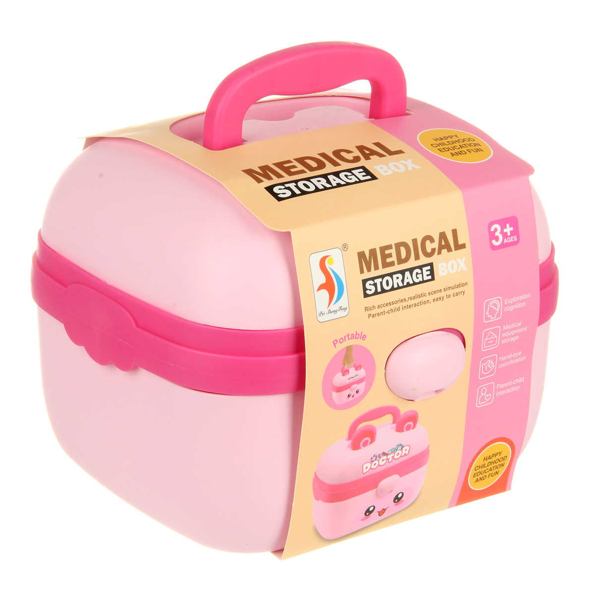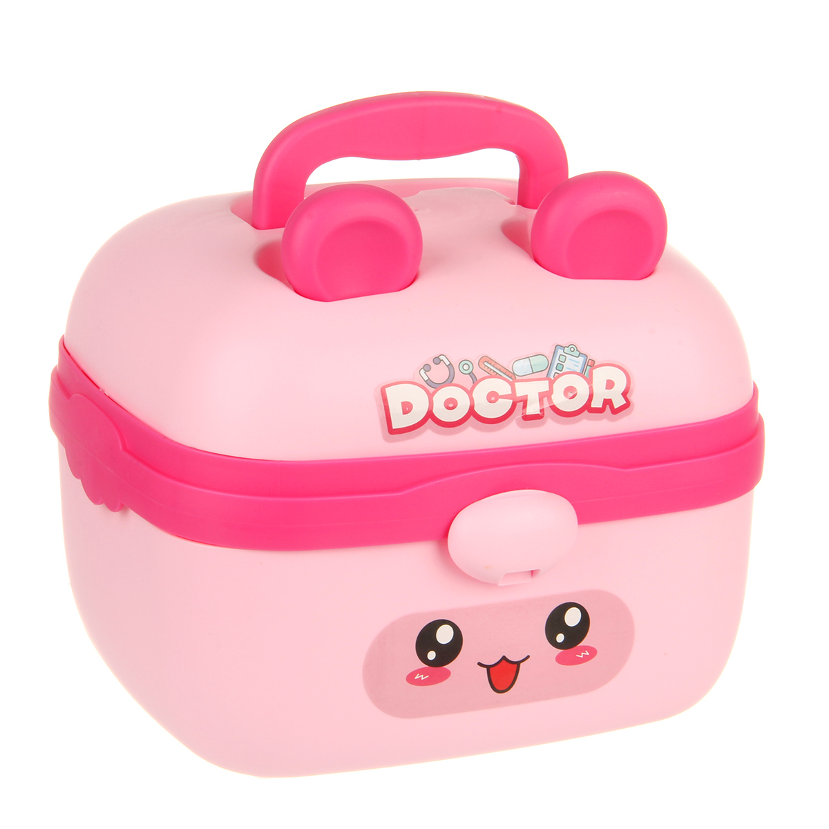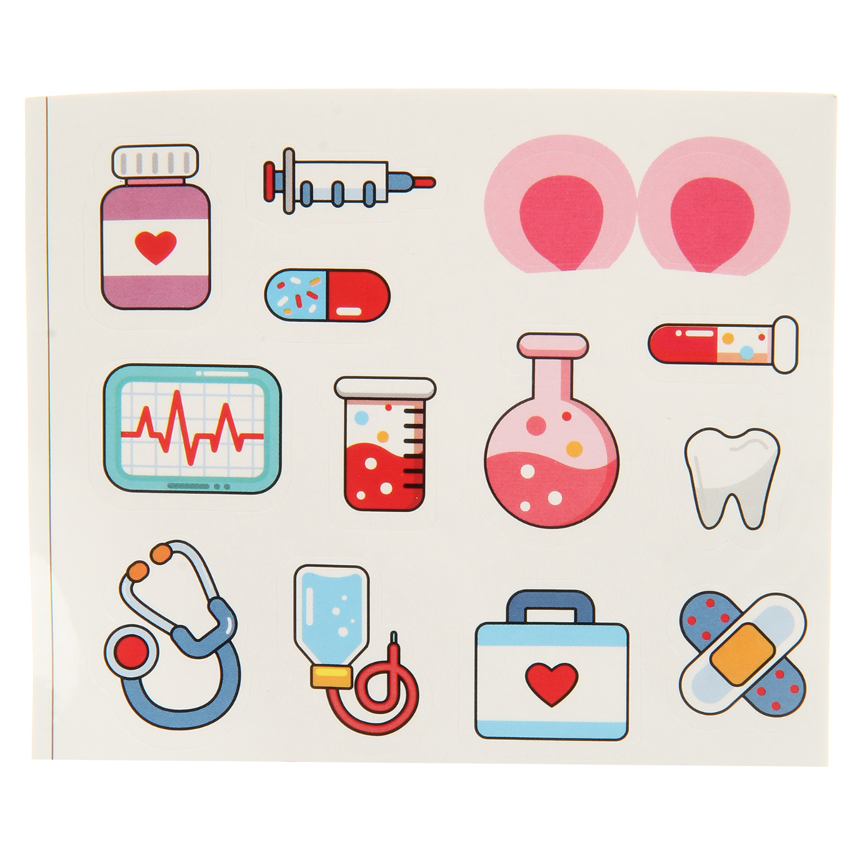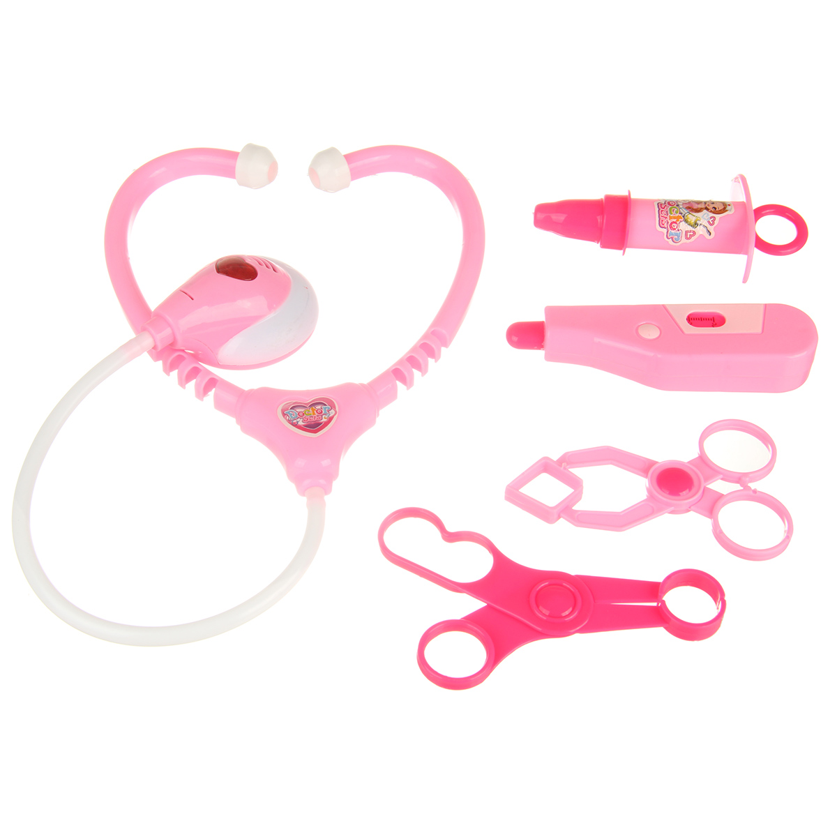 В наборе стетоскоп, лоток, градусник, шприц, зажим, пинцет, 2 врачебных инструмента, очки, монитор, мензурка, скальпель, пустая коробочка имитация лекарств, чемоданчик упаковка, набор наклеек.