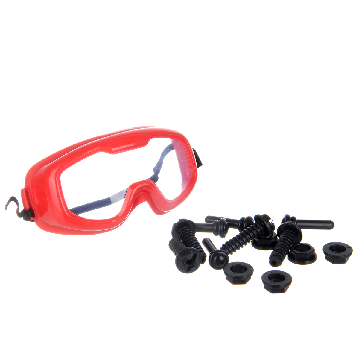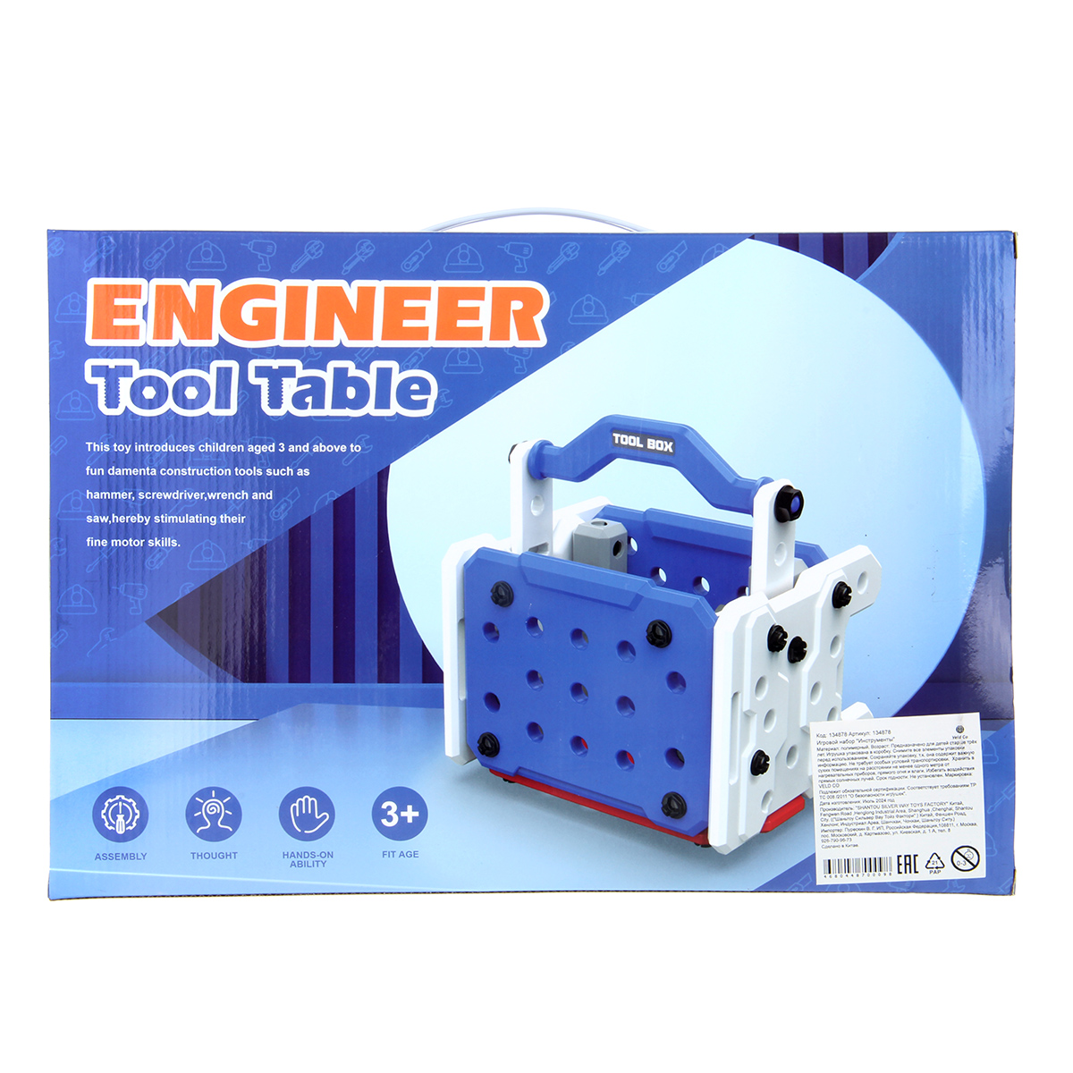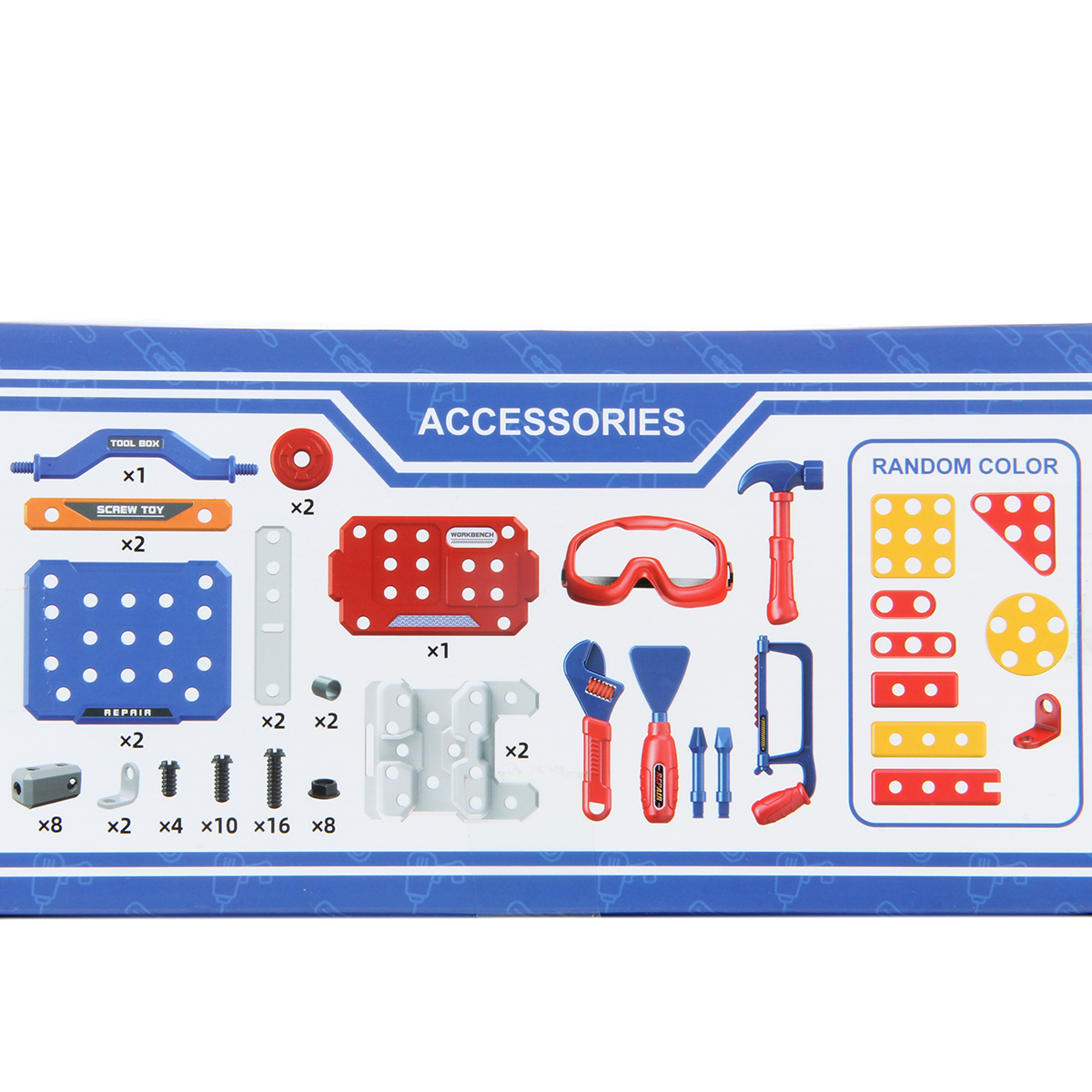 В наборе детали для сборки верстака, очки, молоток, отвертка, 3 насадки к ней, ножовка, разводной ключ, 2 шайбы, 9 элементов для скрутки, 5 гвоздей, болты 35 шт, гайки 13 шт, инструкция по сборке, набор наклеек.