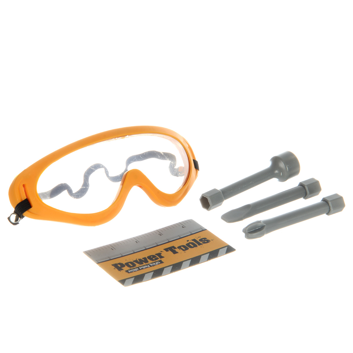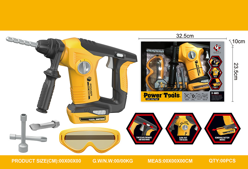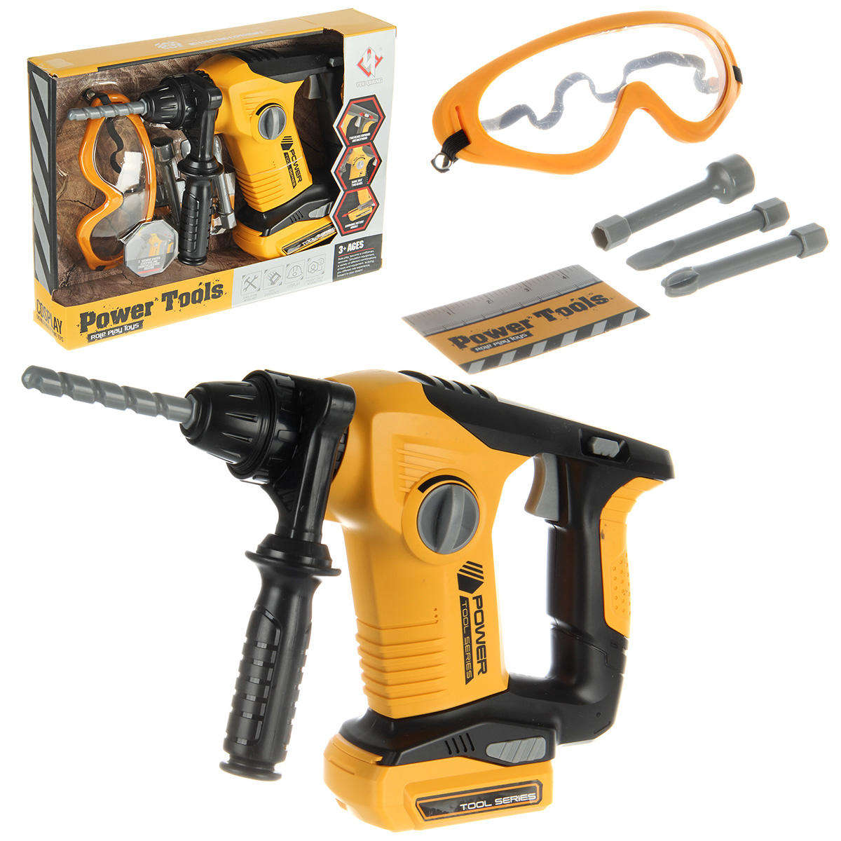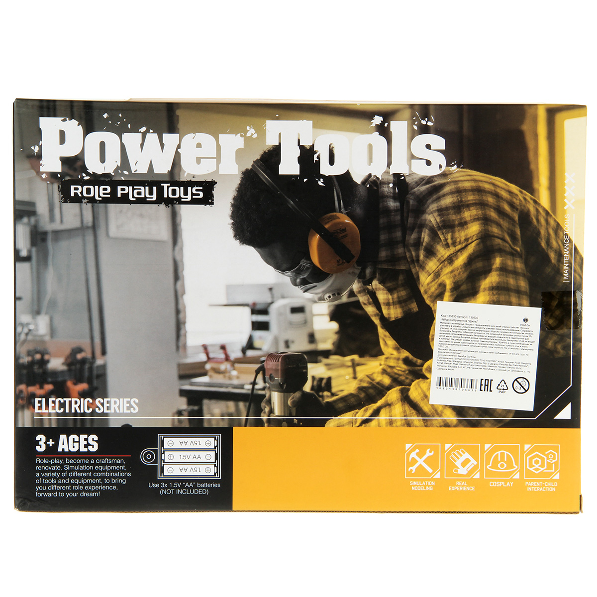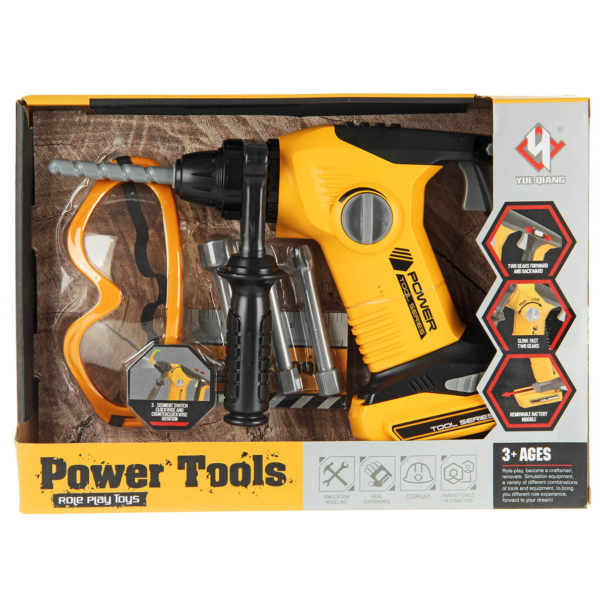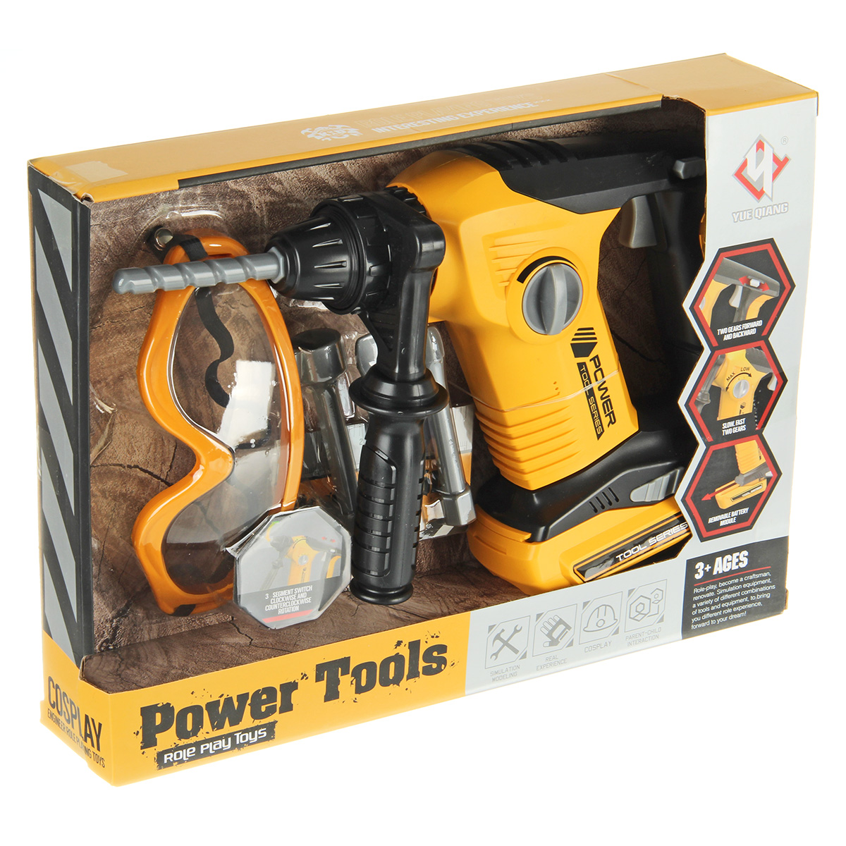Набор инструментов в реалистичном дизайне. Дрель с вращением патрона по часовой и против часовой стрелки, 2 скорости вращения, более быстрая и более медленная, съемный аккумулятор, красивая подсветка, сменные насадки, рукоять удобная для хвата, очки на резинке. Прочные и долговечные материалы, качественное исполнение, внимание к деталям, привлекательная расцветка. Ребёнок будет учиться обращаться с домашним инструментом.