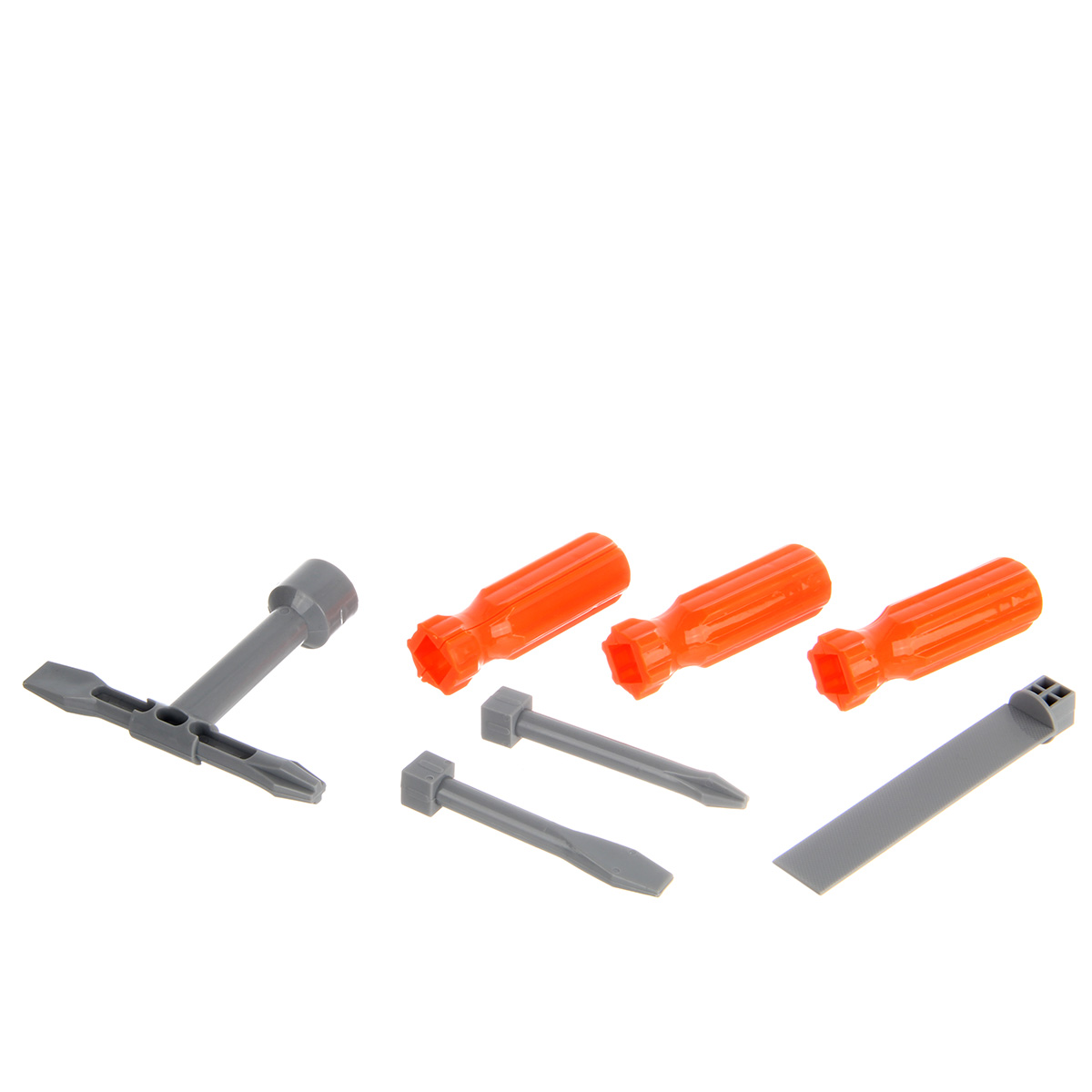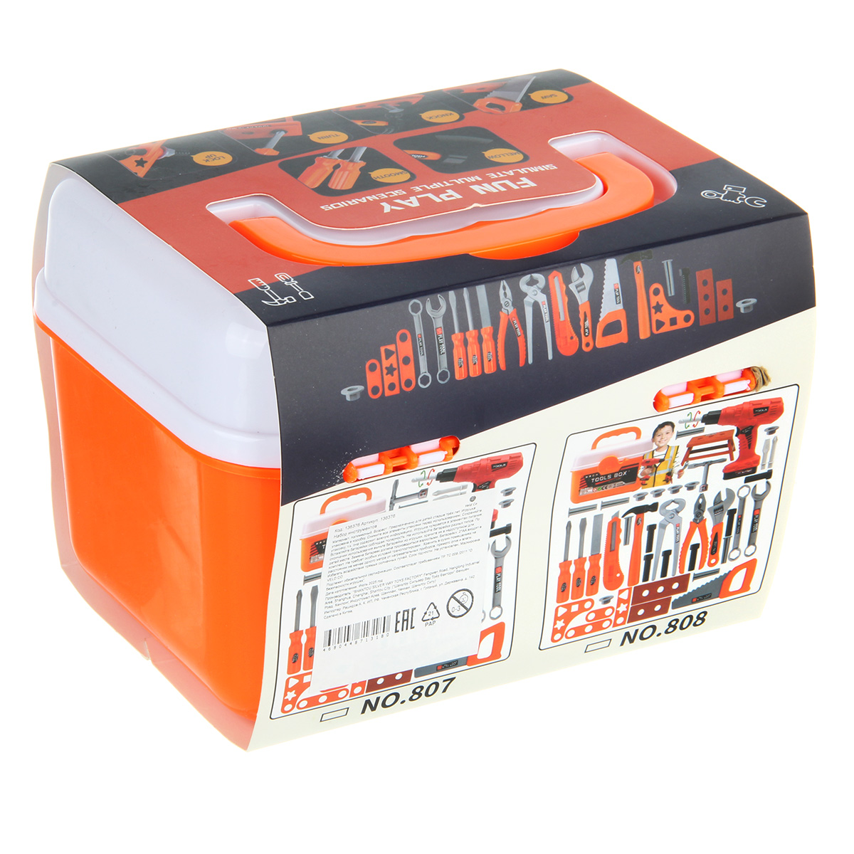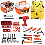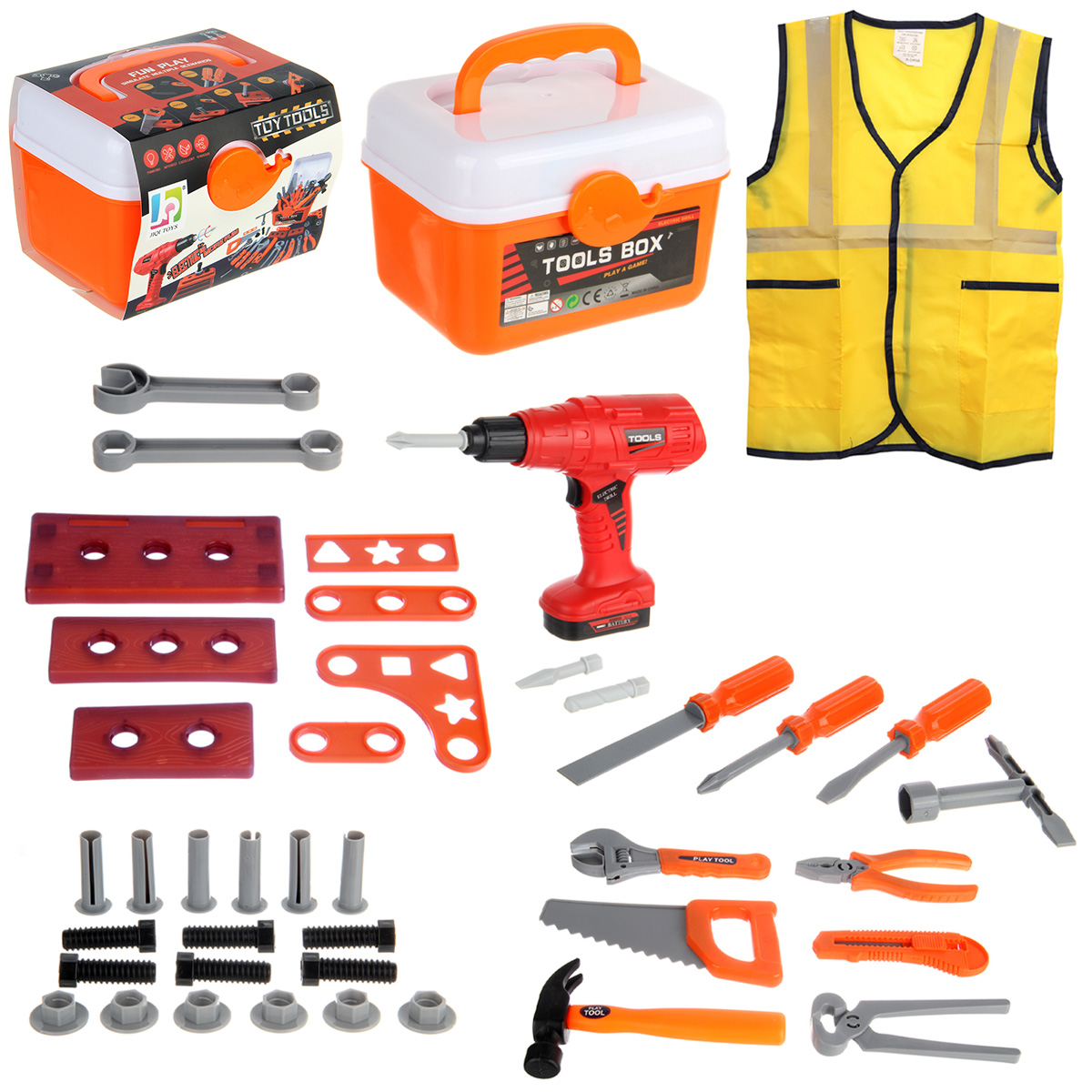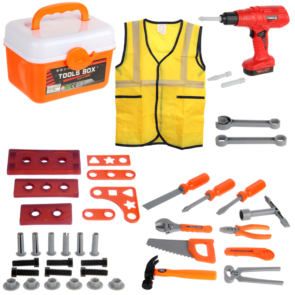 Строительный набор с большим количеством аксессуаров. Шуруповерт с вращением патрона по и против часовой стрелки, строительные инструменты с безопасными закругленными углами, имитация лезвия у канцелярского ножа выдвигается, у пассатижей и клещей расходятся ручки, прокрутка винтового механизма приводит в движение губку разводного ключа, винты вкручиваются в гайки и в элементы для скрутки, гвозди вкручиваются в элементы для скрутки, можно вкручивать шуруповертом или отвертками. Можно собрать мини верстак. Изготовлено из прочных и долговечных материалов в качественном исполнении.