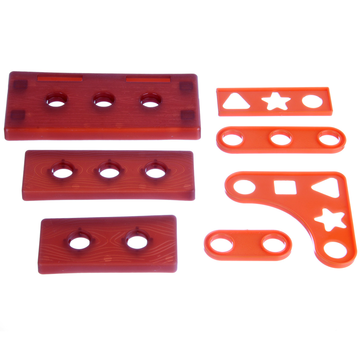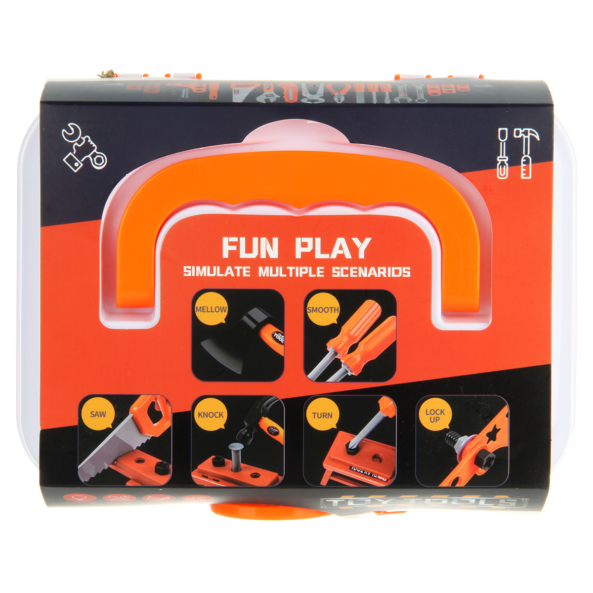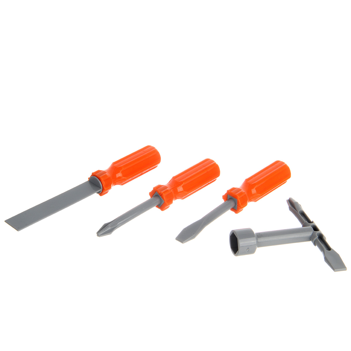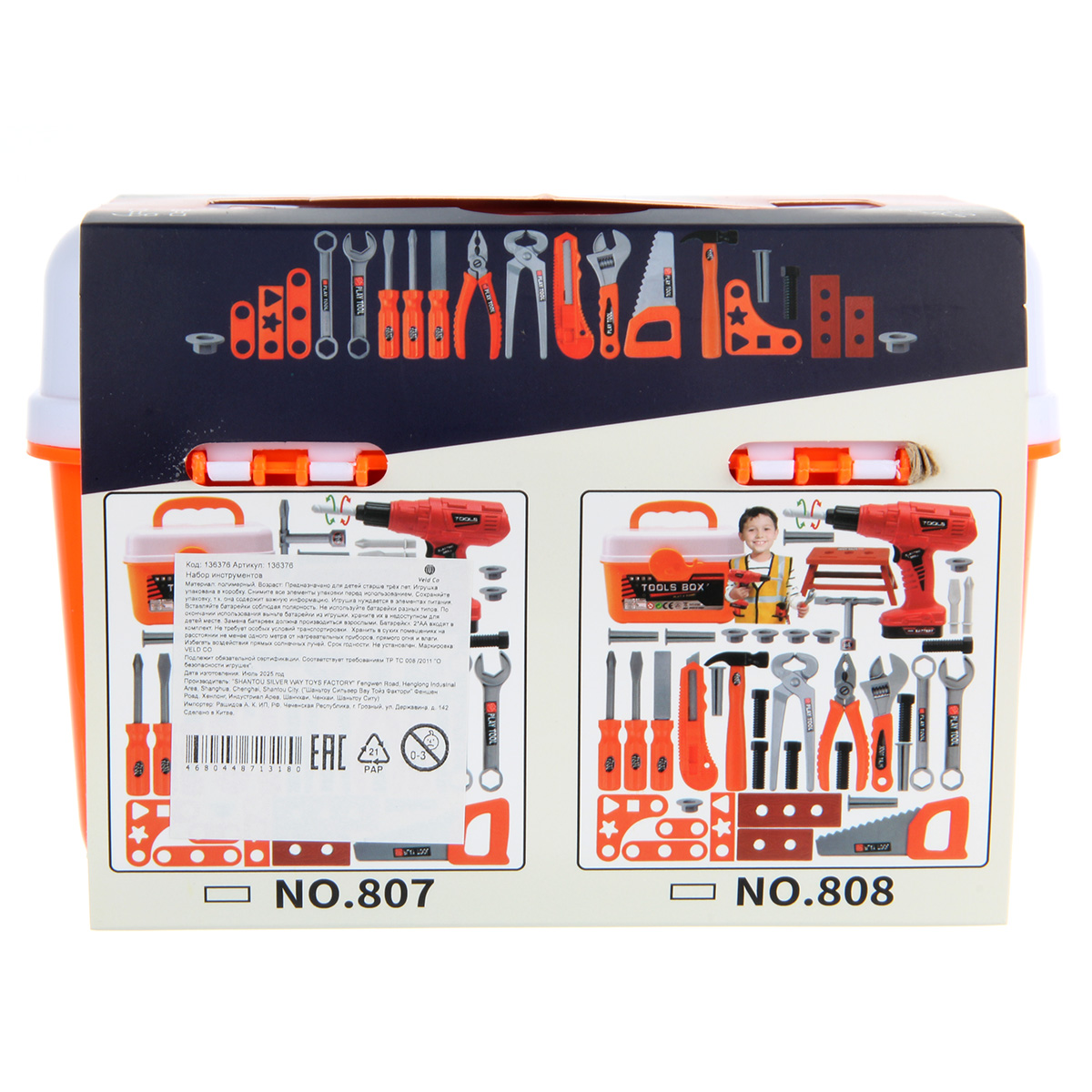 Строительный набор с большим количеством аксессуаров. Шуруповерт с вращением патрона по и против часовой стрелки, строительные инструменты с безопасными закругленными углами, имитация лезвия у канцелярского ножа выдвигается, у пассатижей и клещей расходятся ручки, прокрутка винтового механизма приводит в движение губку разводного ключа, винты вкручиваются в гайки и в элементы для скрутки, гвозди вкручиваются в элементы для скрутки, можно вкручивать шуруповертом или отвертками. Можно собрать мини верстак. Изготовлено из прочных и долговечных материалов в качественном исполнении.