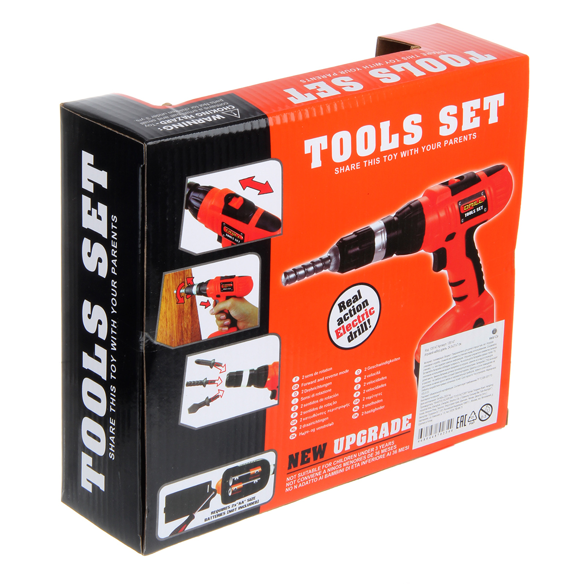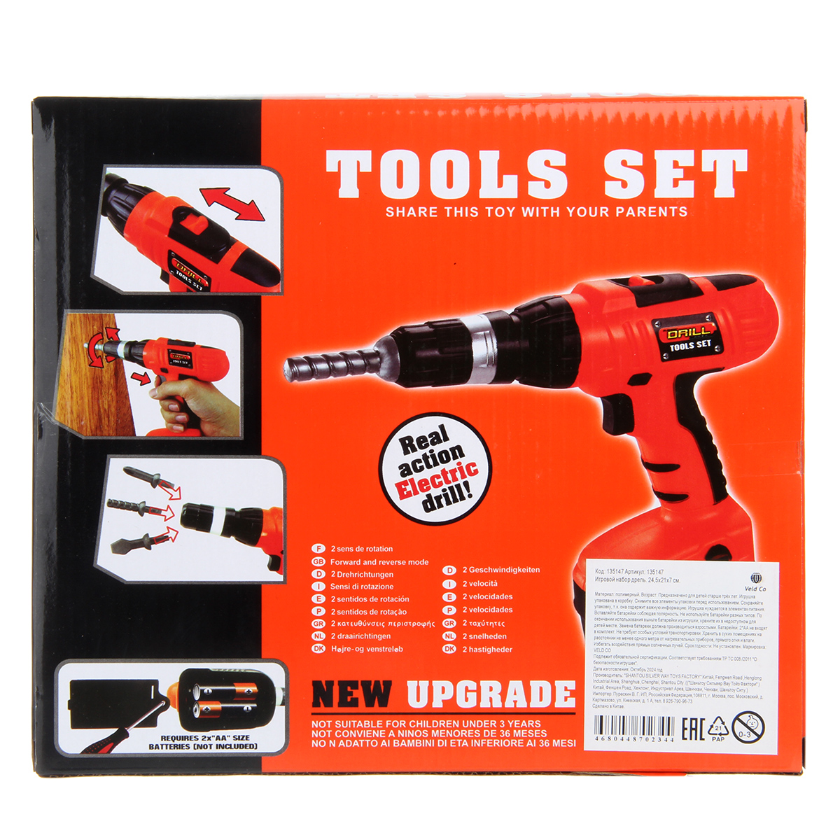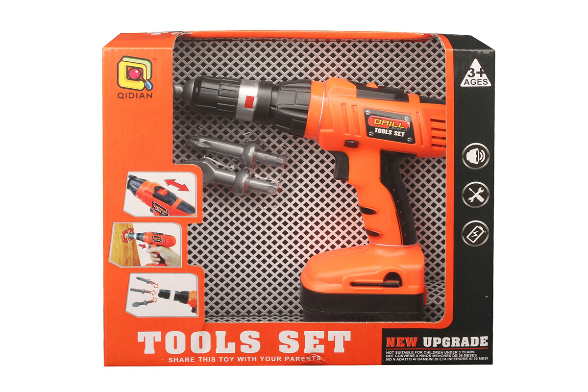 Игрушка шуруповерт работает от 2 батареек АА, не входят в комплект.
