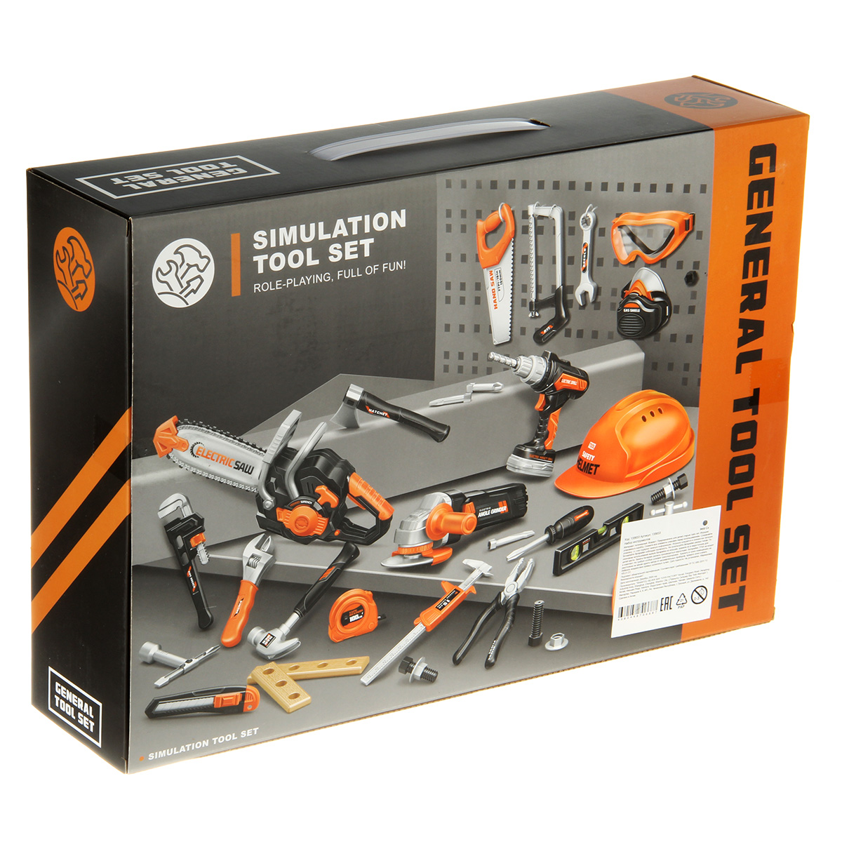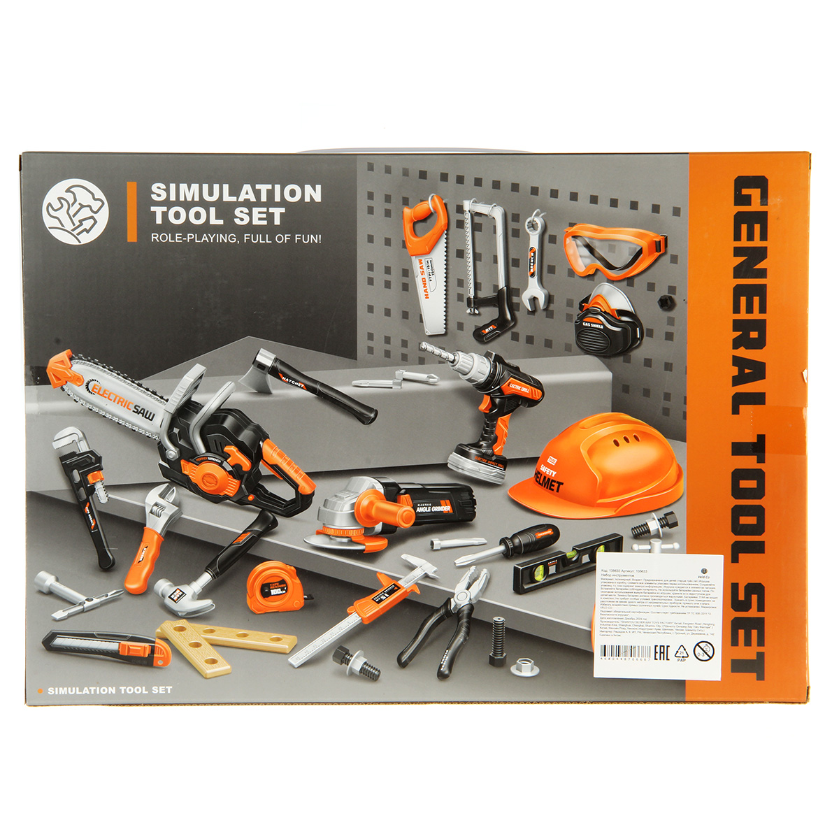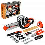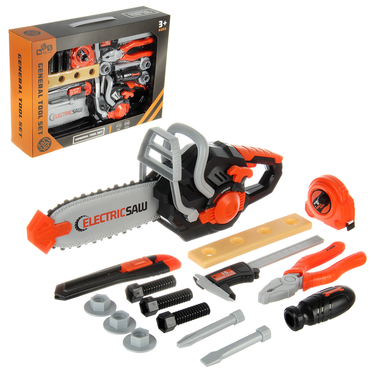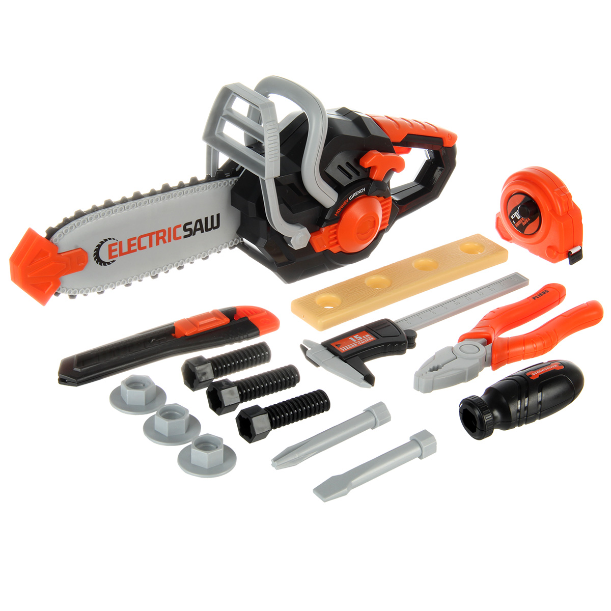 Набор игрушечных инструментов со множеством аксессуаров. Бензопила в реалистичном дизайне, издает звук работающей техники, имеет подвижную прорезиненную цепь с безопасными закругленными зубцами. Подвижные элементы инструментов, отвертка со съемными насадками, рулетка с выдвижной лентой на 100 см. Игровой набор для мальчика изготовлен из прочных и долговечных материалов, качественное исполнение, внимание к деталям.