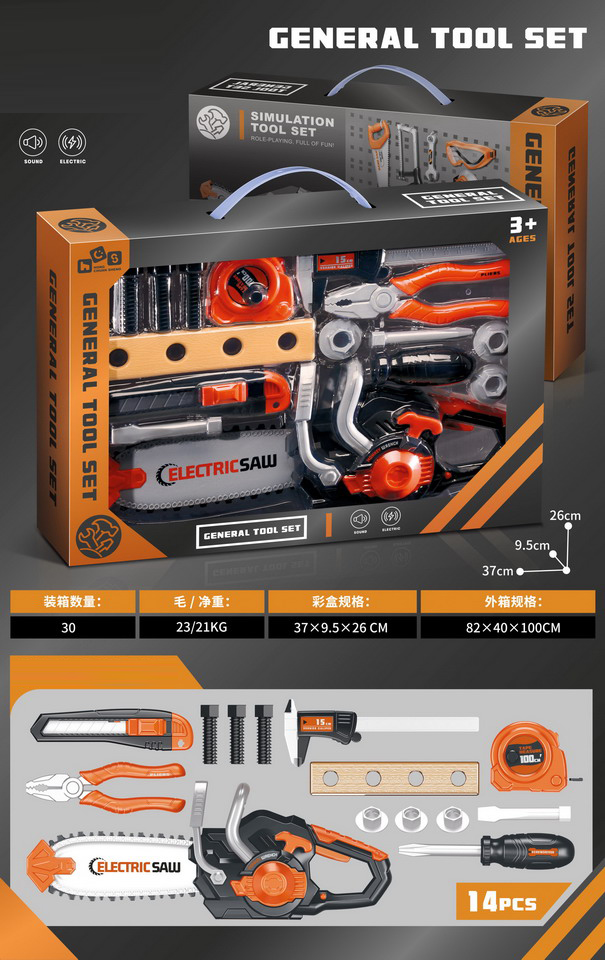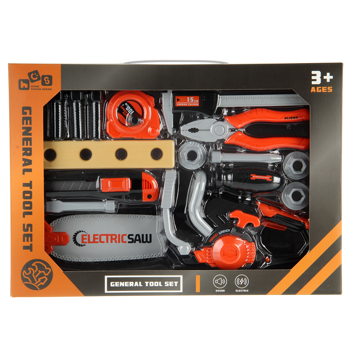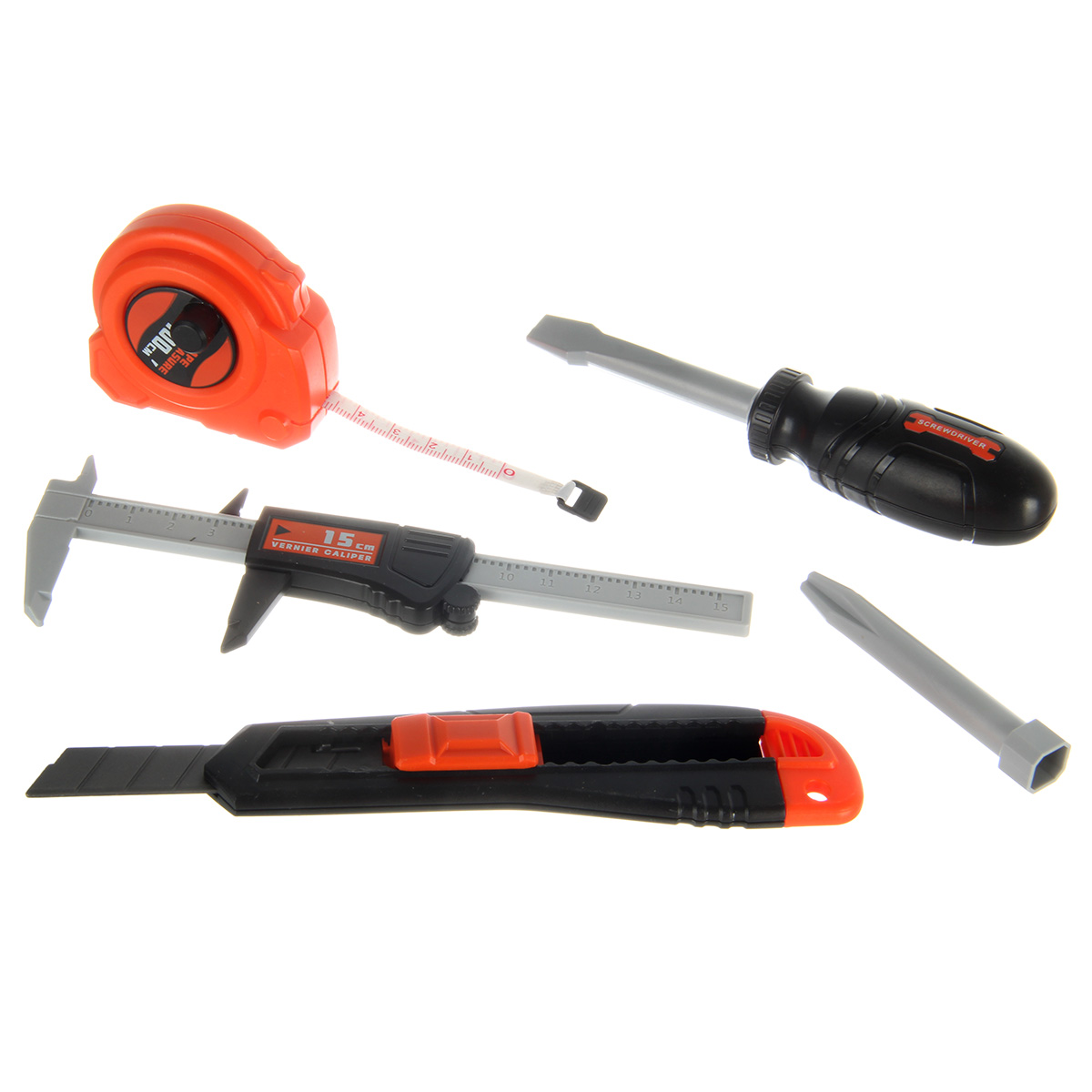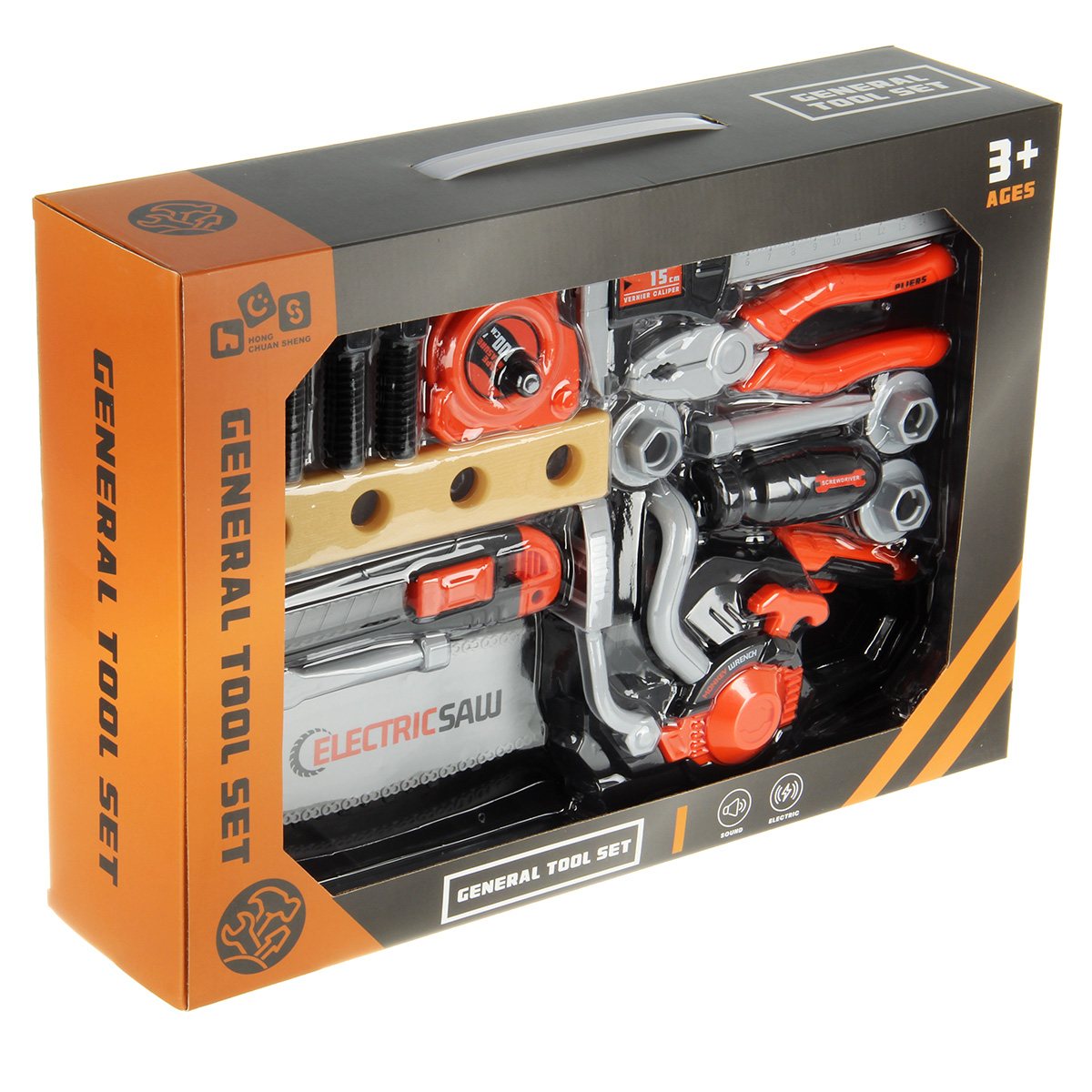 Набор игрушечных инструментов со множеством аксессуаров. Бензопила в реалистичном дизайне, издает звук работающей техники, имеет подвижную прорезиненную цепь с безопасными закругленными зубцами. Подвижные элементы инструментов, отвертка со съемными насадками, рулетка с выдвижной лентой на 100 см. Игровой набор для мальчика изготовлен из прочных и долговечных материалов, качественное исполнение, внимание к деталям.