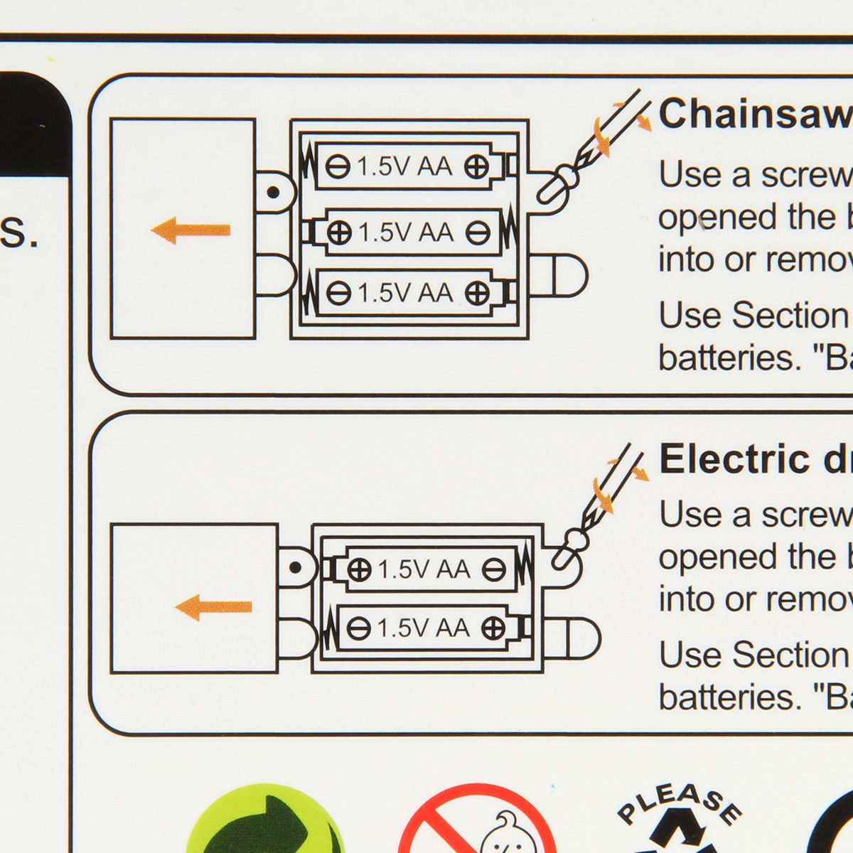 Бензопила работает от 3 батареек АА, в комплект не входят.