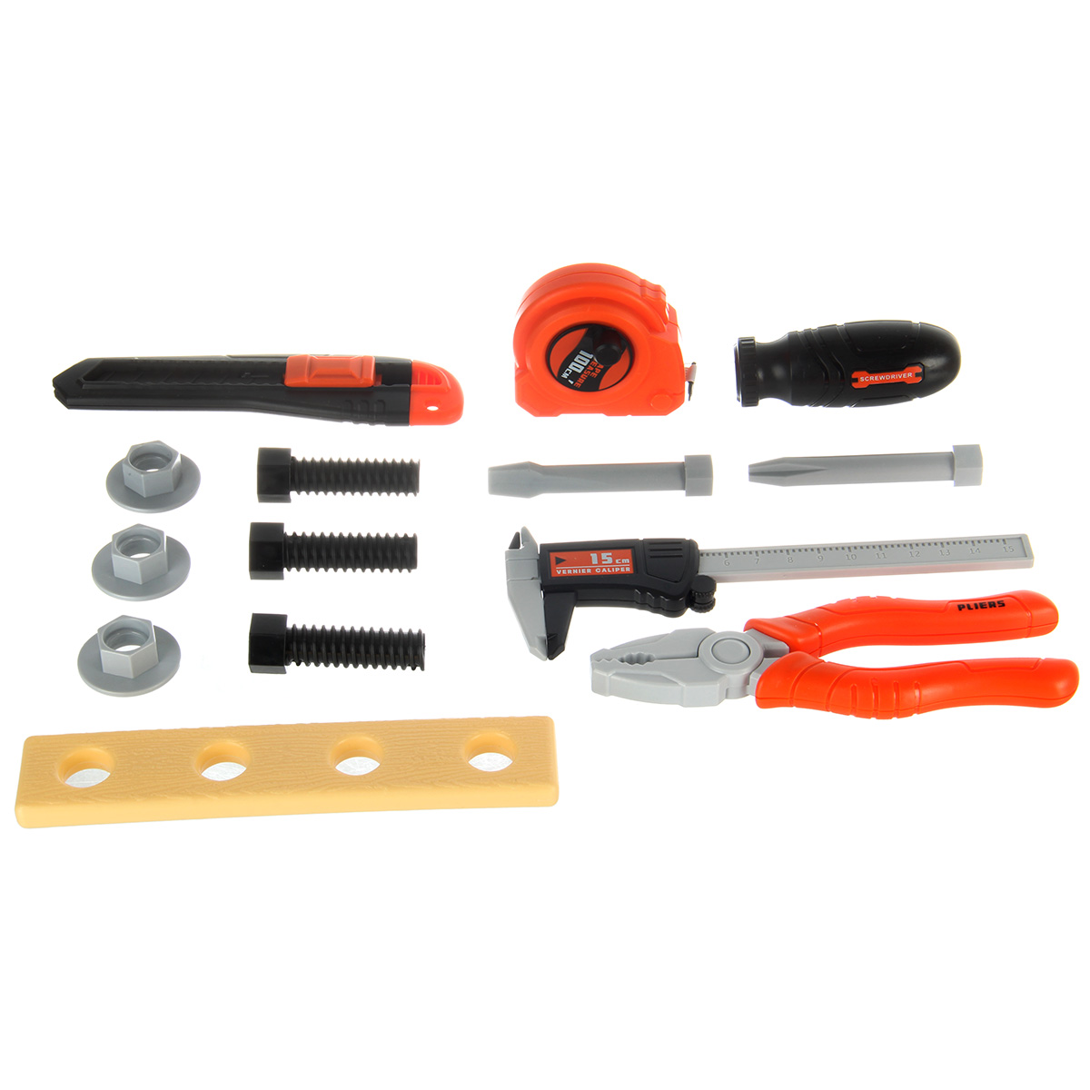 Бензопила, отвертка, крестовая насадка, насадка шлиц, пассатижи, элемент для скрутки, штангенциркуль, канцелярский нож, 3 гайки, 3 винта, строительная рулетка.