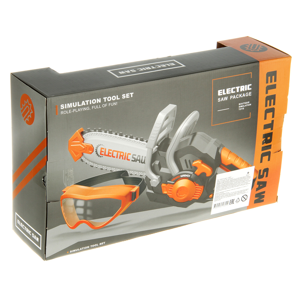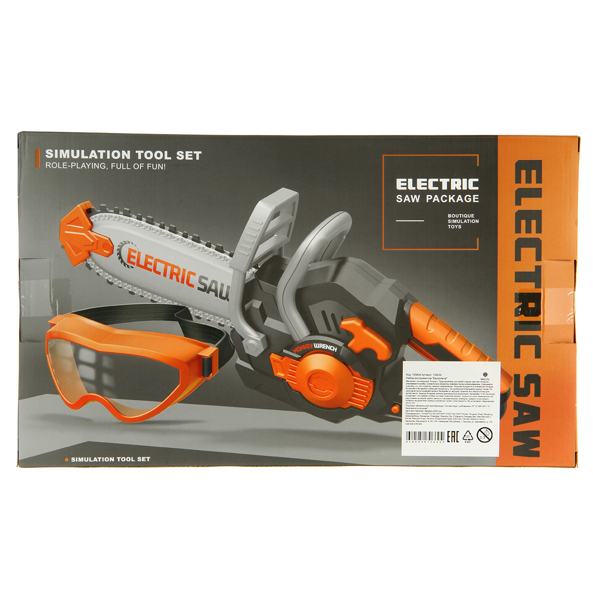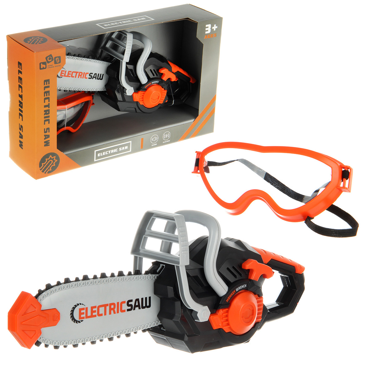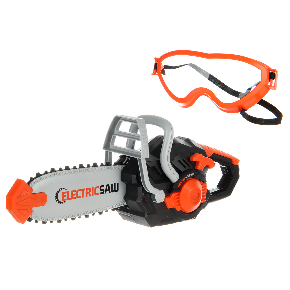 Игрушечная бензопила с подвижной цепью и звуковыми эффектами. Цепь прорезиненная, безопасные закругленные зубцы. Очки с линзой имитацией стекла, резинка растягивается, подойдут для любого размера головы. Игрушка изготовлена из прочных и долговечных материалов в качественном исполнении, оформлена в реалистичном дизайне и приятной расцветке.
