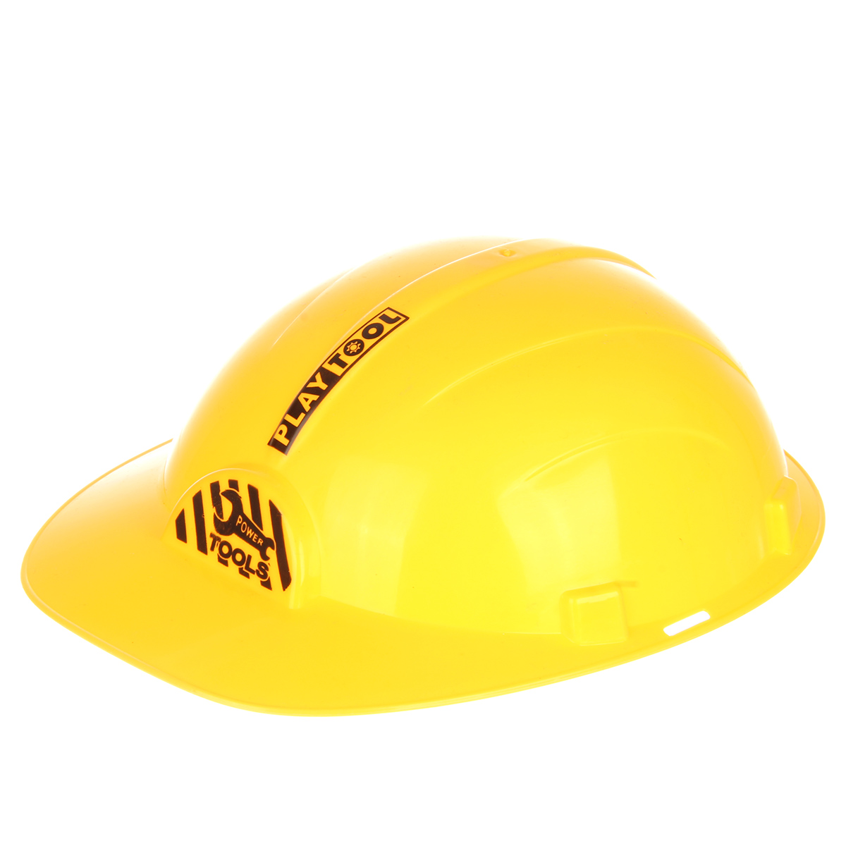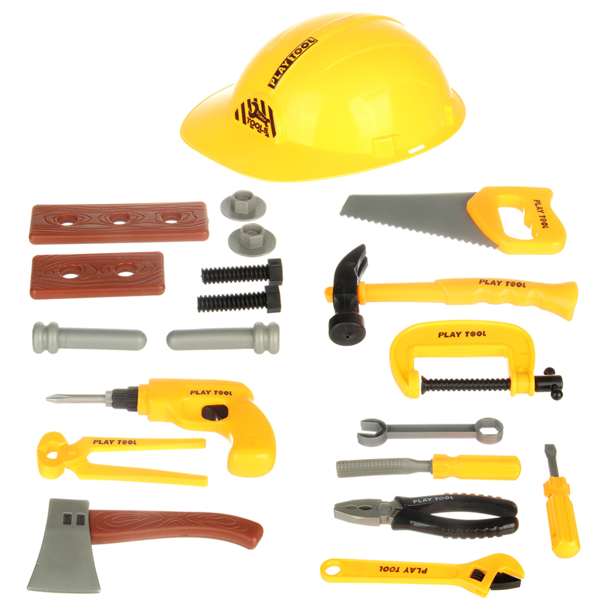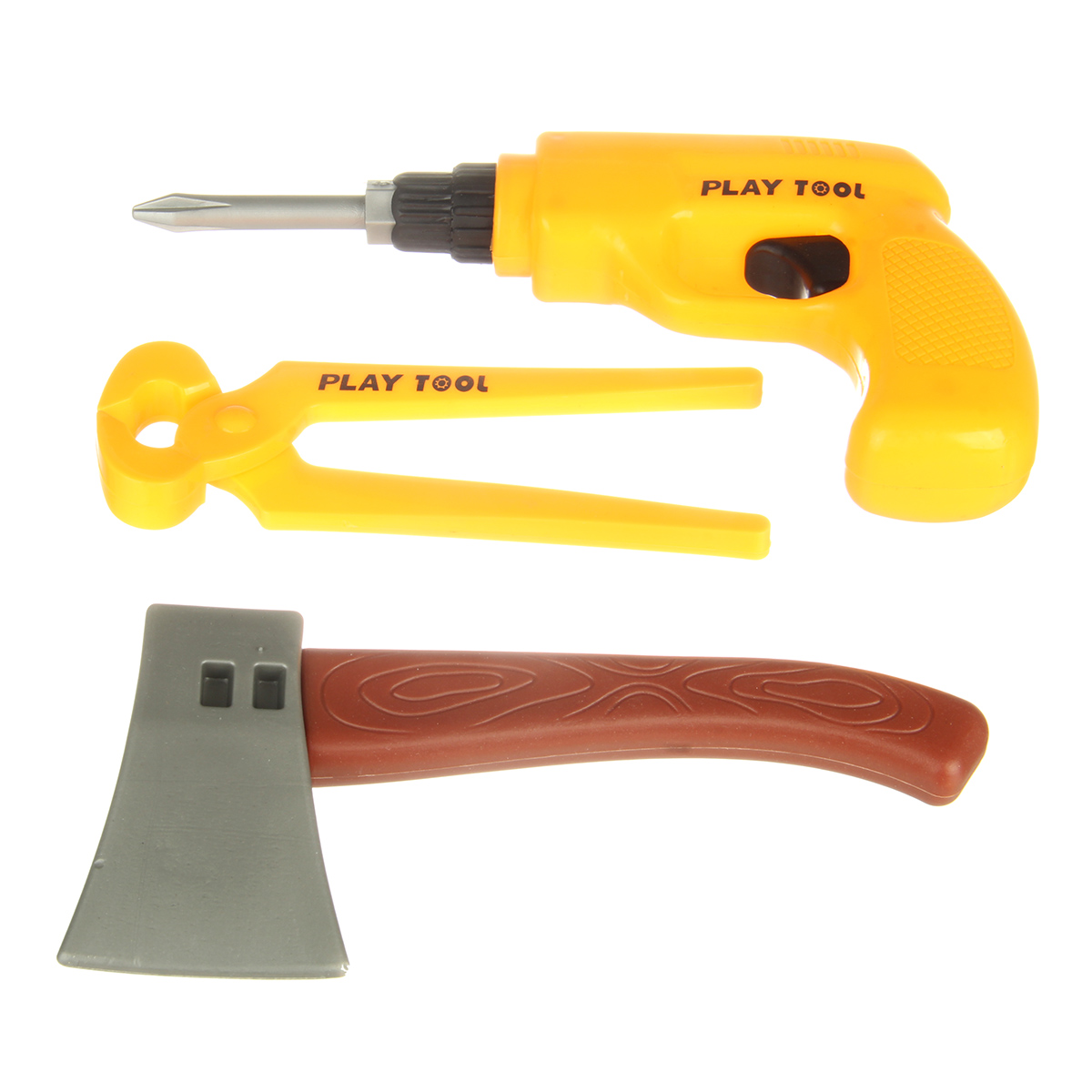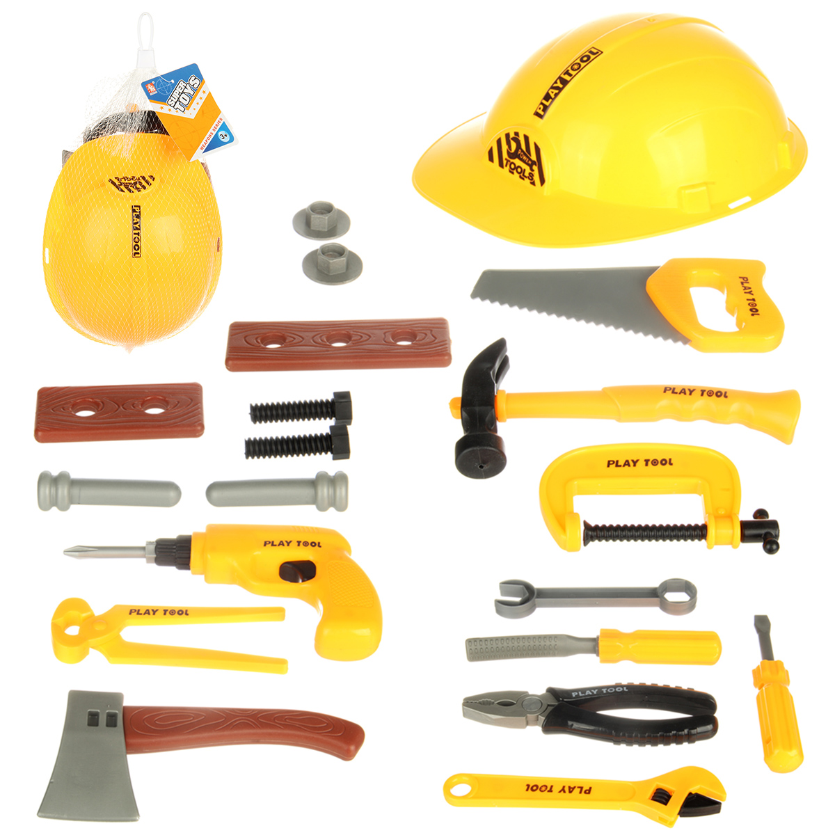 В комплекте каска, игрушка шуруповерт, игрушечная пила, топор, молоток, струбцина, разводной ключ, напильник, пассатижи, клещи, отвертка шлицевая, комбинированный ключ, 2 болта, 2 гайки, 2 элемента для скрутки, 2 гвоздя.