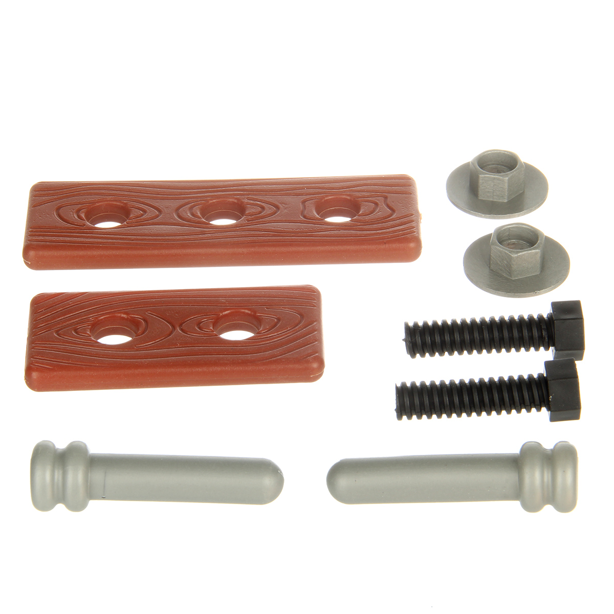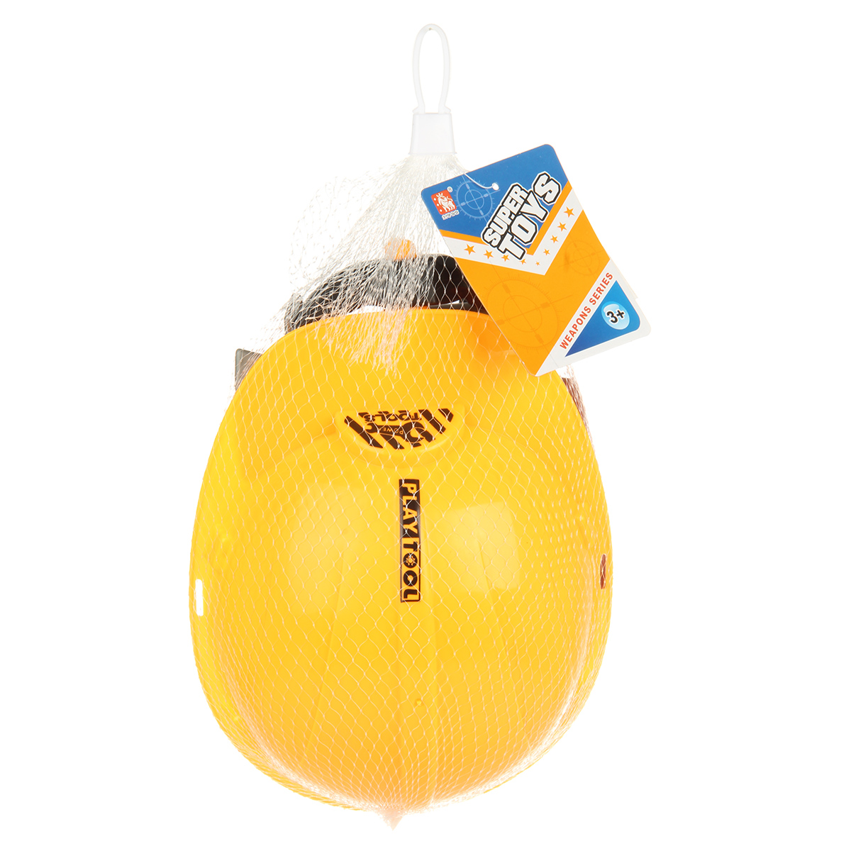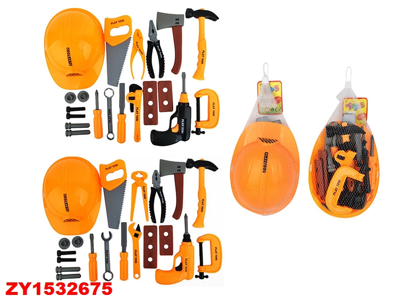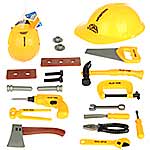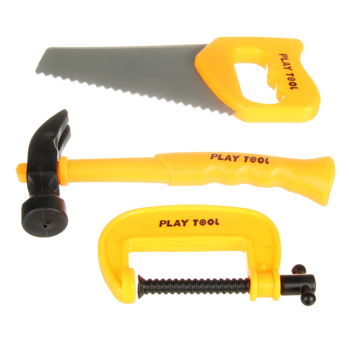 В комплекте каска, игрушка шуруповерт, игрушечная пила, топор, молоток, струбцина, разводной ключ, напильник, пассатижи, клещи, отвертка шлицевая, комбинированный ключ, 2 болта, 2 гайки, 2 элемента для скрутки, 2 гвоздя.
