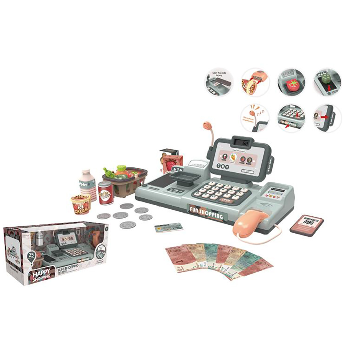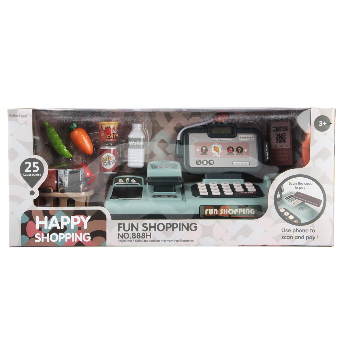 В комплект входят касса со сканером, корзина, 2 пустые коробочки-имитации вкусняшек, фигурка-имитация баночки мороженого, фигурка-имитация баночки напитка, фигурка-имитация бутылки воды, смартфон, кредитная карта, фигурки-имитации овощей (помидор, перец, морковь, горошек), бумажные банкноты и монетки.