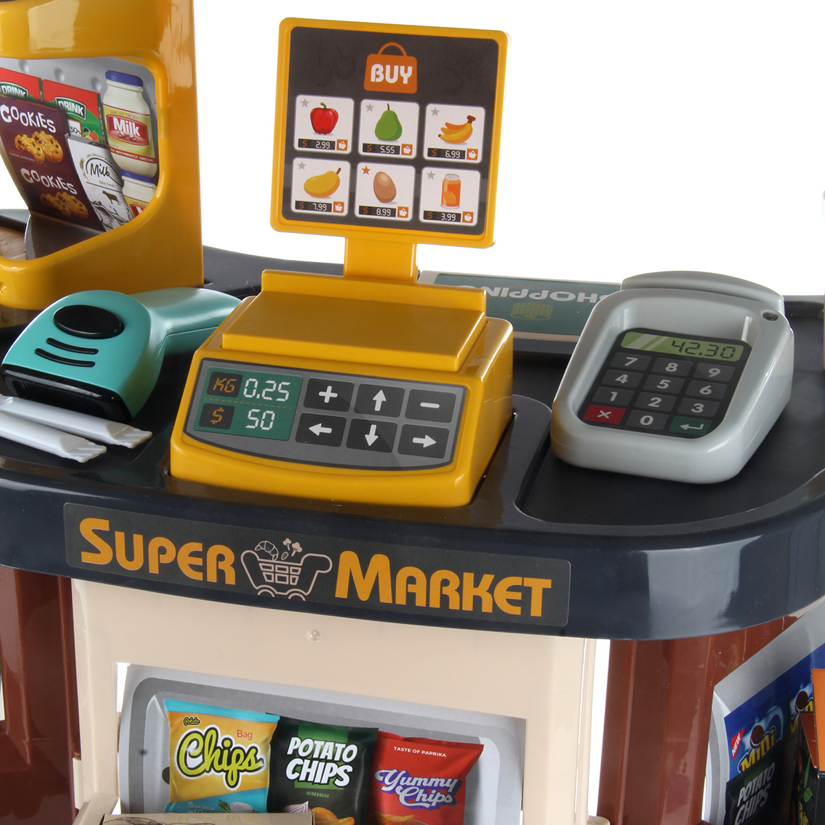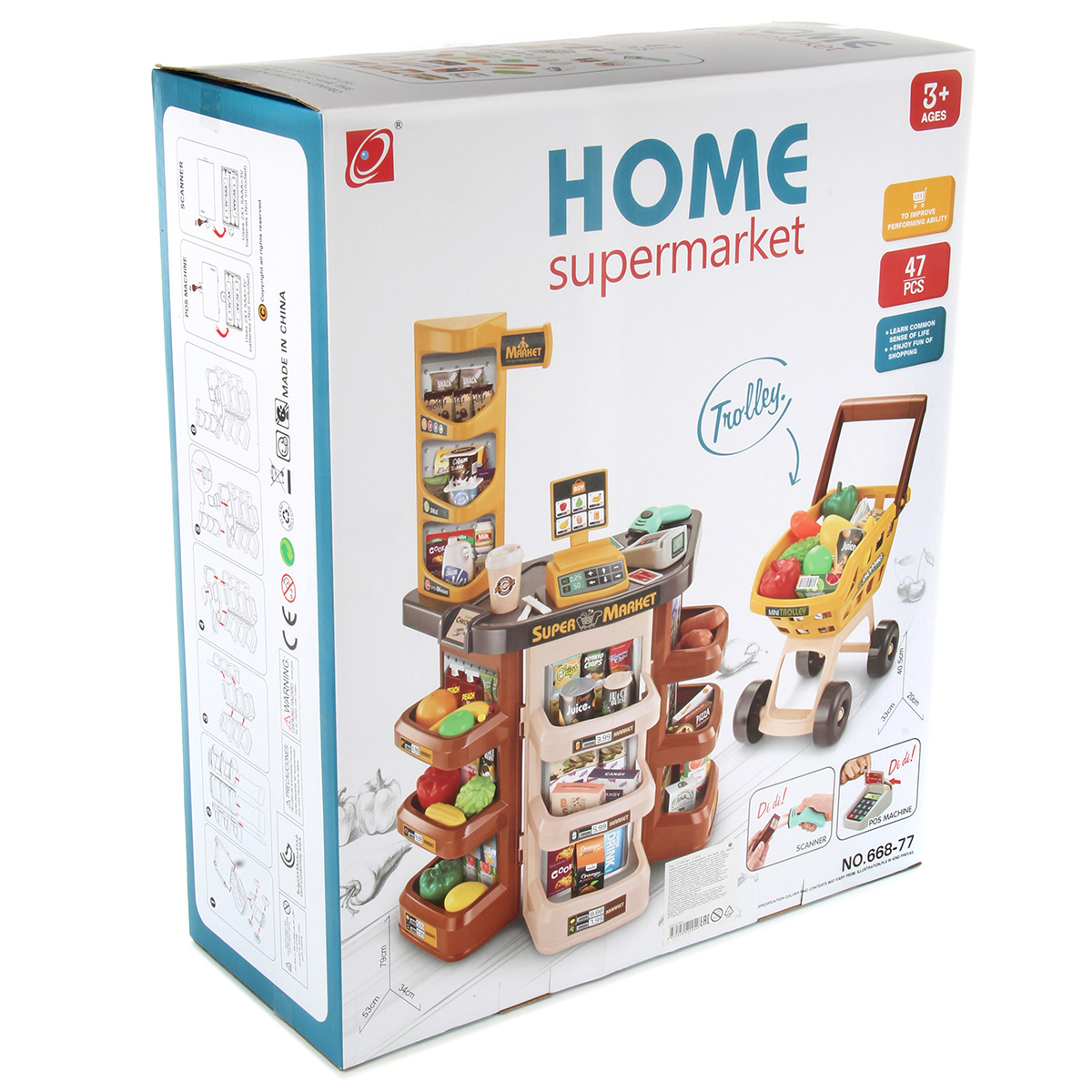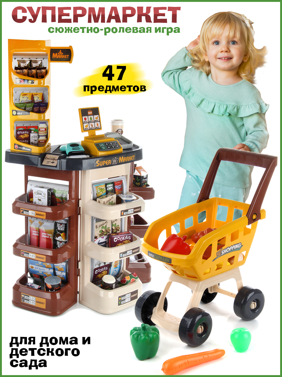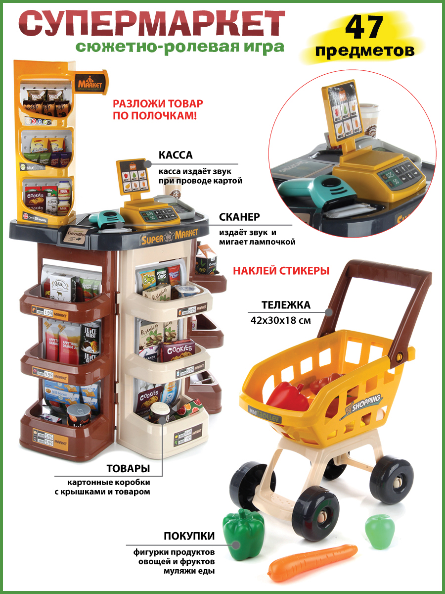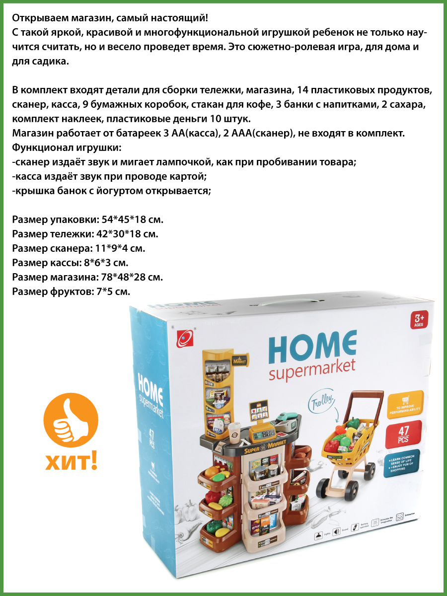 Открываем магазин, самый настоящий. С такой яркой, красивой и многофункциональной игрушкой ребенок не только научится считать, но и весело проведет время. В комплект входят детали для сборки тележки, магазина, 14 пластиковых продуктов, сканер, касса, 9 бумажных коробок, стакан для кофе, 3 банки с напитками, 2 сахара, комплект наклеек, пластиковые деньги 10 штук. Магазин работает от батареек 3 АА(касса), 2 ААА(сканер), не входят в комплект. Функционал игрушки: -сканер издаёт звук и мигает лампочкой, как при пробивании товара; -касса издаёт звук при проводе картой; -штрих код не читается; -крышка банок с йогуртом открывается; Размер упаковки: 54*18*45 см. Размер тележки: 30*18*42 см. Размер сканера: 11*9*4 см. Размер кассы: 8*6*3 см. Размер магазина: 48*28*78 см. Размер фруктов: 7*5 см. Изготовлено из пластика и картона.