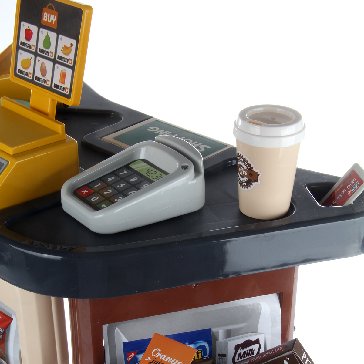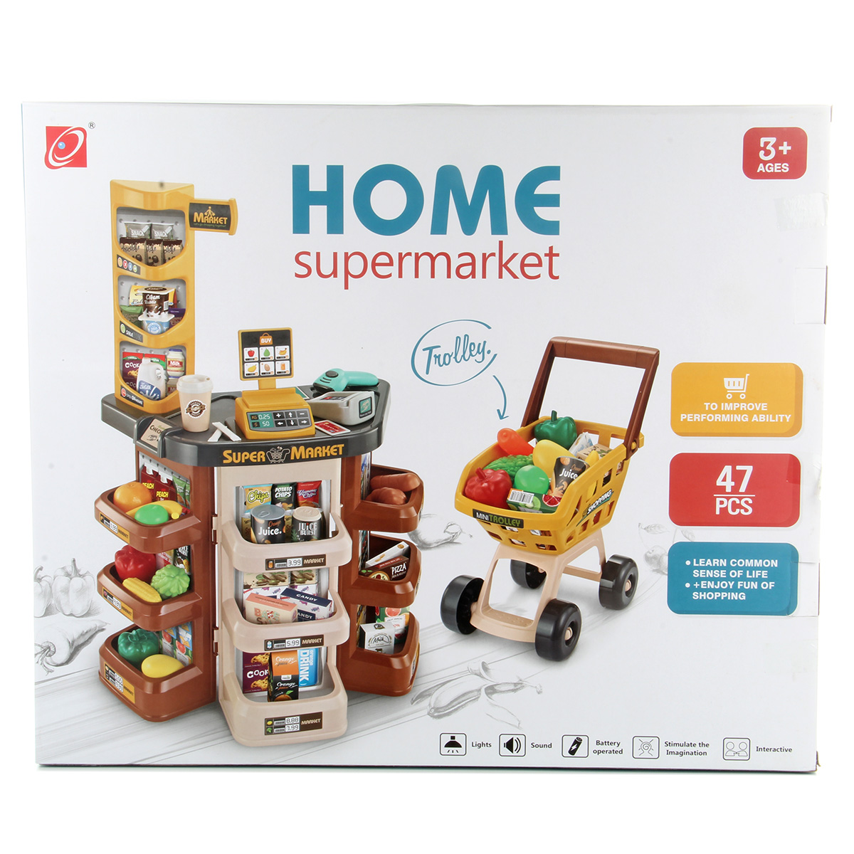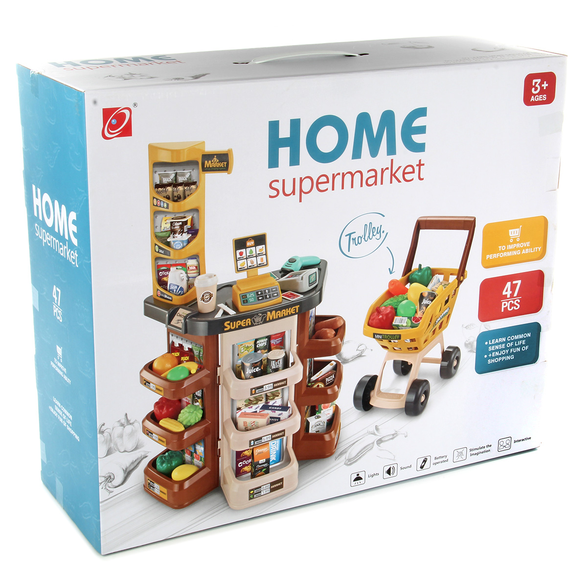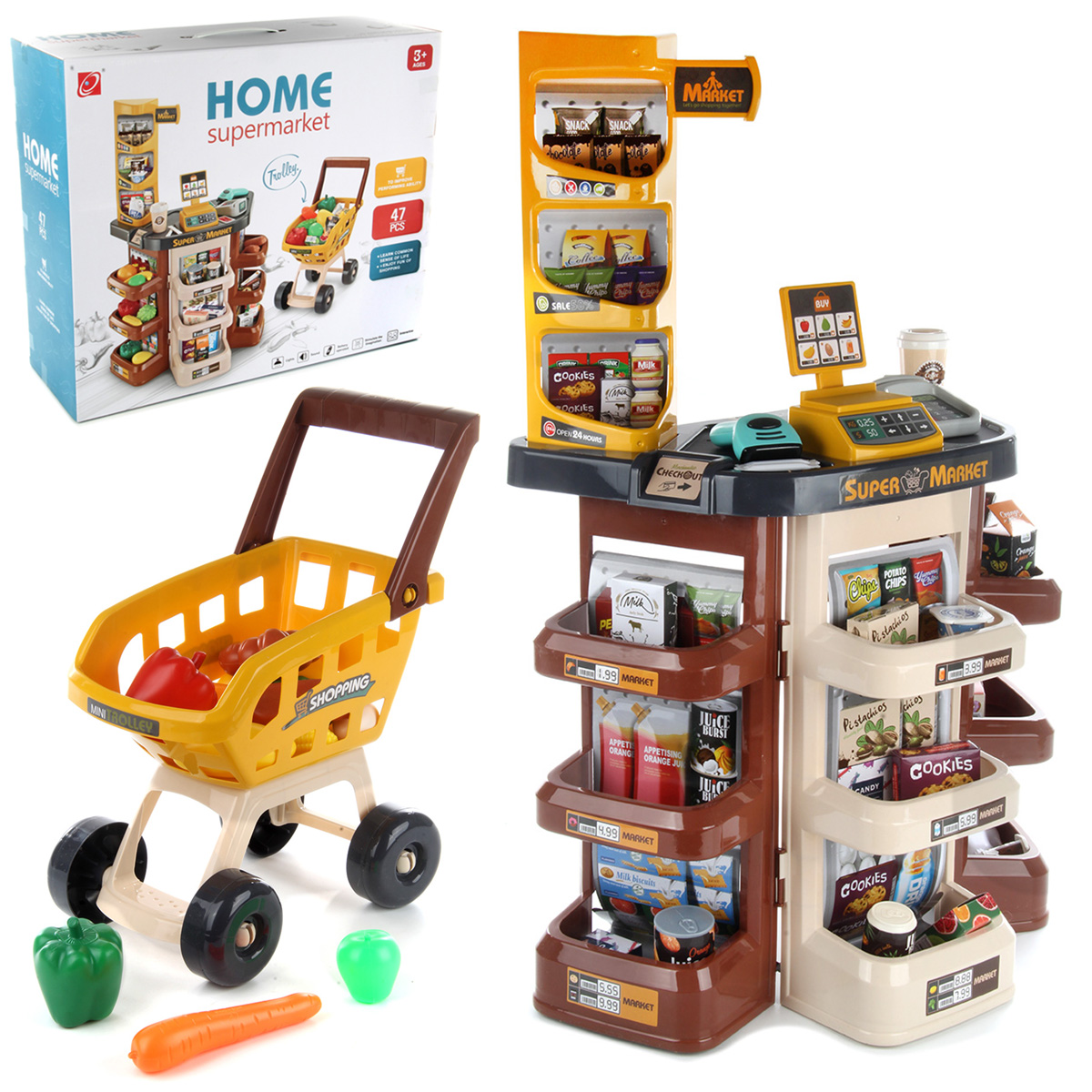 Открываем магазин, самый настоящий. С такой яркой, красивой и многофункциональной игрушкой ребенок не только научится считать, но и весело проведет время. В комплект входят детали для сборки тележки, магазина, 14 пластиковых продуктов, сканер, касса, 9 бумажных коробок, стакан для кофе, 3 банки с напитками, 2 сахара, комплект наклеек, пластиковые деньги 10 штук. Магазин работает от батареек 3 АА(касса), 2 ААА(сканер), не входят в комплект. Функционал игрушки: -сканер издаёт звук и мигает лампочкой, как при пробивании товара; -касса издаёт звук при проводе картой; -штрих код не читается; -крышка банок с йогуртом открывается; Размер упаковки: 54*18*45 см. Размер тележки: 30*18*42 см. Размер сканера: 11*9*4 см. Размер кассы: 8*6*3 см. Размер магазина: 48*28*78 см. Размер фруктов: 7*5 см. Изготовлено из пластика и картона.