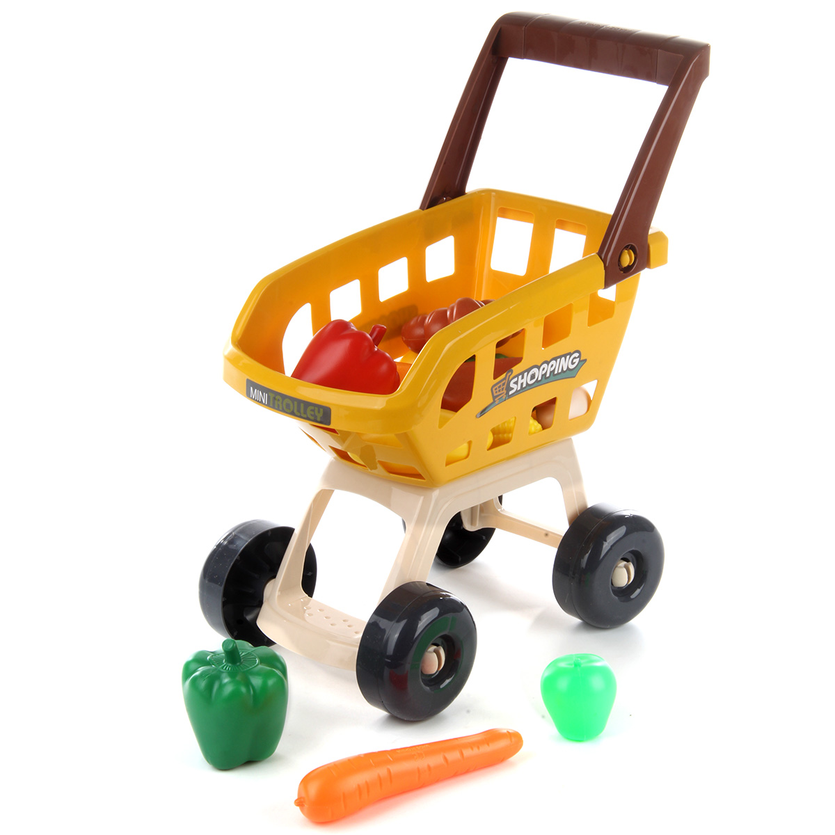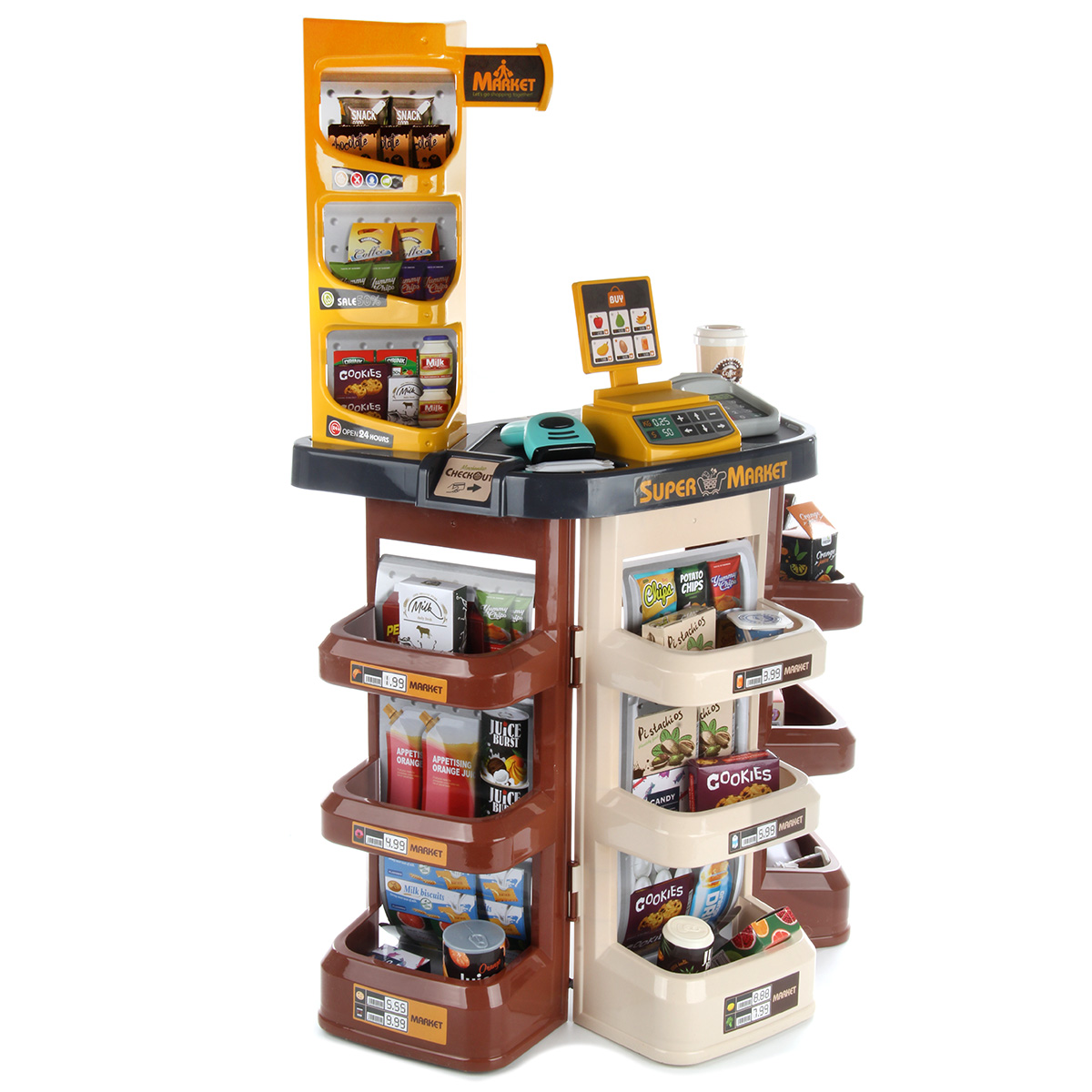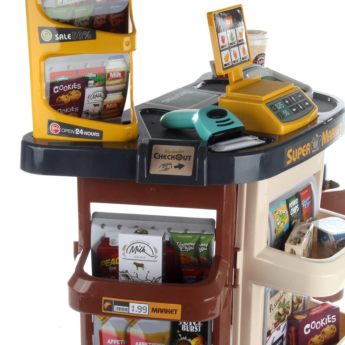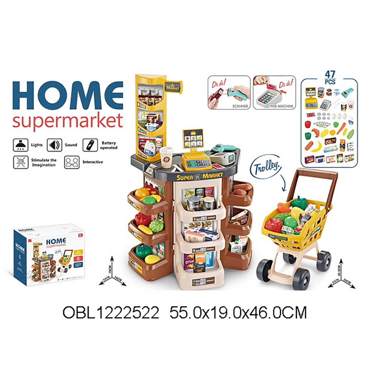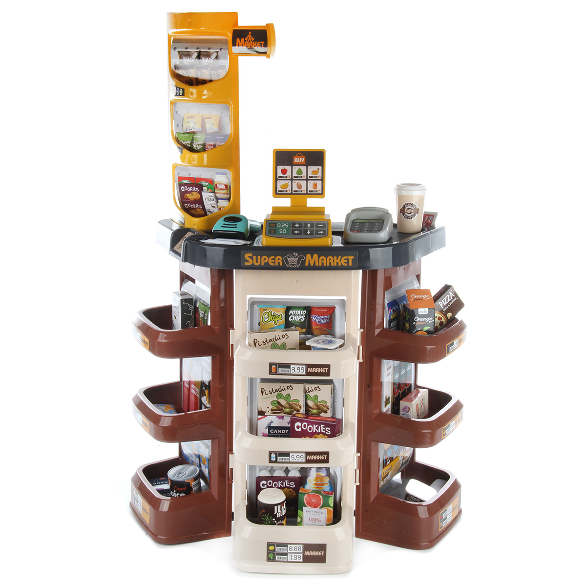 Открываем магазин, самый настоящий. С такой яркой, красивой и многофункциональной игрушкой ребенок не только научится считать, но и весело проведет время. В комплект входят детали для сборки тележки, магазина, 14 пластиковых продуктов, сканер, касса, 9 бумажных коробок, стакан для кофе, 3 банки с напитками, 2 сахара, комплект наклеек, пластиковые деньги 10 штук. Магазин работает от батареек 3 АА(касса), 2 ААА(сканер), не входят в комплект. Функционал игрушки: -сканер издаёт звук и мигает лампочкой, как при пробивании товара; -касса издаёт звук при проводе картой; -штрих код не читается; -крышка банок с йогуртом открывается; Размер упаковки: 54*18*45 см. Размер тележки: 30*18*42 см. Размер сканера: 11*9*4 см. Размер кассы: 8*6*3 см. Размер магазина: 48*28*78 см. Размер фруктов: 7*5 см. Изготовлено из пластика и картона.