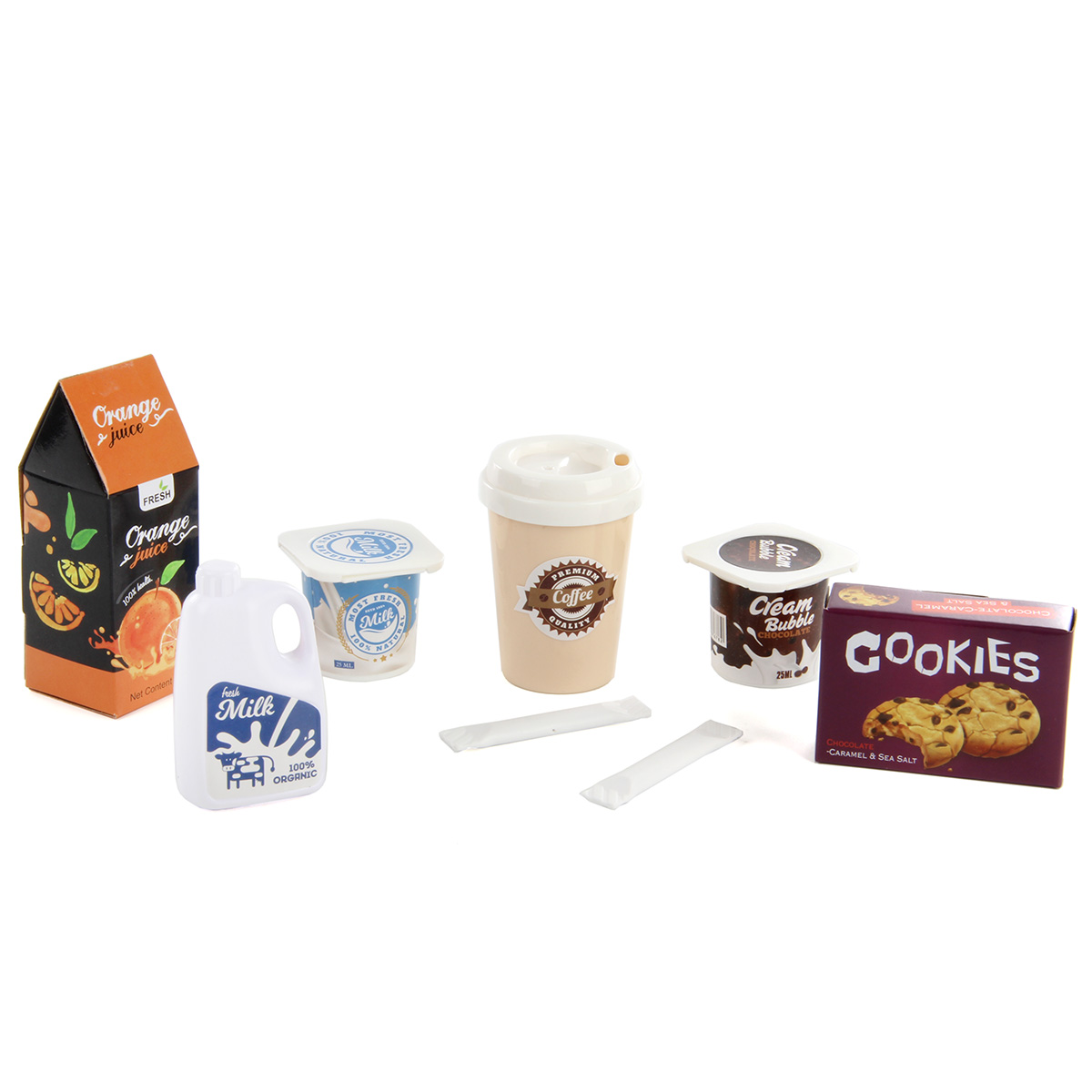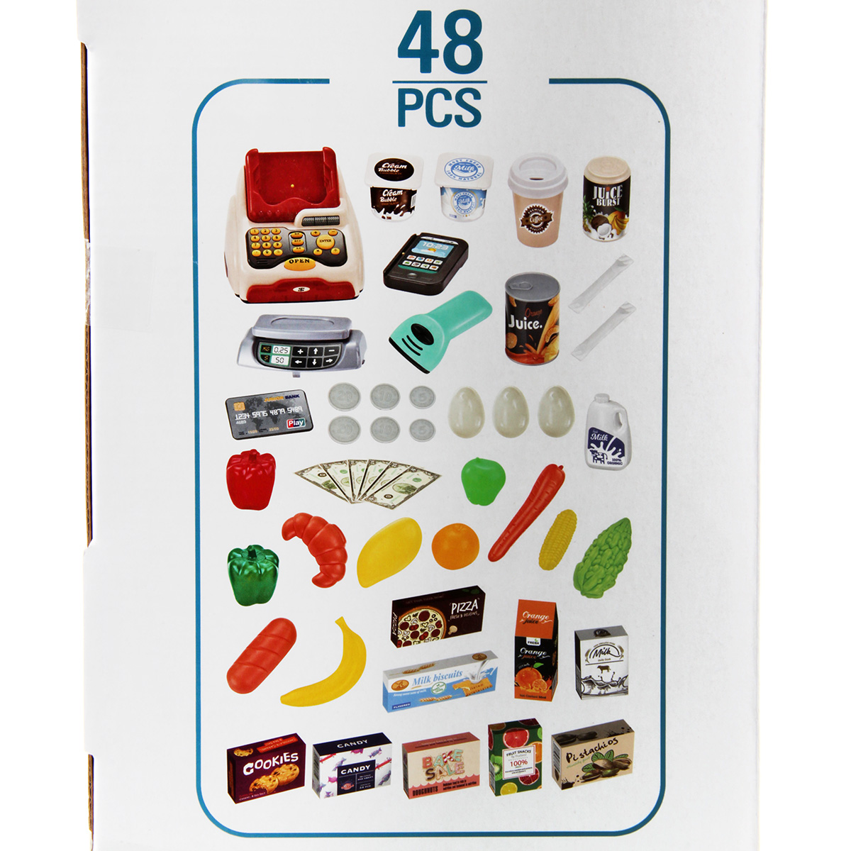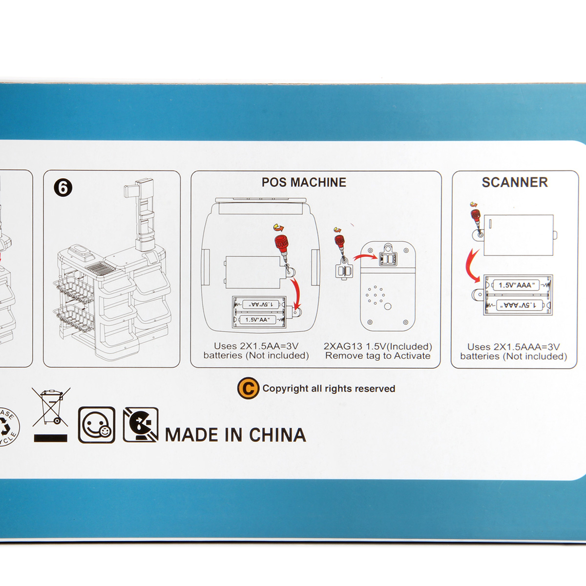 Детали для сборки детского прилавка, кассовый аппарат, сканер, банковская карта, тележка, считыватель карты, фигурки имитации еды, пустые коробочки имитации продуктов и напитков, 2 фигурки йогурта, 2 фигурки сахара, банкноты, монетки, весы, набор наклеек.