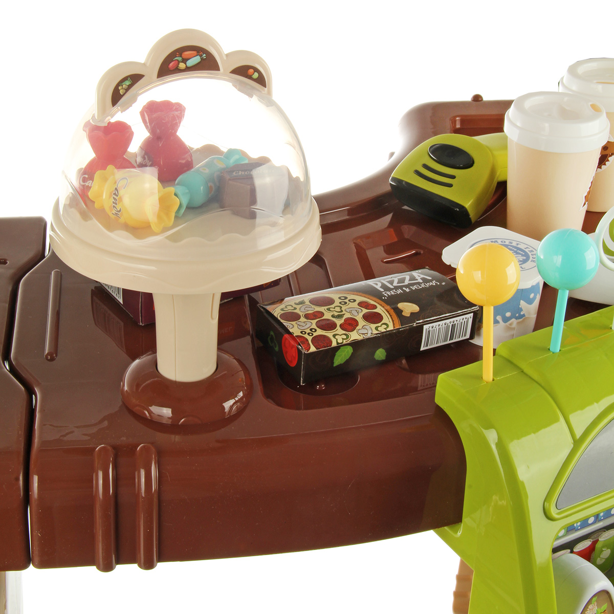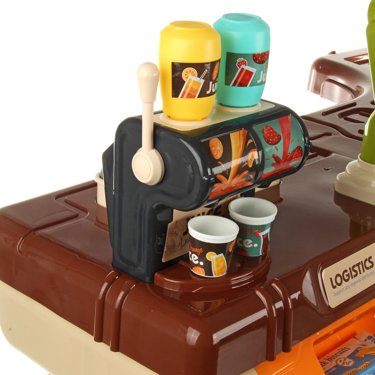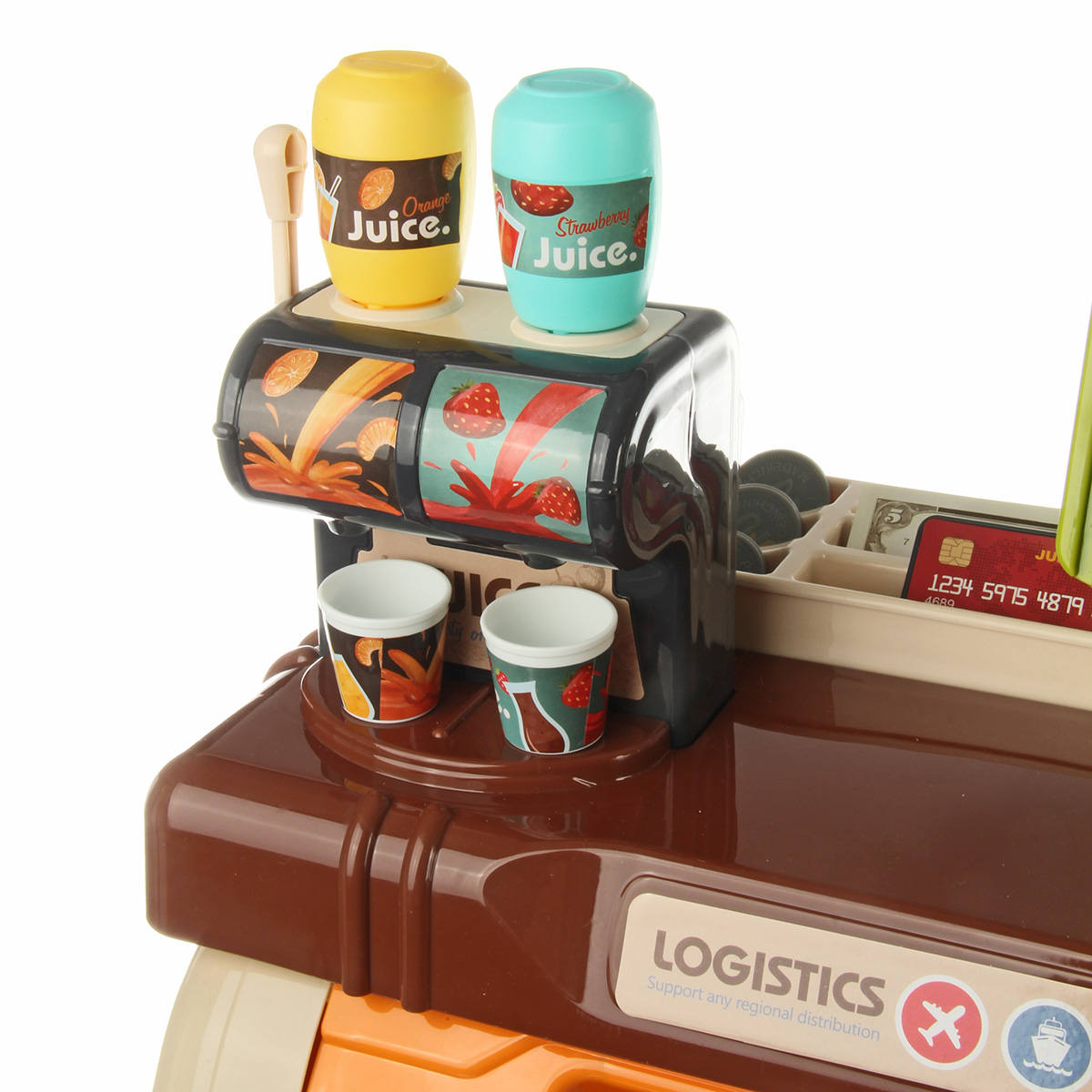 В комплекте набор наклеек, 9 пустых коробочек имитаций еды, 2 банки сока, бутылка молока, 2 фигурки йогурта, 2 чупа чупса, 2 леденца, 4 упаковки для еды, 2 пакетика сахара, круассан, батон, банкноты имитации денег, монетки имитации денег, банковская карта, 2 стакана с крышками, подставка под деньги, 2 стаканчика под сок для соковыжималки, 2 бутылки для соковыжималки, 5 фигурок конфет, игрушка сканер, детали для сборки прилавка, на котором располагаются игрушка соковыжималка, игрушка кассовый аппарат, конфетница, информационный щит с 2 вывесками, крепящийся в нижней части, информационная стойка, картонные декорации.