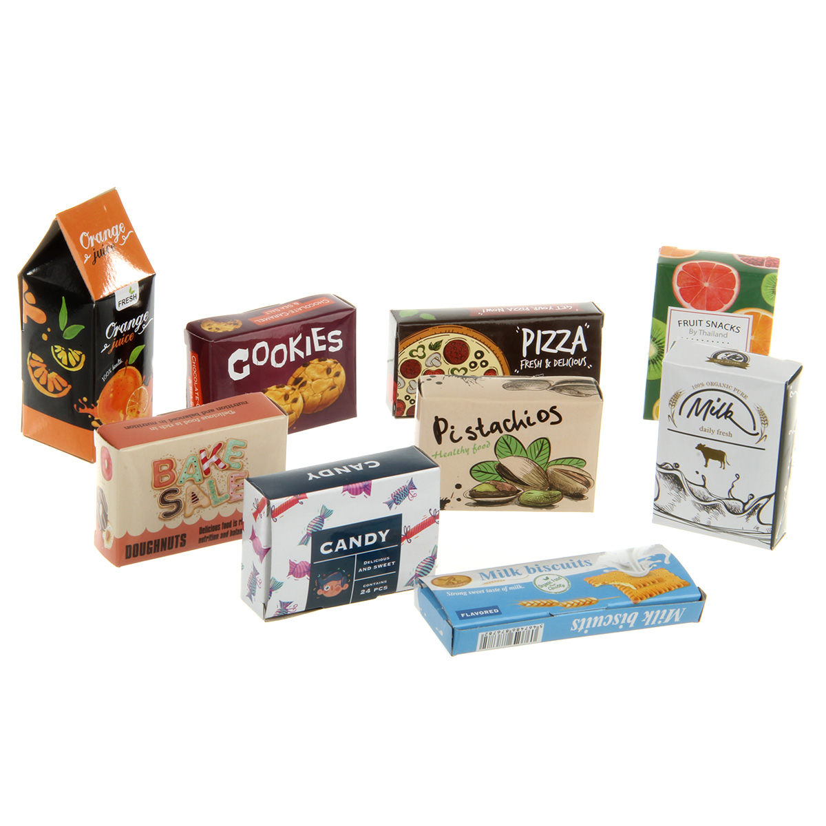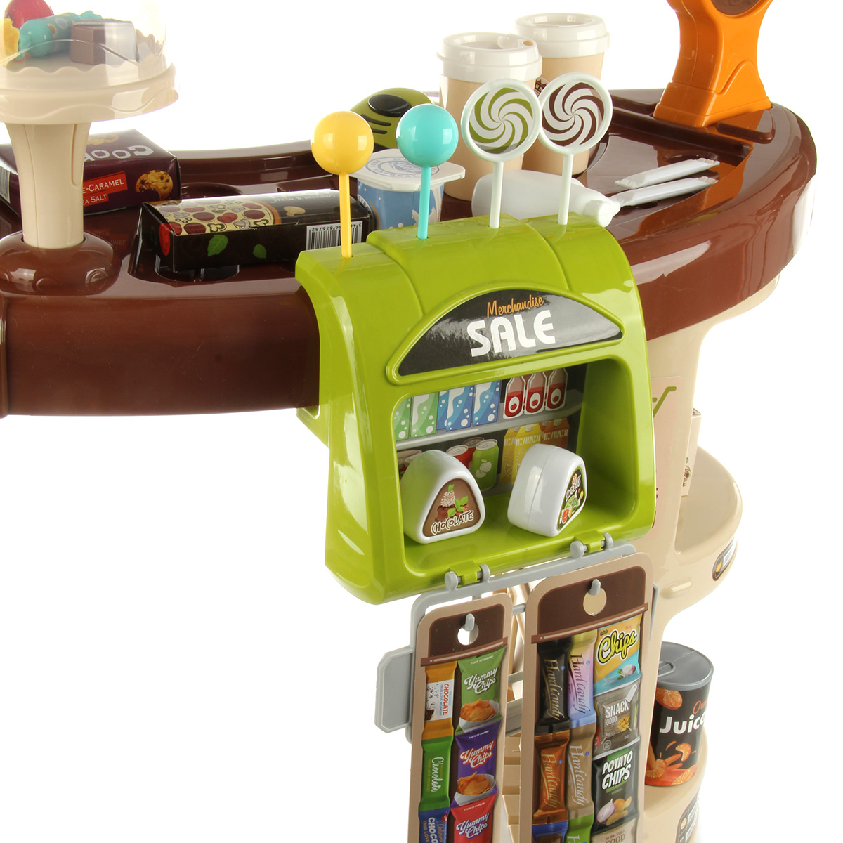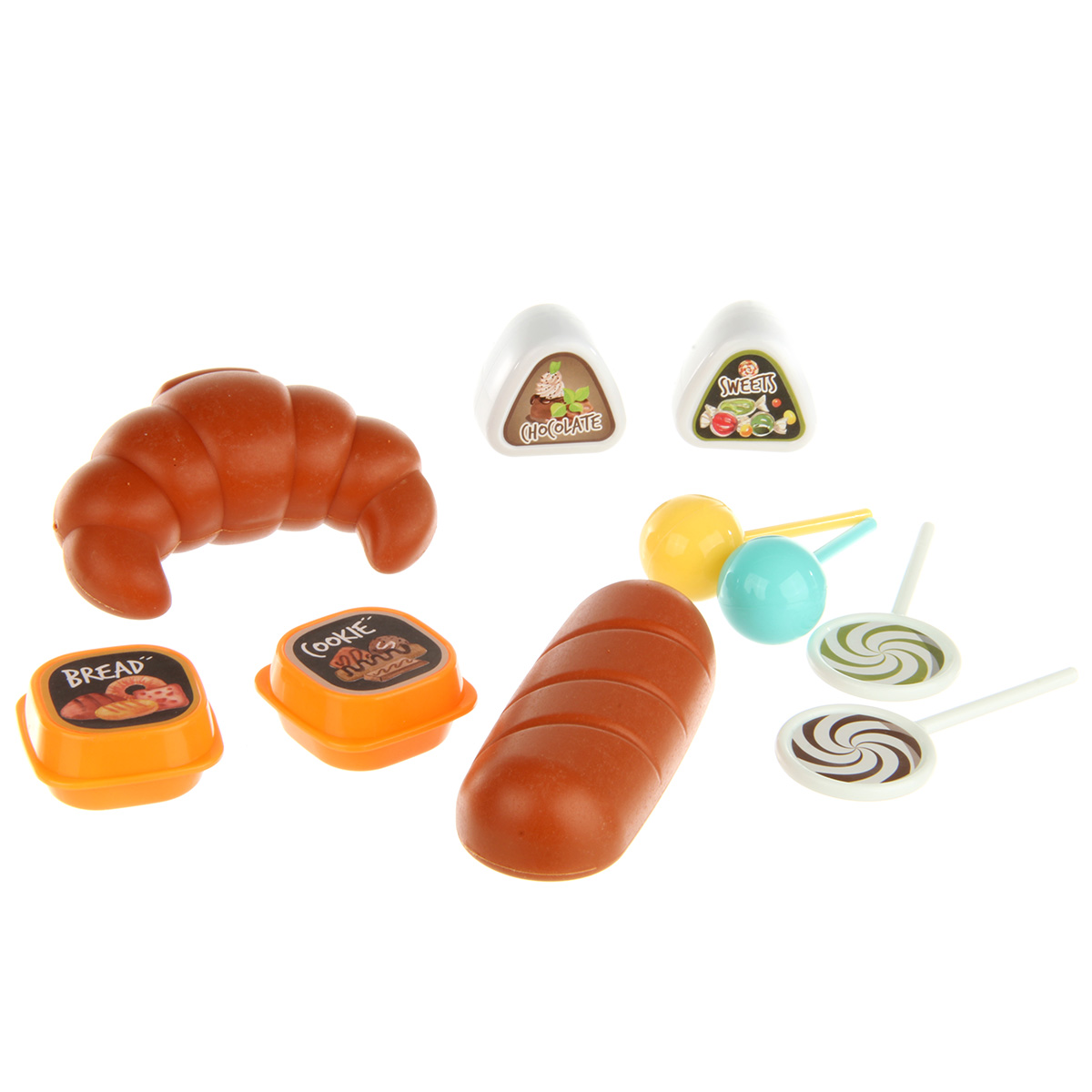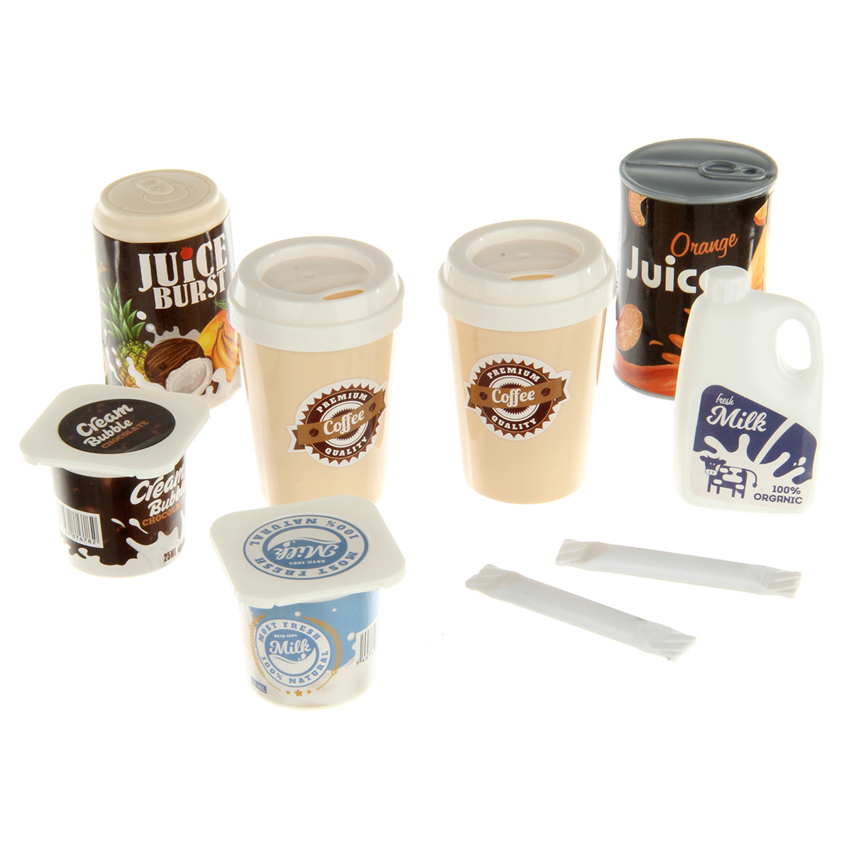 В комплекте набор наклеек, 9 пустых коробочек имитаций еды, 2 банки сока, бутылка молока, 2 фигурки йогурта, 2 чупа чупса, 2 леденца, 4 упаковки для еды, 2 пакетика сахара, круассан, батон, банкноты имитации денег, монетки имитации денег, банковская карта, 2 стакана с крышками, подставка под деньги, 2 стаканчика под сок для соковыжималки, 2 бутылки для соковыжималки, 5 фигурок конфет, игрушка сканер, детали для сборки прилавка, на котором располагаются игрушка соковыжималка, игрушка кассовый аппарат, конфетница, информационный щит с 2 вывесками, крепящийся в нижней части, информационная стойка, картонные декорации.