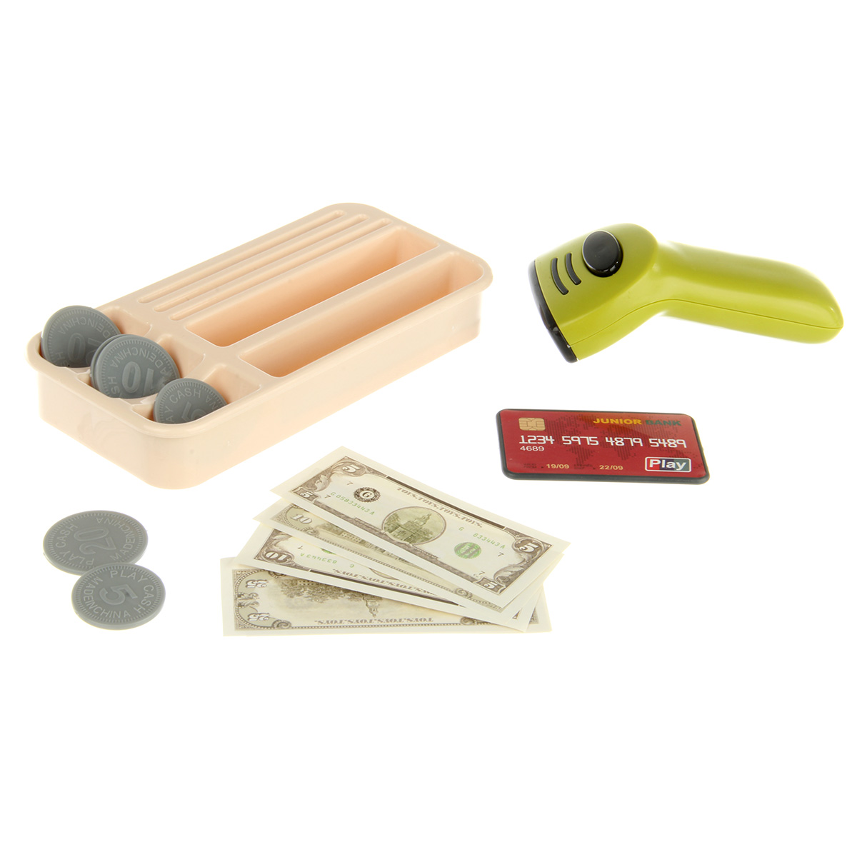Функционал кассового аппарата. Крутится зеленый корпус на 360 градусов, нажимается большая кнопка калькулятора, издает писк, подсвечивается красным лампочка в левом нижнем углу. При проведении картой по считывателю издает характерный писк, подсвечивается красным лампочка в левом нижнем углу.