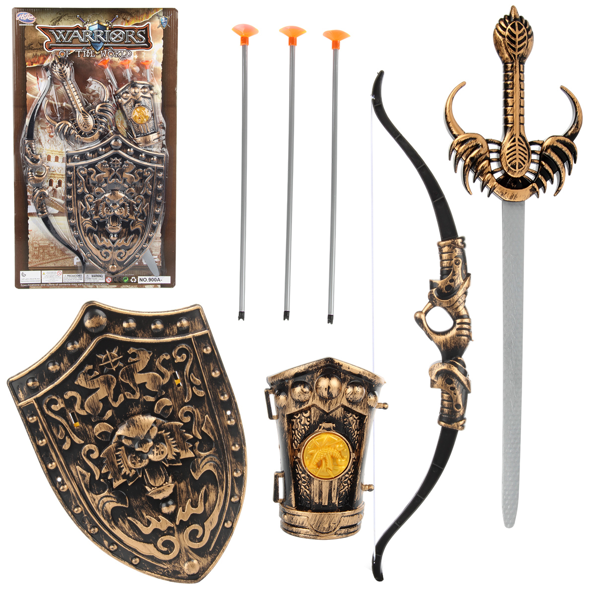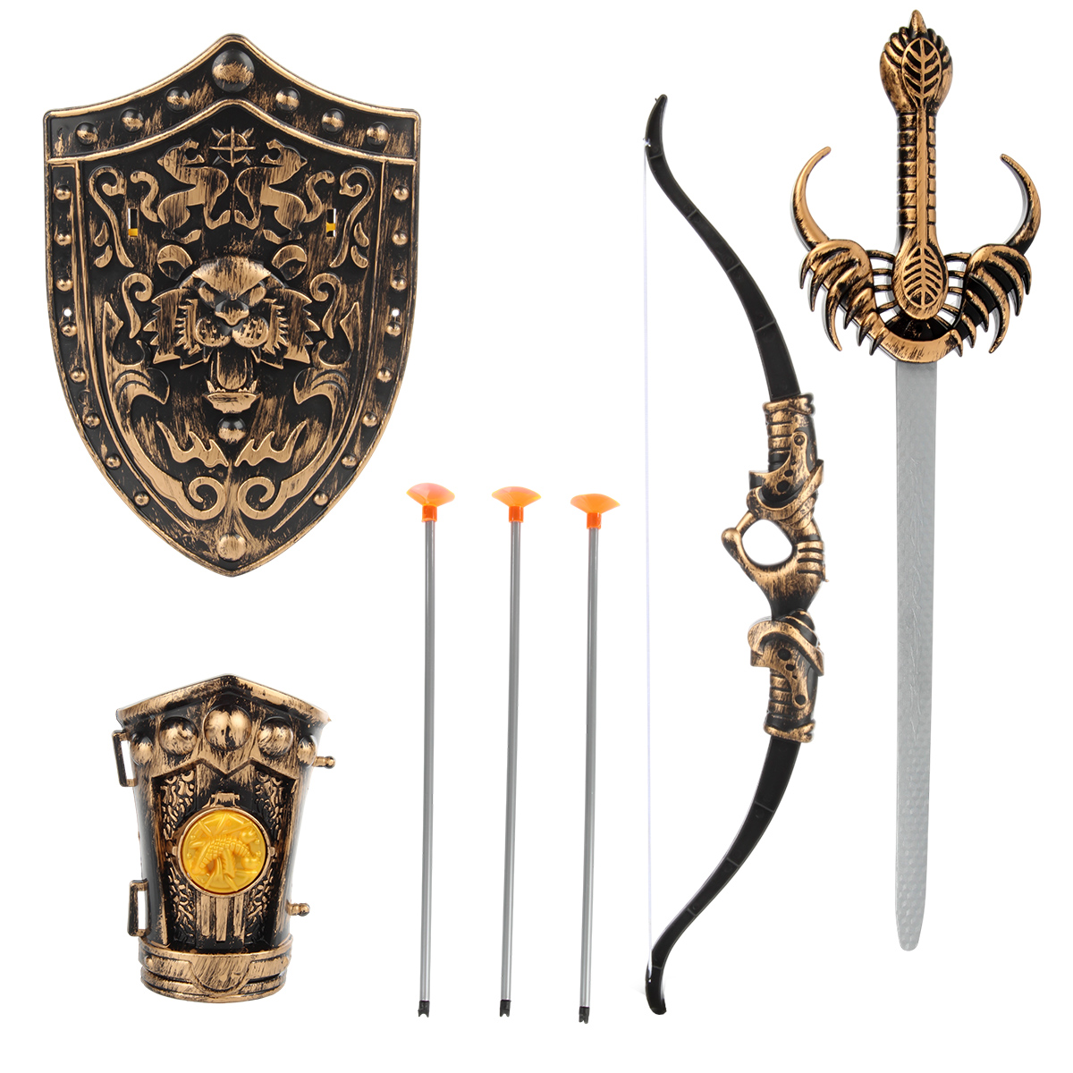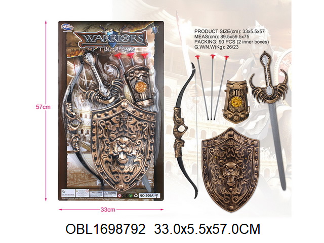 В комплекте детские щит и меч, нарукавник, игрушечный лук с 3 стрелами.