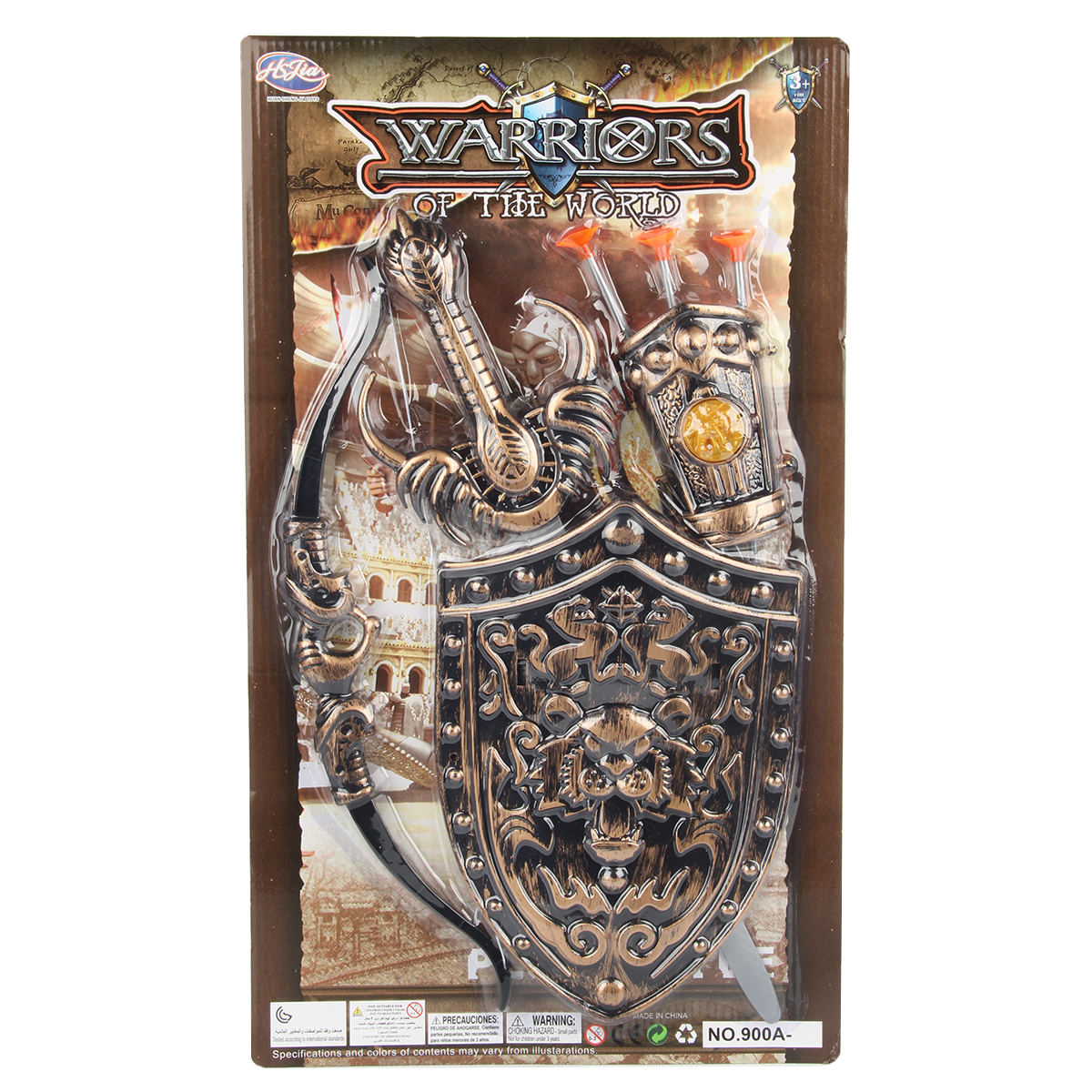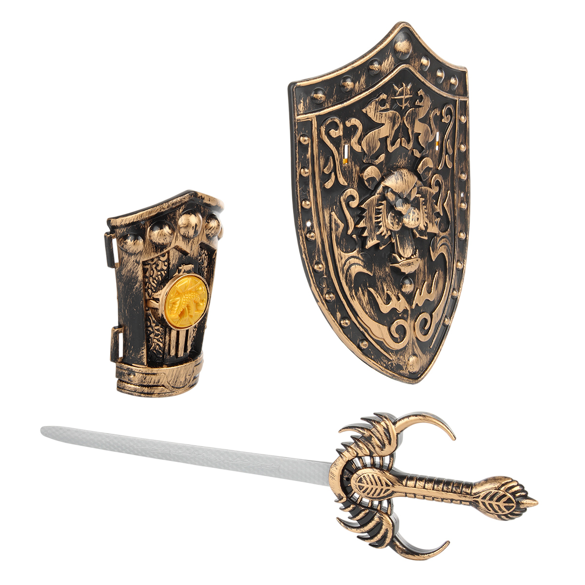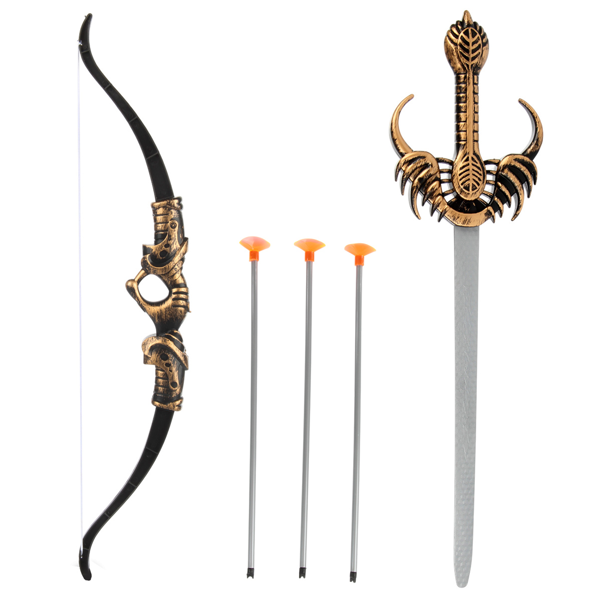 В комплекте детские щит и меч, нарукавник, игрушечный лук с 3 стрелами.