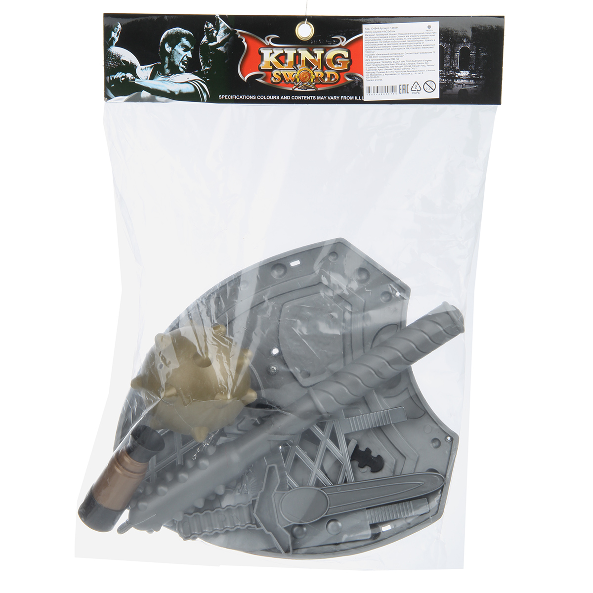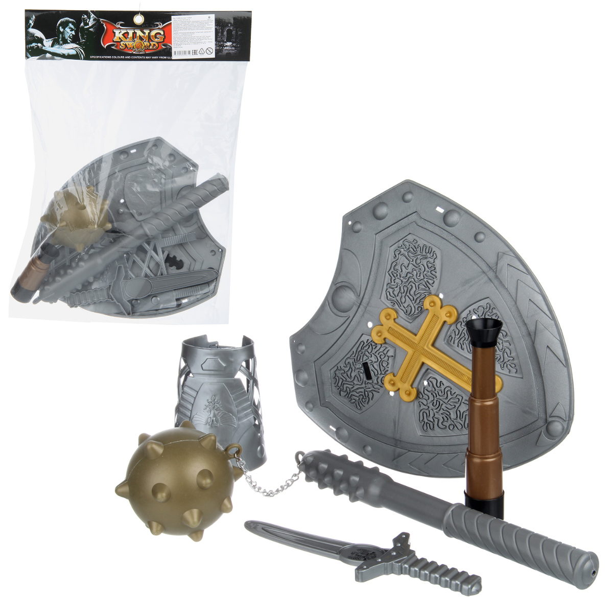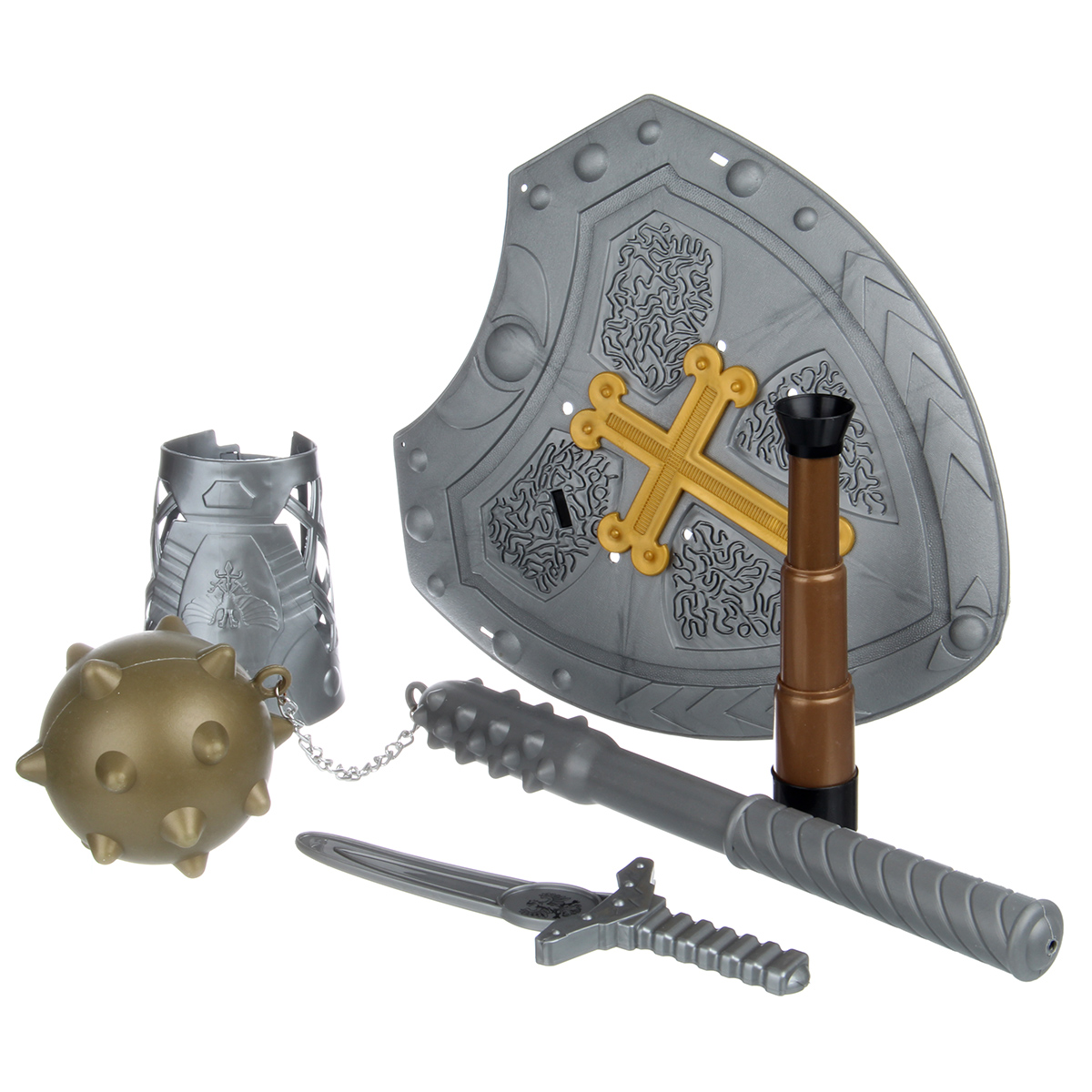 Игровой набор рыцаря для увлекательных сюжетных игр. Игрушечное оружие изготовлено из прочных и долговечных материалов, имеет безопасные закругленные углы. Военная игрушка оформлена в стилизованном дизайне и приятной расцветке. В комплекте игрового набора щит, подзорная труба, меч, латы, булава. С обратной стороны игрушечного щита есть ремешок, можно закрепить на руке. Игрушечные латы крепятся с помощью ремешков, можно регулировать внутренний обхват тела. Подзорная труба выдвигается. 5 предметов. Полимер. Размер лат в раскрытом виде 27х11 см. Размер щита 25х29х2 см. Размер подзорной трубы в выдвинутом виде 3х17х3 см. Размер меча 7х1х22 см. Размер булавы 10х10х33 см. Размер упаковки 32х10х43 см.