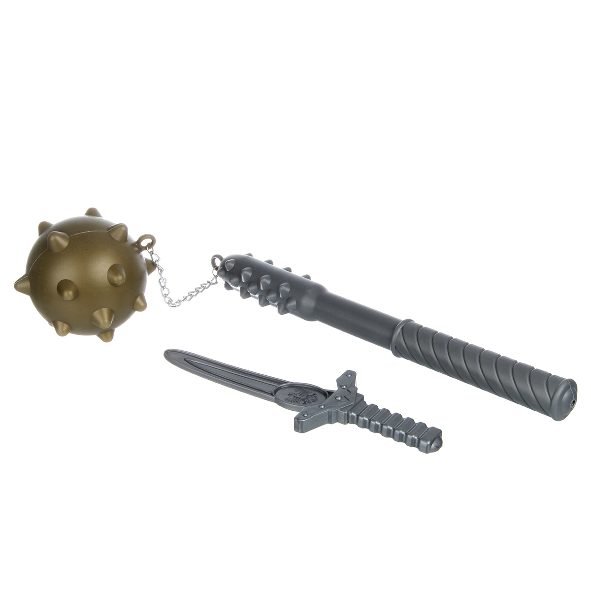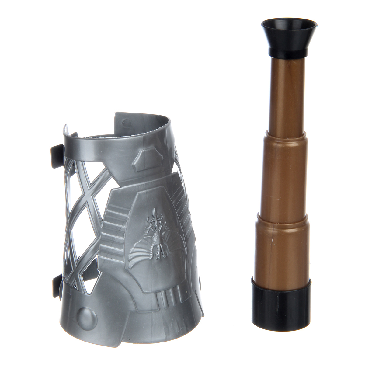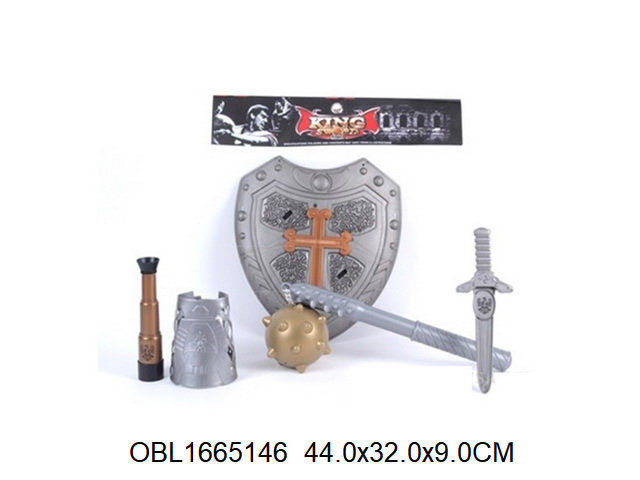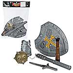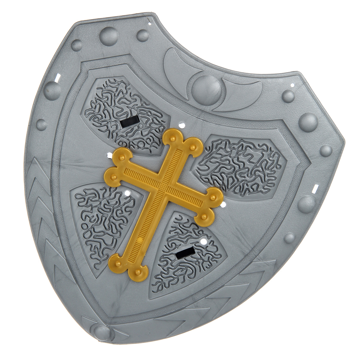 Игровой набор рыцаря для увлекательных сюжетных игр. Игрушечное оружие изготовлено из прочных и долговечных материалов, имеет безопасные закругленные углы. Военная игрушка оформлена в стилизованном дизайне и приятной расцветке. В комплекте игрового набора щит, подзорная труба, меч, латы, булава. С обратной стороны игрушечного щита есть ремешок, можно закрепить на руке. Игрушечные латы крепятся с помощью ремешков, можно регулировать внутренний обхват тела. Подзорная труба выдвигается. 5 предметов. Полимер. Размер лат в раскрытом виде 27х11 см. Размер щита 25х29х2 см. Размер подзорной трубы в выдвинутом виде 3х17х3 см. Размер меча 7х1х22 см. Размер булавы 10х10х33 см. Размер упаковки 32х10х43 см.