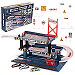 Ставим машинку в начало трассы, подталкиваем, машинка катится по стрелкам автотрека. 2 пути, машинка докатиться до конца автотрека и выкатится с трамплина, либо передвинем шлагбаум на втором этаже парковки, машинка заедет туда.