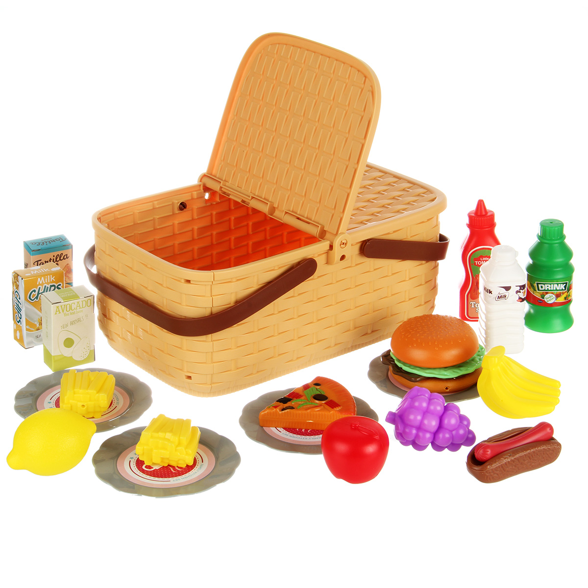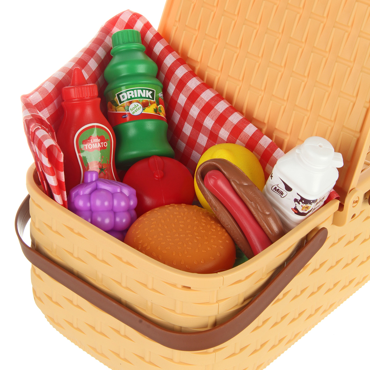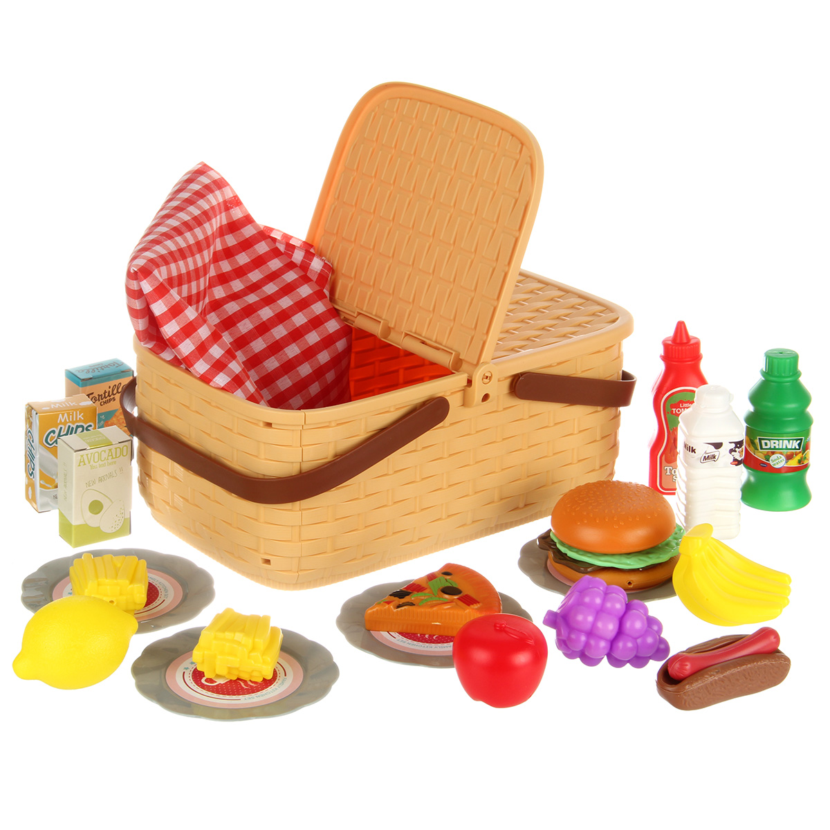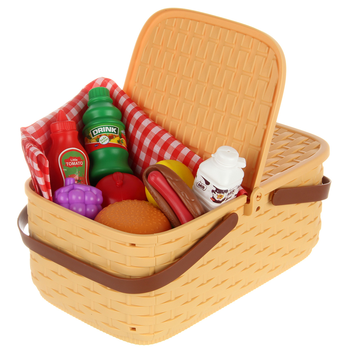 Упаковка корзинка, скатерть, 4 тарелки, 2 бутылки имитации напитков, 1 бутылка имитации кетчупа, 3 коробки имитации сыпучих продуктов, 12 продуктов.